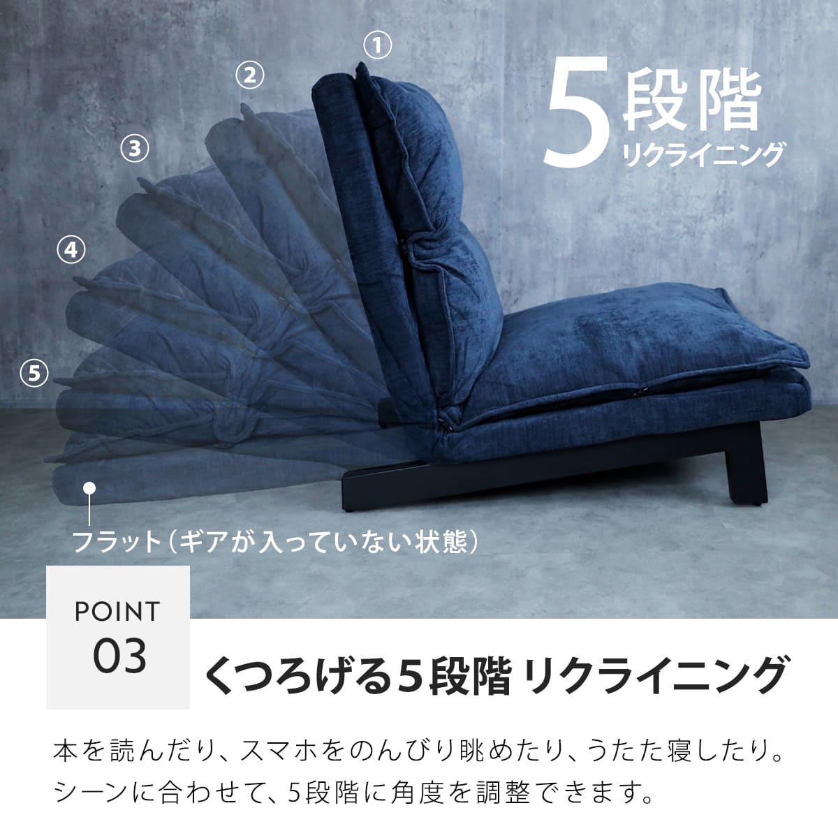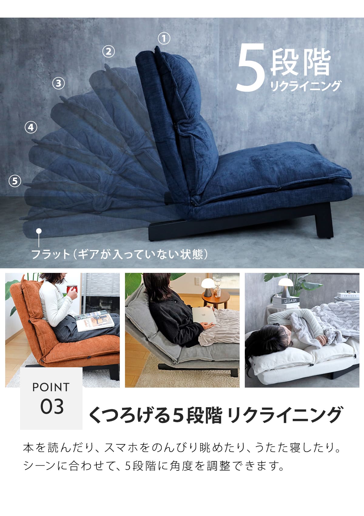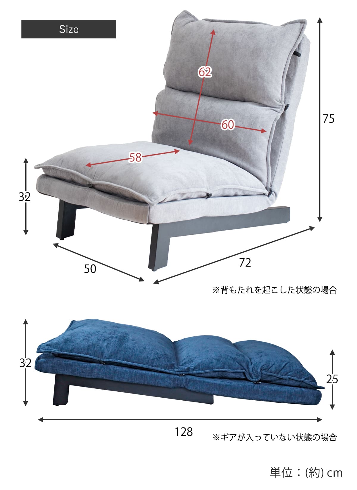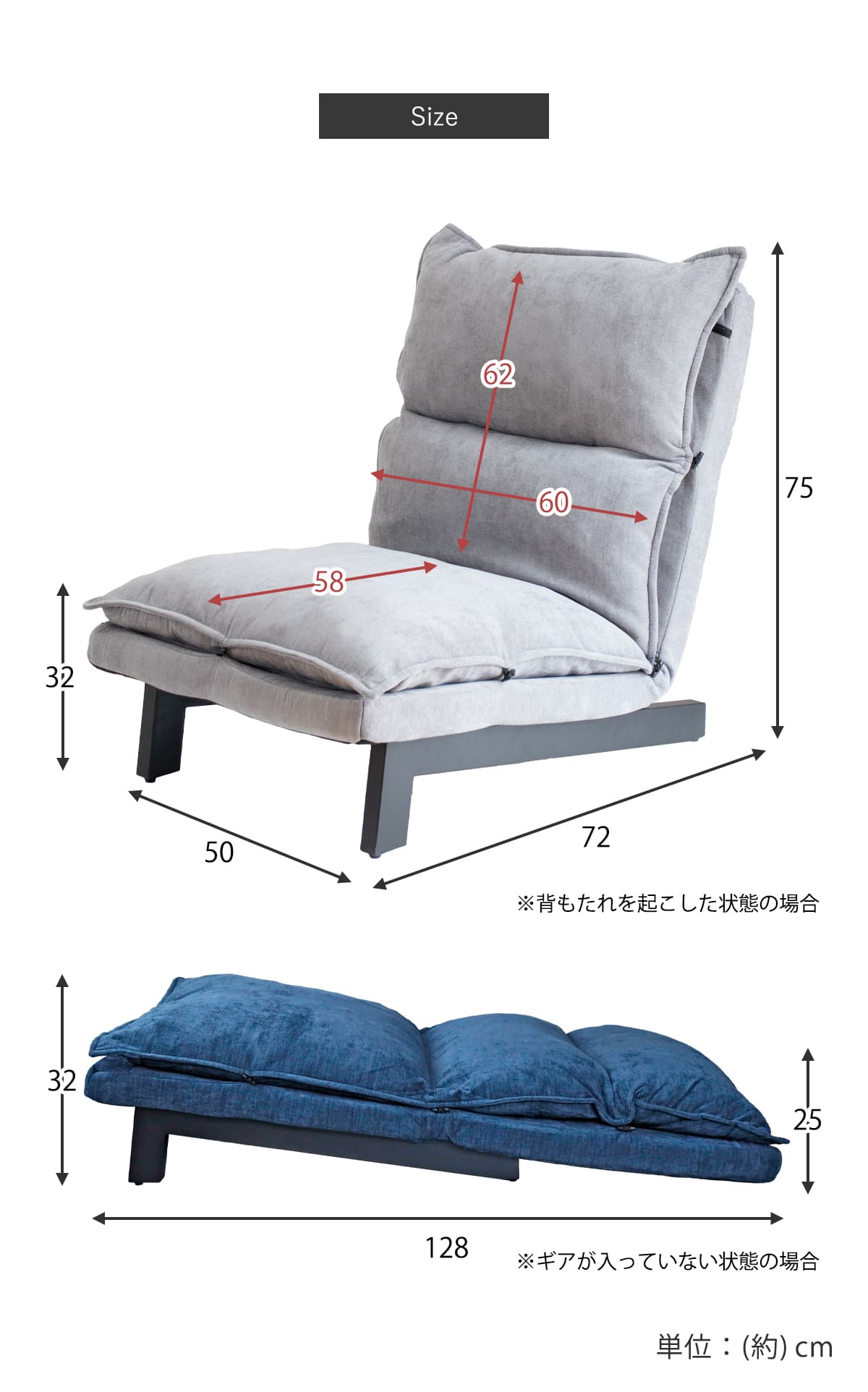 | サイズ | 約 幅60×奥行72×高さ75(cm) 座面高:約 32(cm) リクライニング時:約 奥行:約72~128(cm) |