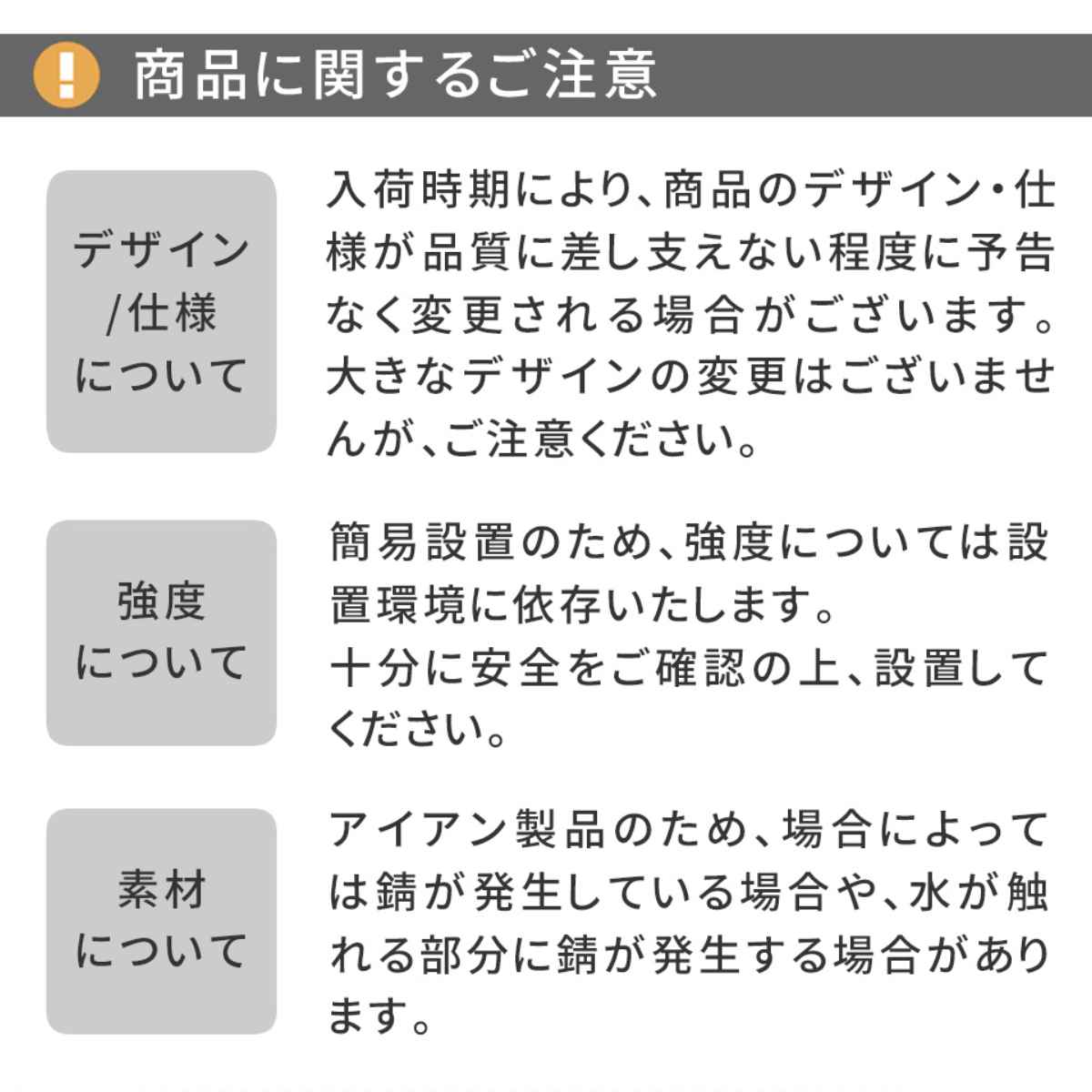 | 注意事項 | ※お客様のお使いのモニター設定、お部屋の照明等により色味が実際と異なる場合があります ※ハンドメイドのため個体差がありますことをご了承ください ※アイアン素材の特性上、錆が発生している場合や水が触れる部分に錆が発生する場合があります ※商品ページ内には別の商品を含む画像を使用しています |