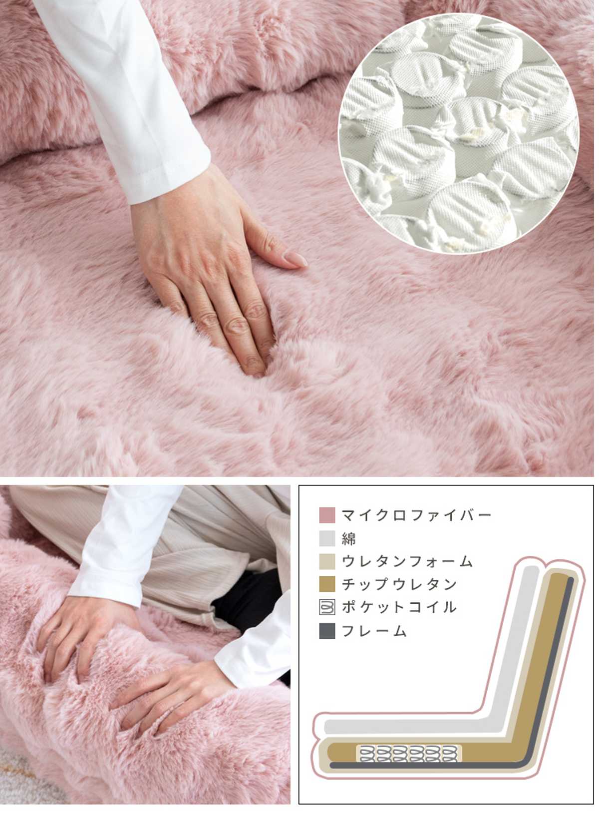 | 材質 | ポリエステル、ウレタンフォーム、綿、ポケットコイル、スチール |