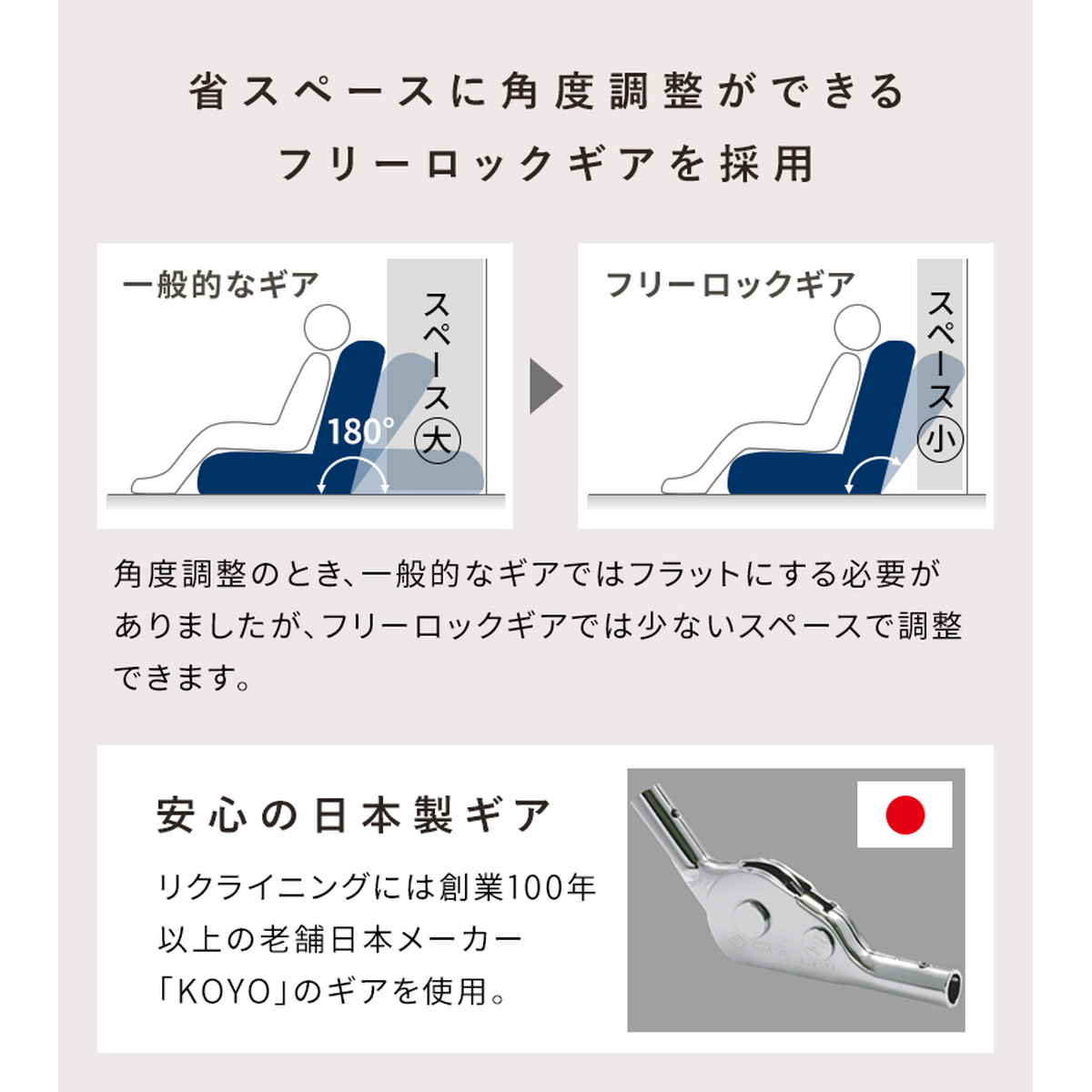 テレビ鑑賞や読書、お昼寝など様々なシーンに合わせて、お好みの角度に調整できる18段階リクライニング機能付きです。フリーロックギアで省スペースに角度調整ができます。
