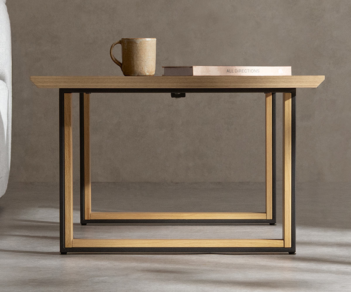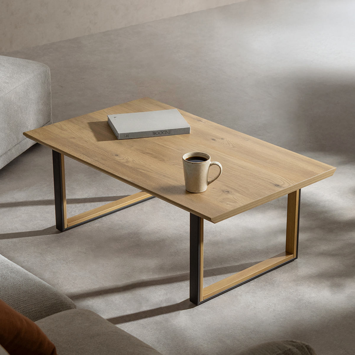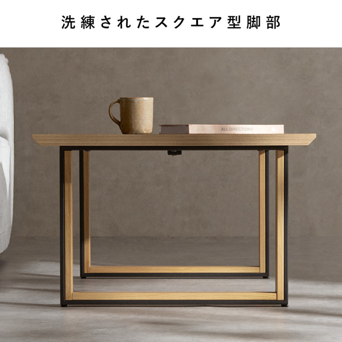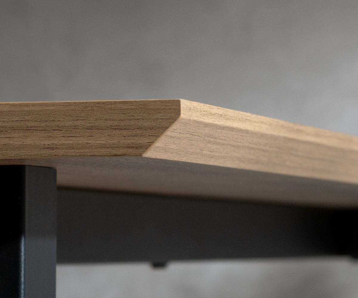 木目調とマットブラックを組み合わせた脚部が、空間を引き締めるアクセントに。安定感のあるスチール製で、天板をしっかりと支えます。