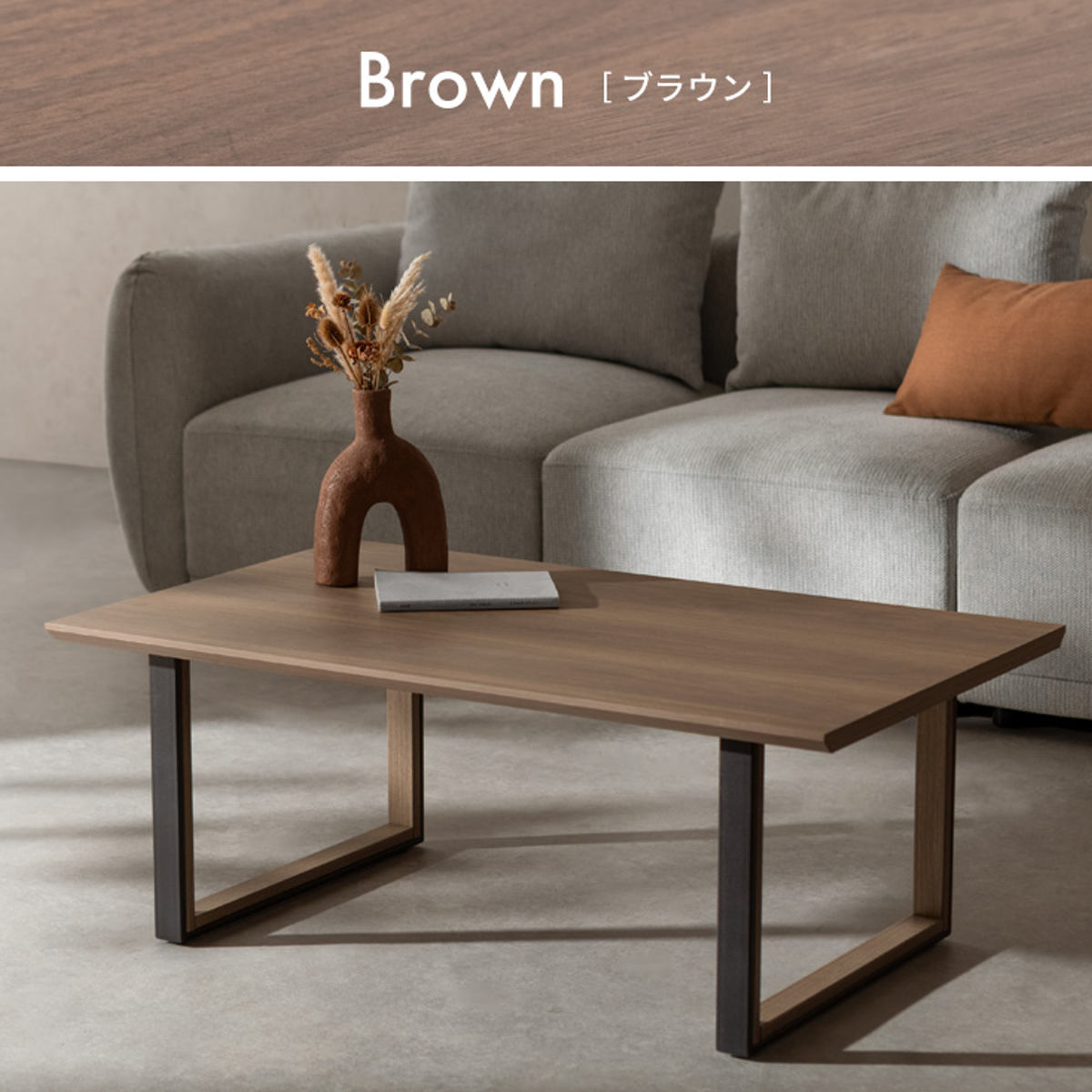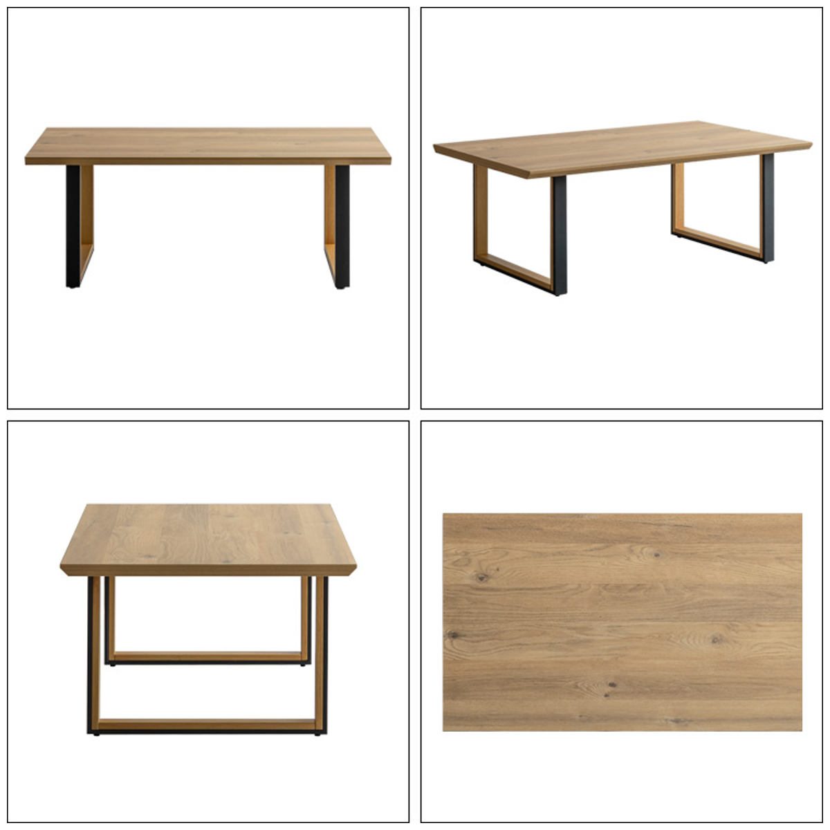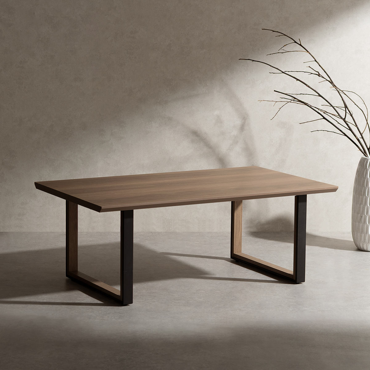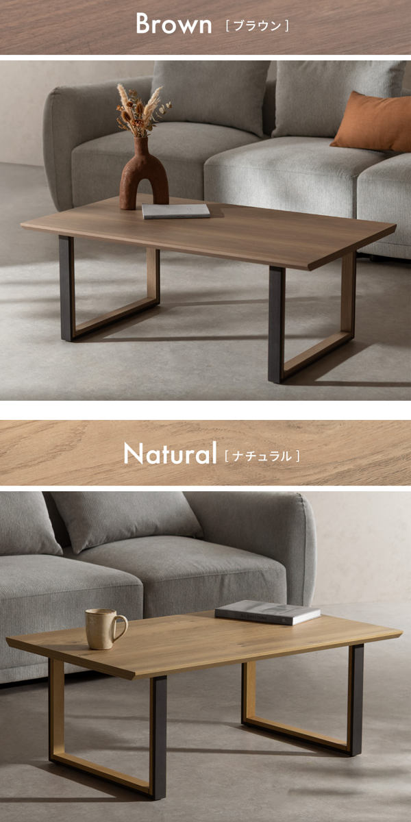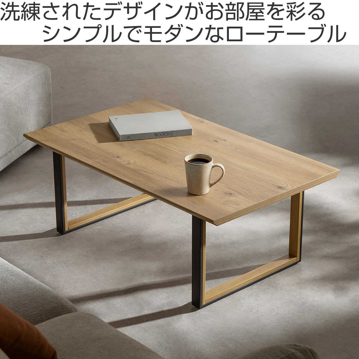 シンプルモダンな長方形天板のローテーブルです。木目調の天板とツートンカラーのロの字脚を組み合わせたデザイン。モダンで洗練されたリビングやホテルライクな空間に自然となじみ、落ち着きのある雰囲気を演出します。