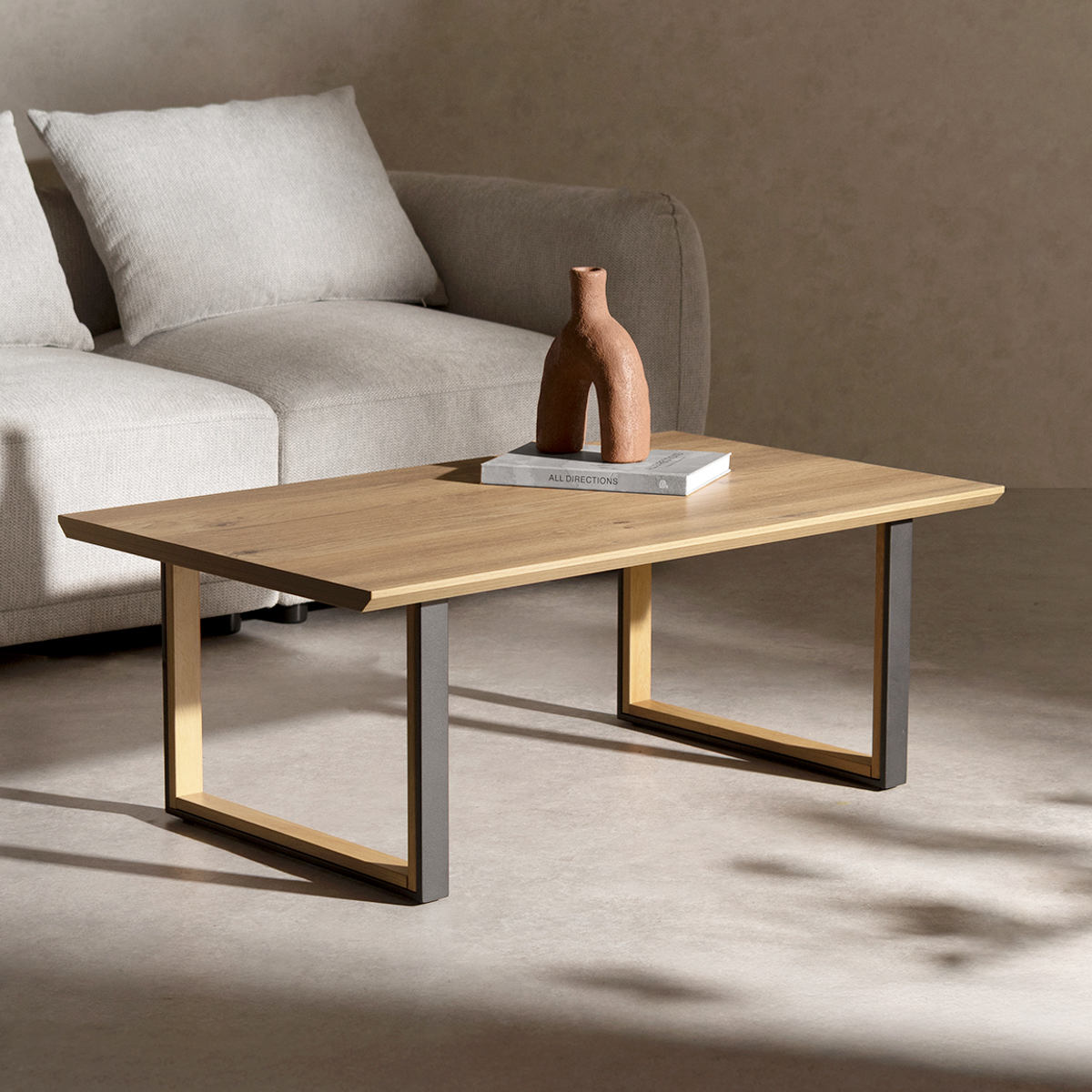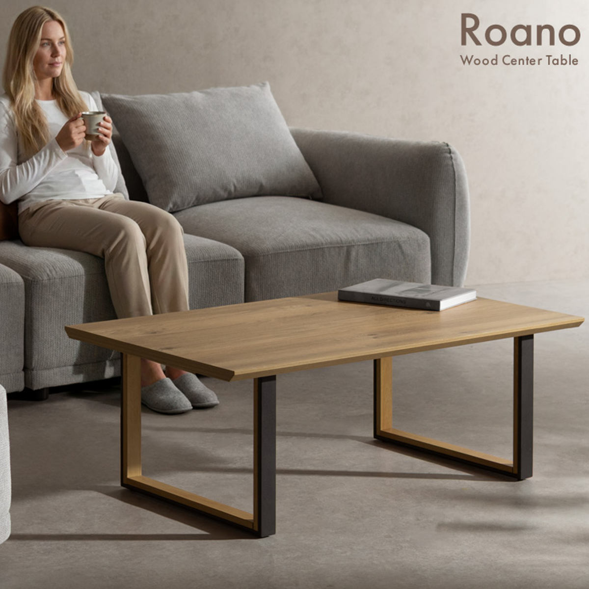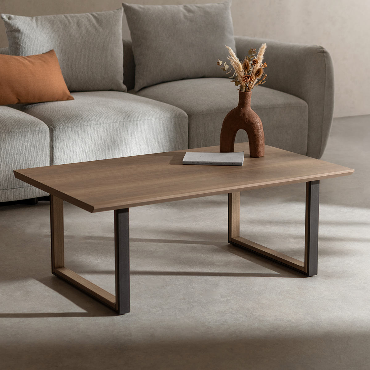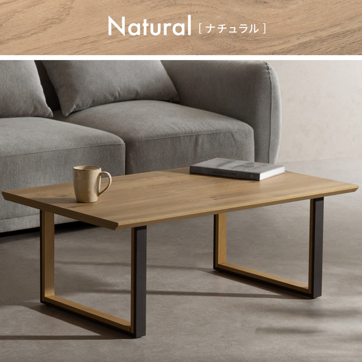 シンプルモダンな長方形天板のローテーブルです。木目調の天板とツートンカラーのロの字脚を組み合わせたデザイン。モダンで洗練されたリビングやホテルライクな空間に自然となじみ、落ち着きのある雰囲気を演出します。