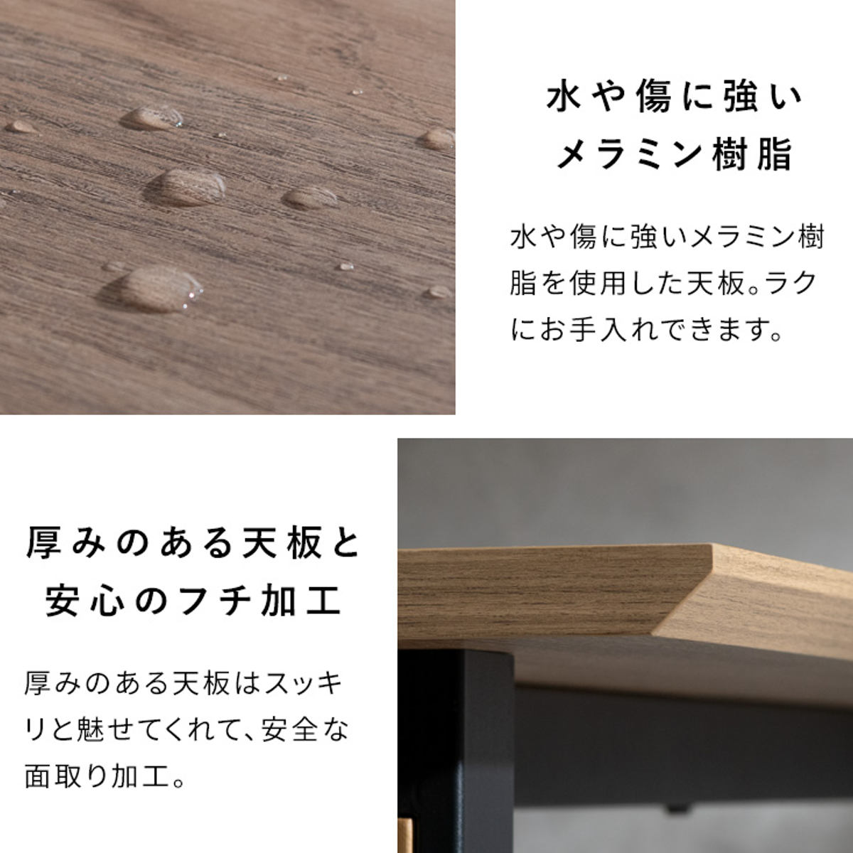 天板表面にはメラミン樹脂加工を施しています。水や汚れ、キズに強く、お手入れはサッと拭くだけ。日常使いにうれしい、扱いやすい素材です。
