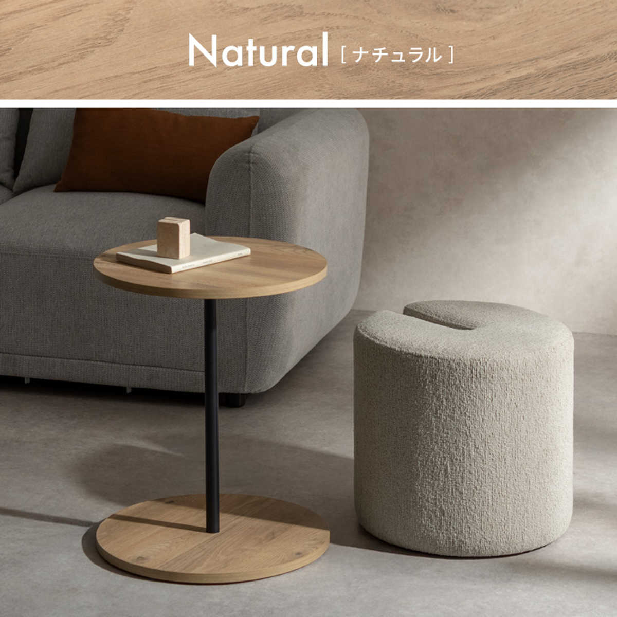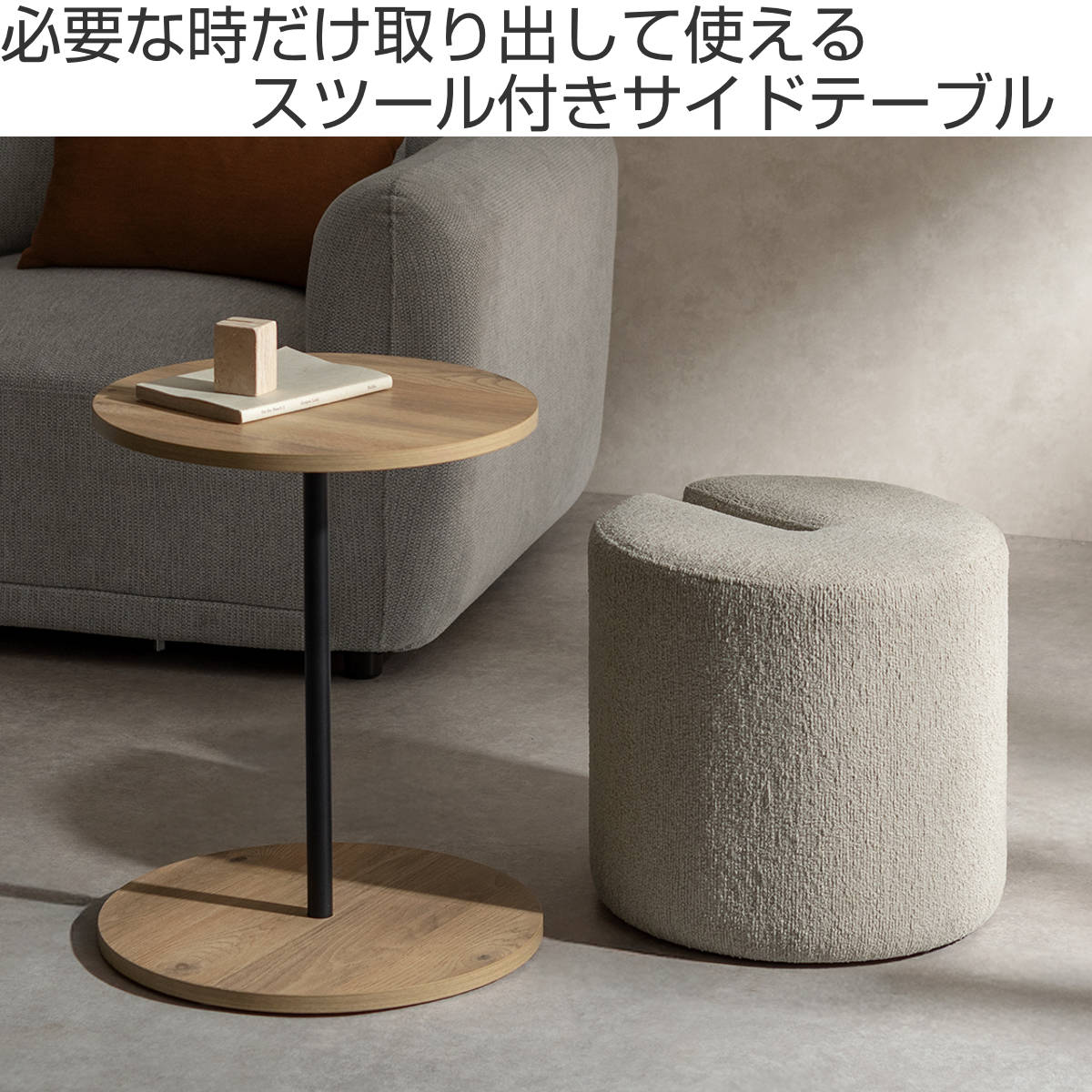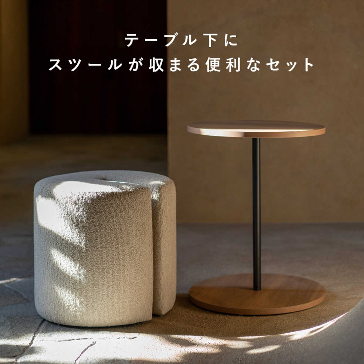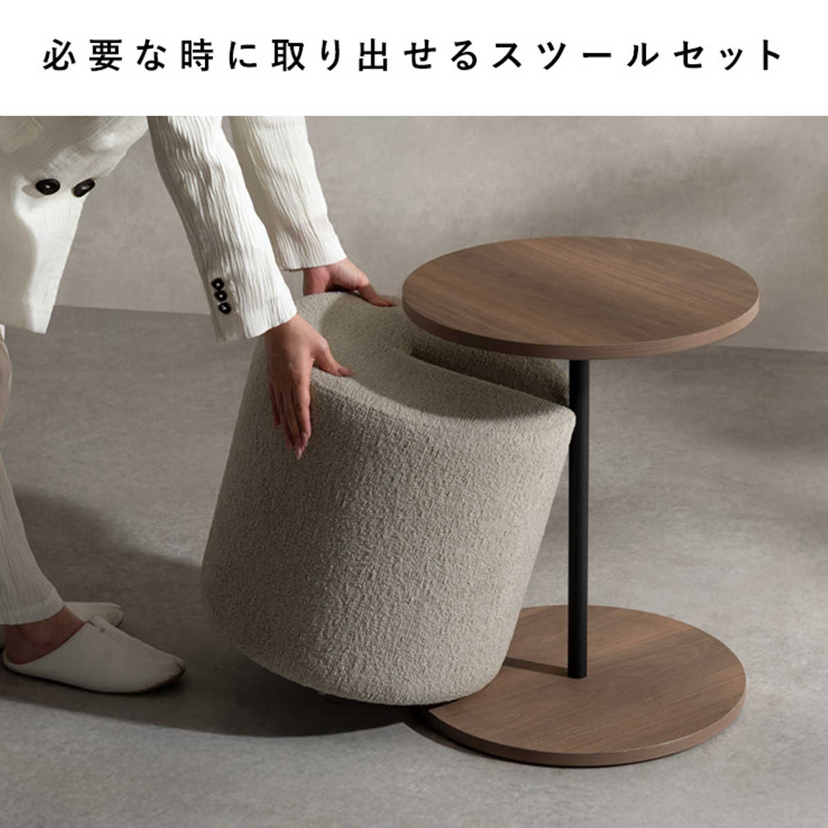 木目調のラウンドサイドテーブルと、天板下に収納できるスツールがセットになったデザイン。スツールはスリット部分を支柱に通して収納できます。必要な時にサッと取り出せるため、来客時やくつろぎ時間に活躍します。