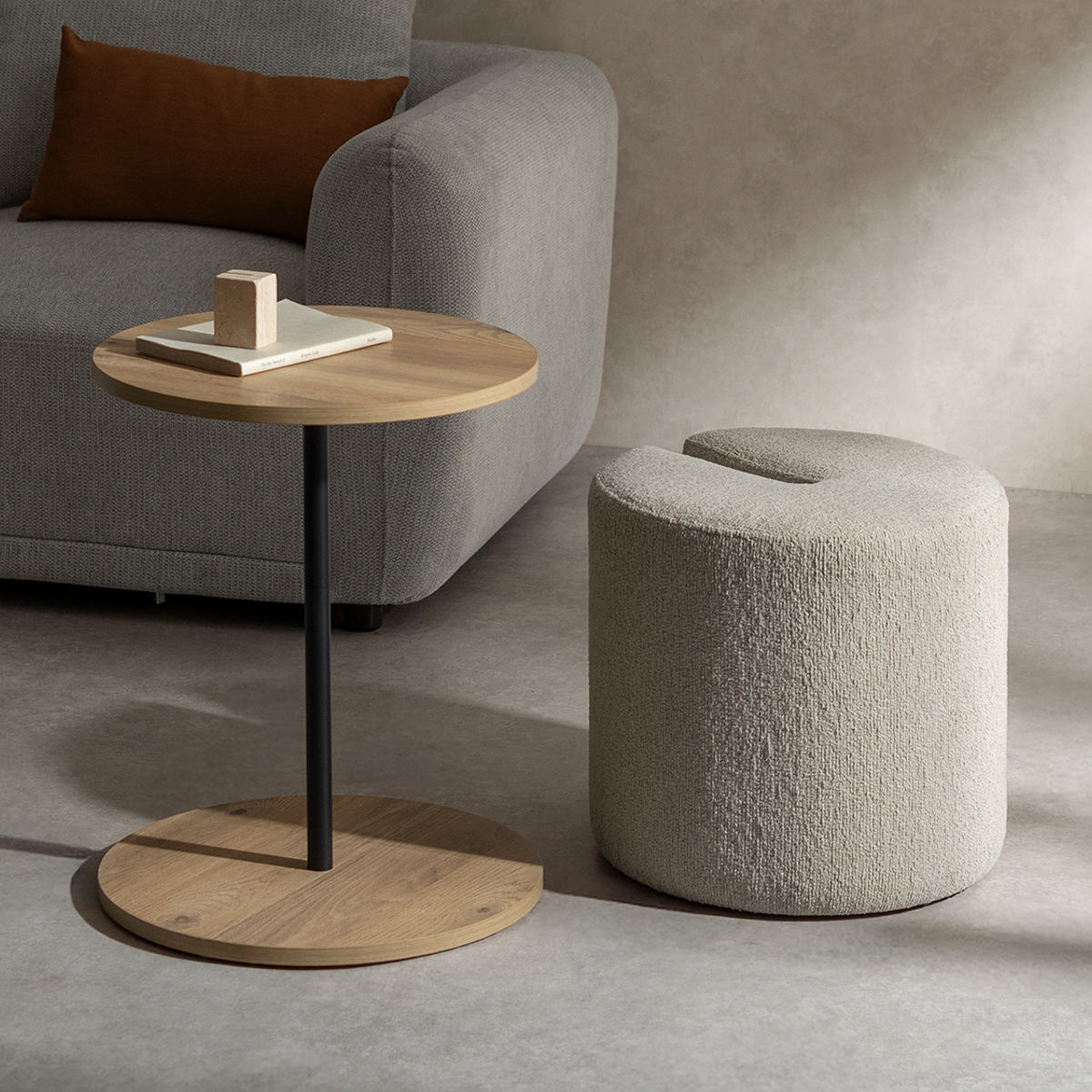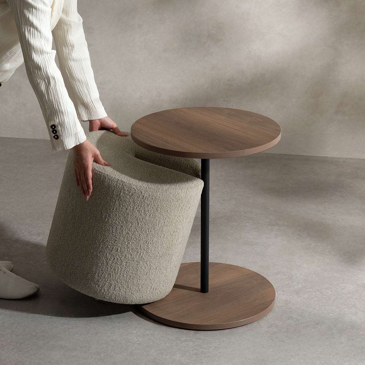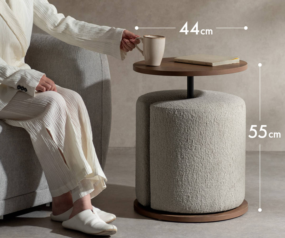 木目調のラウンドサイドテーブルと、天板下に収納できるスツールがセットになったデザイン。スツールはスリット部分を支柱に通して収納できます。必要な時にサッと取り出せるため、来客時やくつろぎ時間に活躍します。