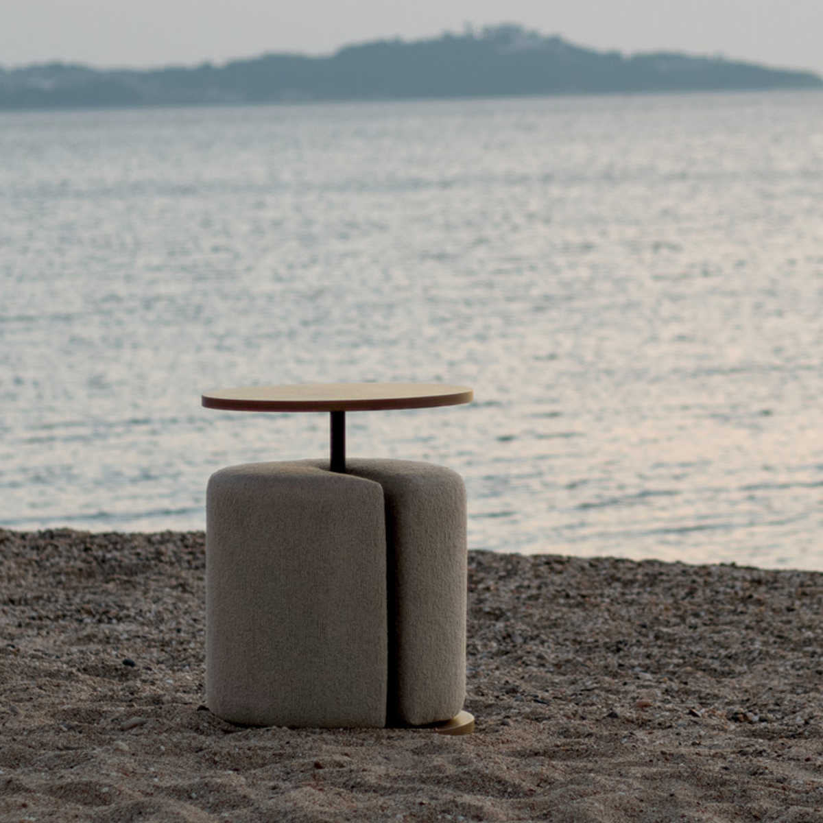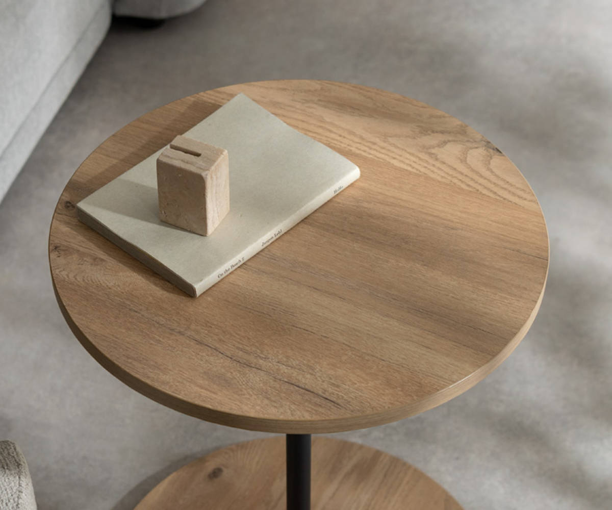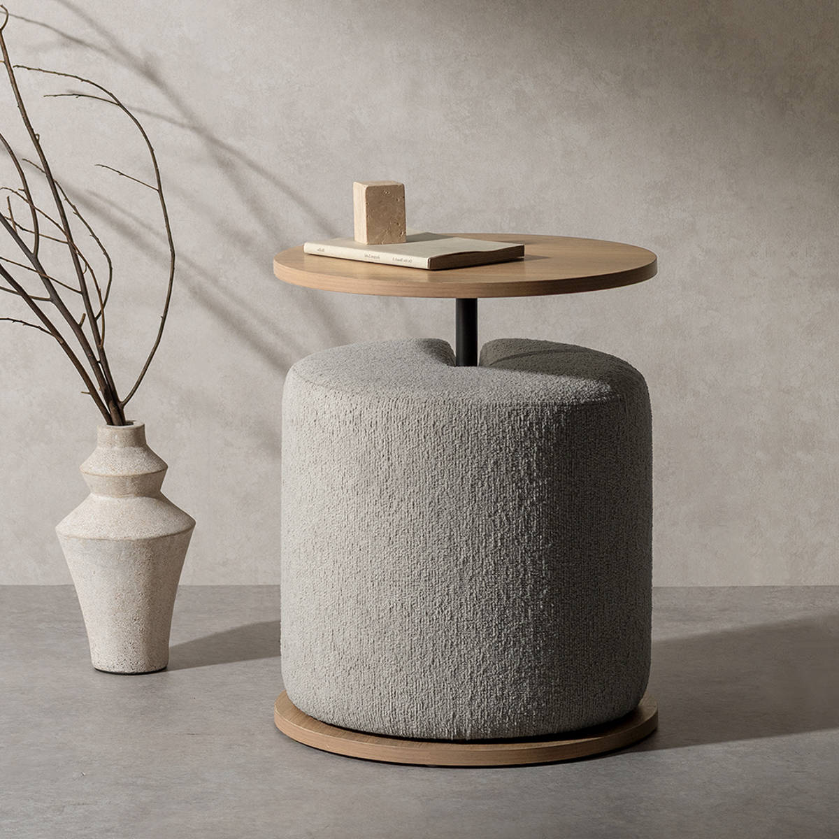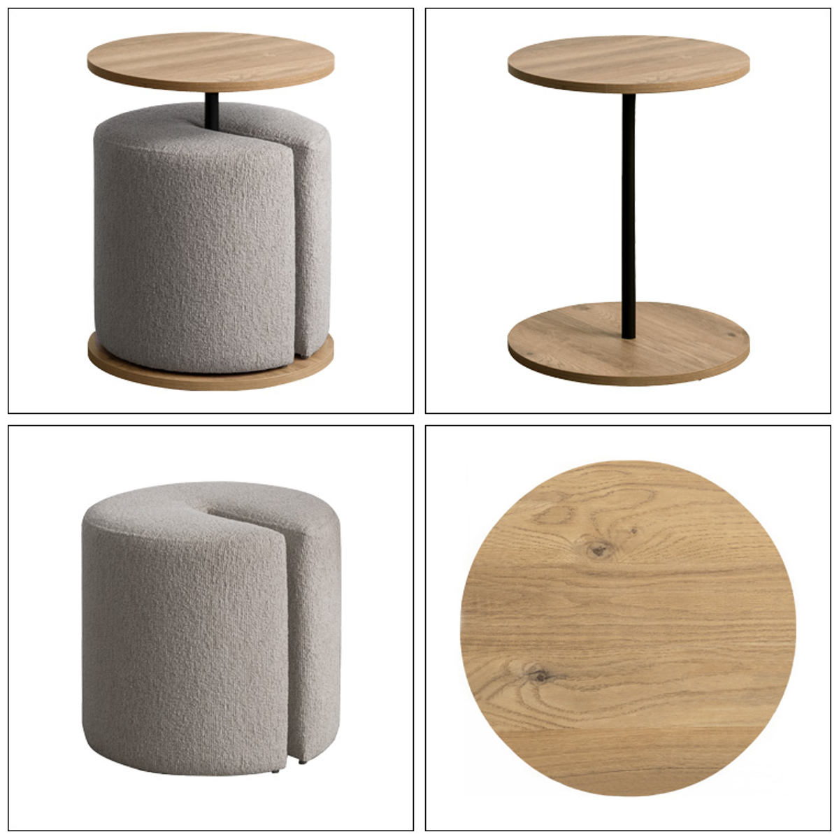 木目調のラウンドサイドテーブルと、天板下に収納できるスツールがセットになったデザイン。スツールはスリット部分を支柱に通して収納できます。必要な時にサッと取り出せるため、来客時やくつろぎ時間に活躍します。