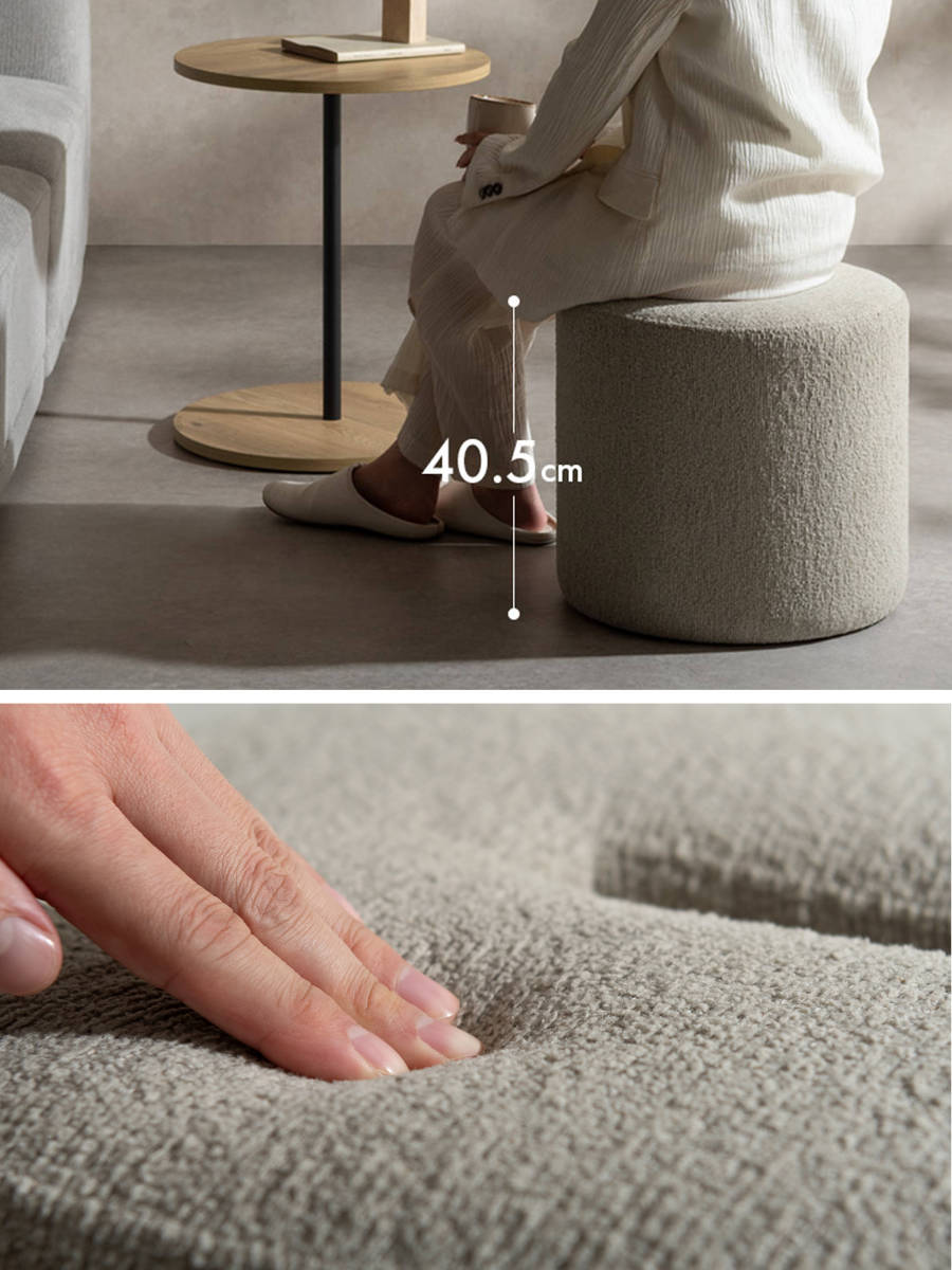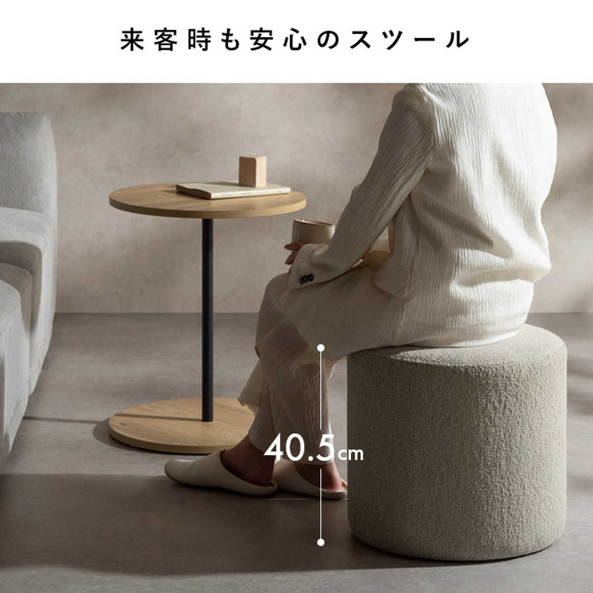座りやすい高さ40.5cm、直径42.3cmのゆとりあるサイズ。来客時のサブチェアとしても活躍します。ふんわりとしたブークレ生地とウレタン入りの座面で、快適な座り心地です。