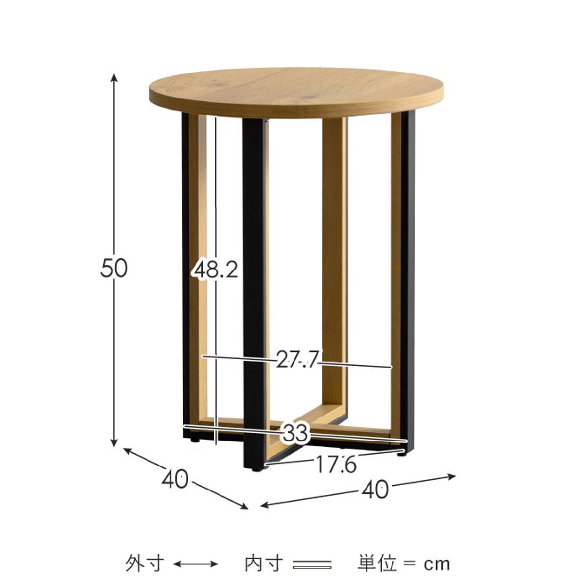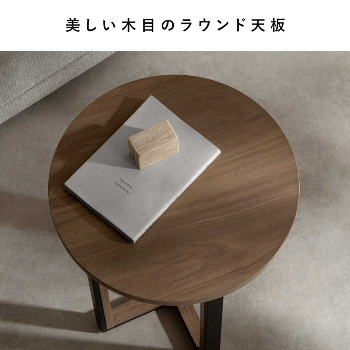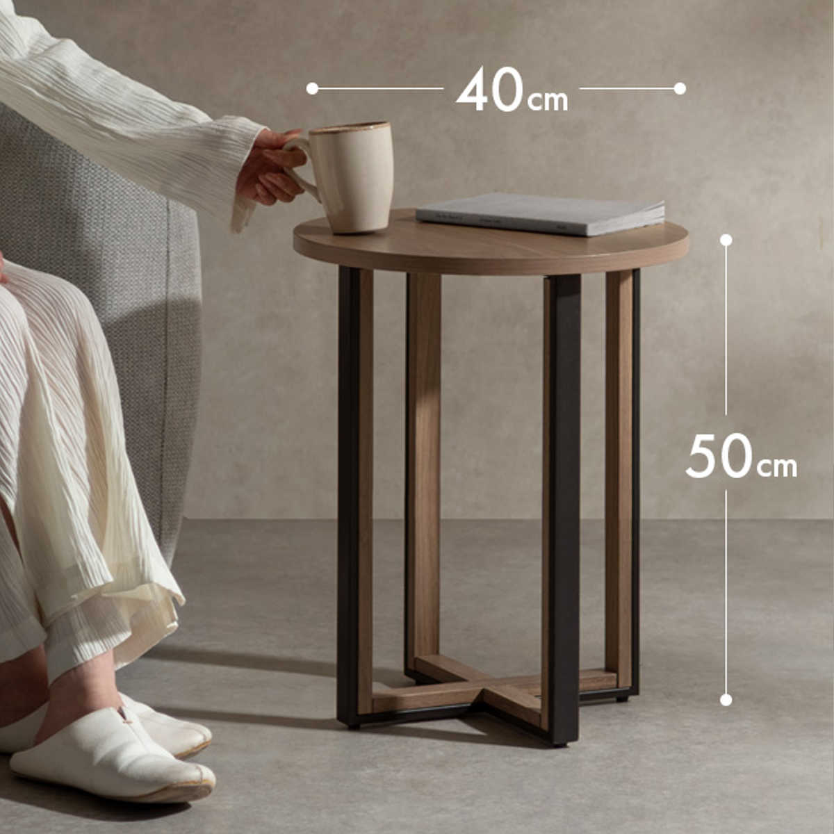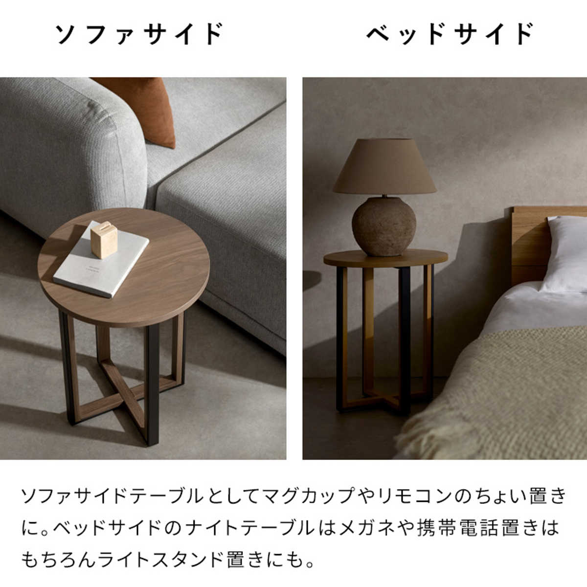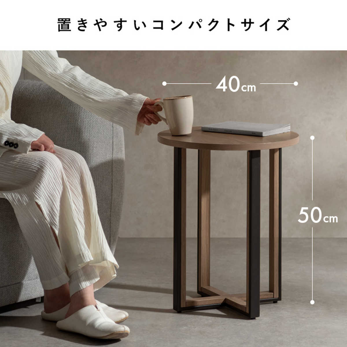 直径40cmのラウンド天板は、本やマグカップ、メガネなどのちょい置きに便利。ソファサイドではリモコンや飲み物置きに、ベッドサイドではナイトテーブルとしてライトやスマートフォン置きにも活躍します。