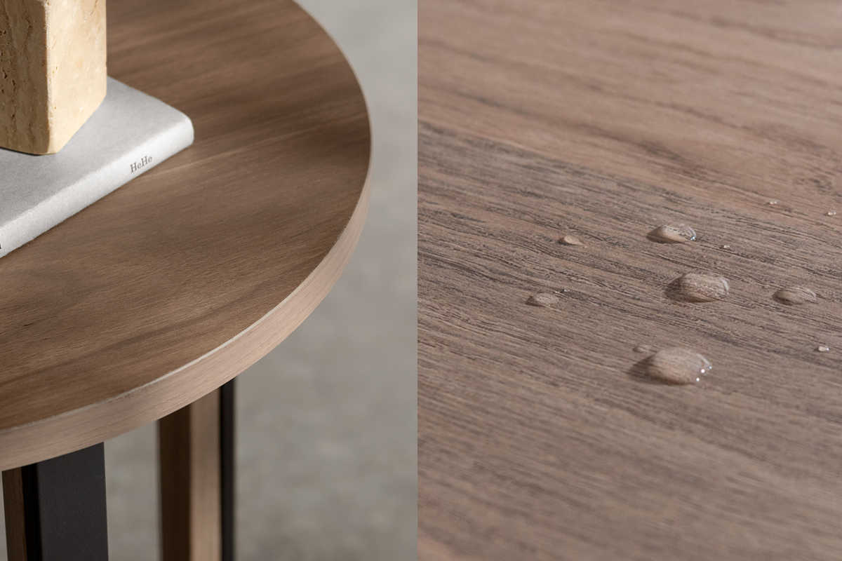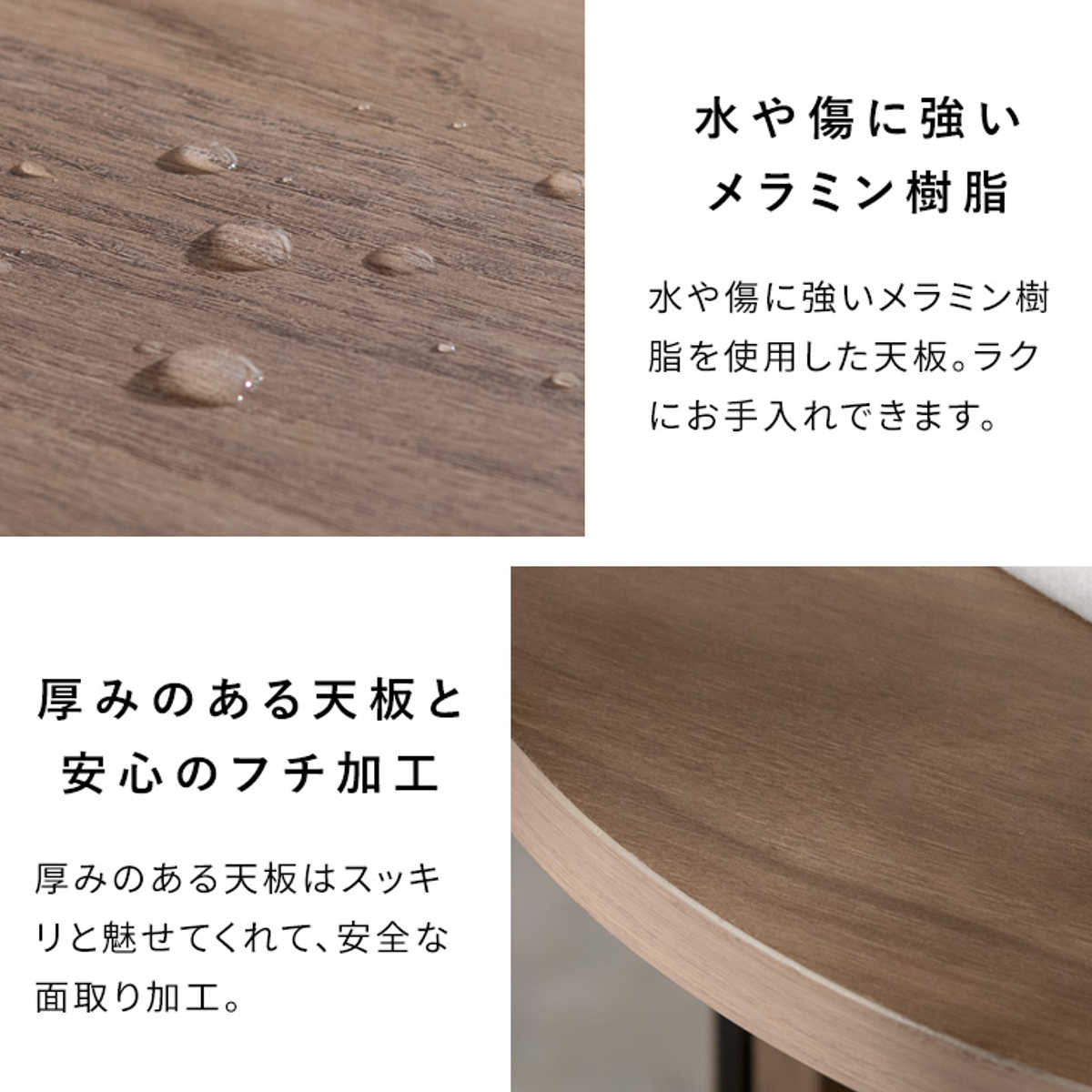 天板表面にはメラミン樹脂加工を施しています。水や汚れ、キズに強く、お手入れはサッと拭くだけ。日常使いにうれしい、扱いやすい素材です。フチには面取り加工を施し、安全性にも配慮しています。