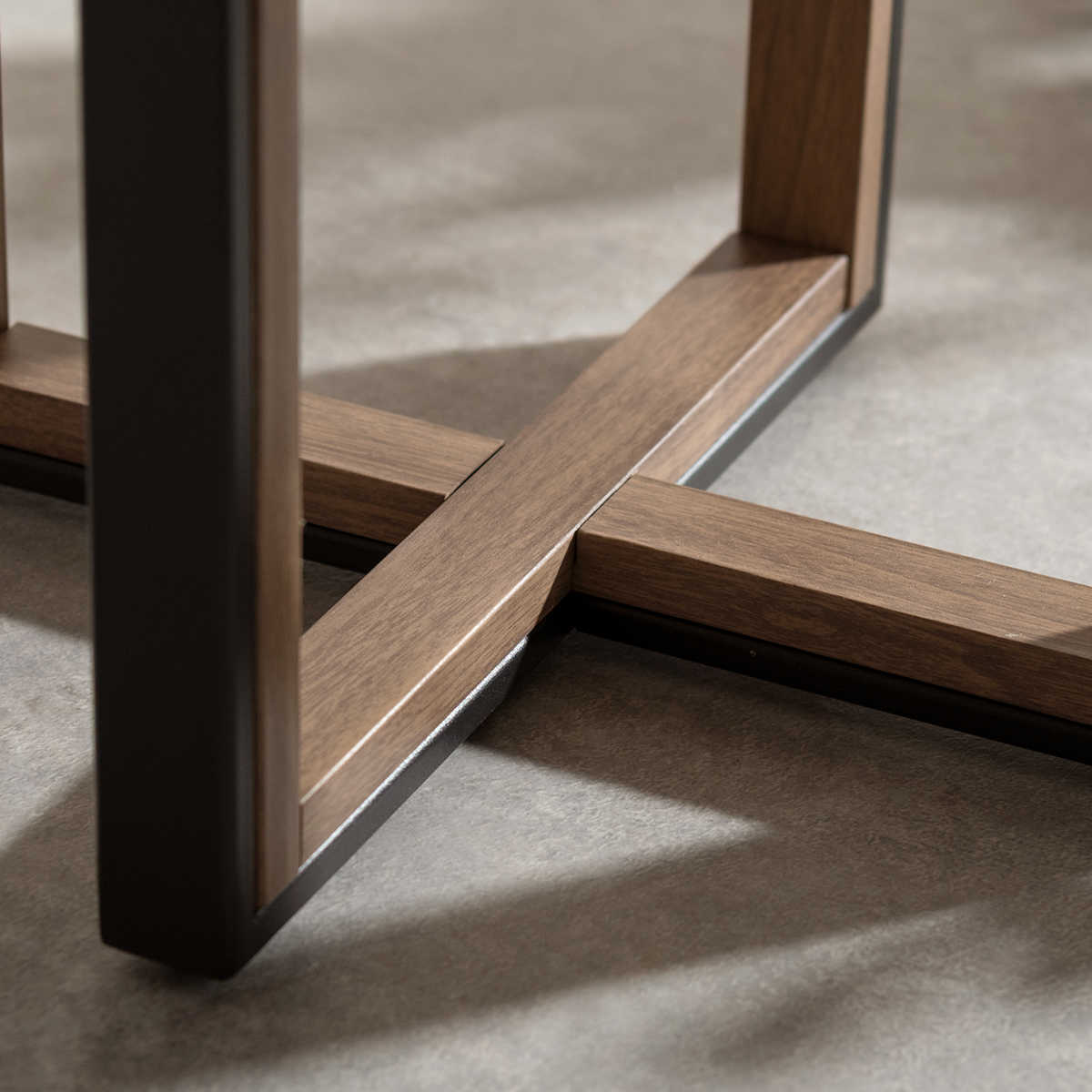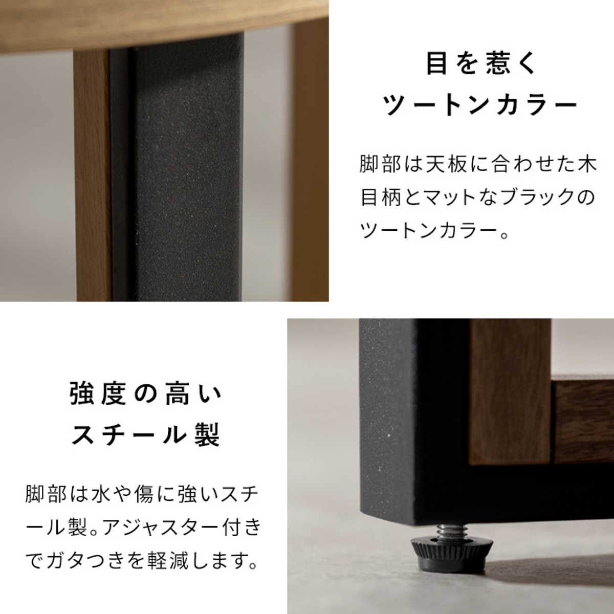 木目調とブラックスチールのツートンカラー脚を交差させたデザイン。すっきりとした見た目ながら安定感があり、天板をしっかりと支えます。