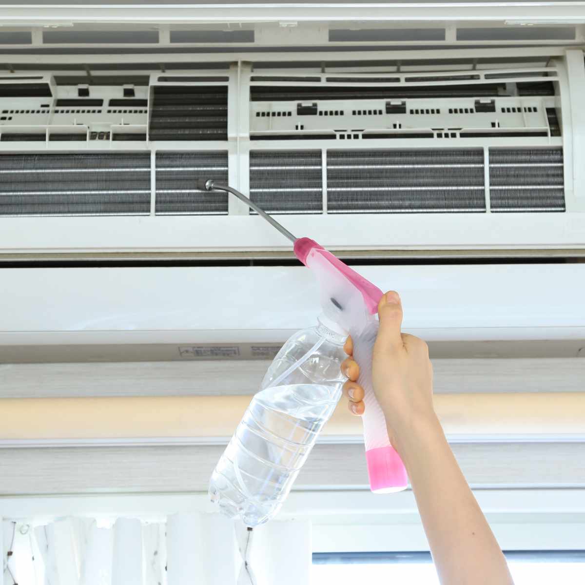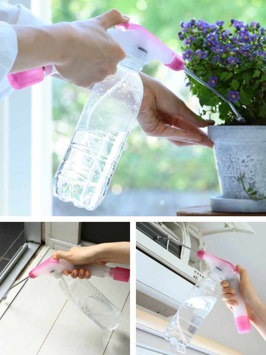 ペットボトルを取り付けるだけで簡単に使える掃除スプレーです。植物の水やりはもちろん、噴射口が長い設計なので通常のスプレーでは届きにくいエアコン掃除や窓のサッシなどの細かい溝にも最適です。