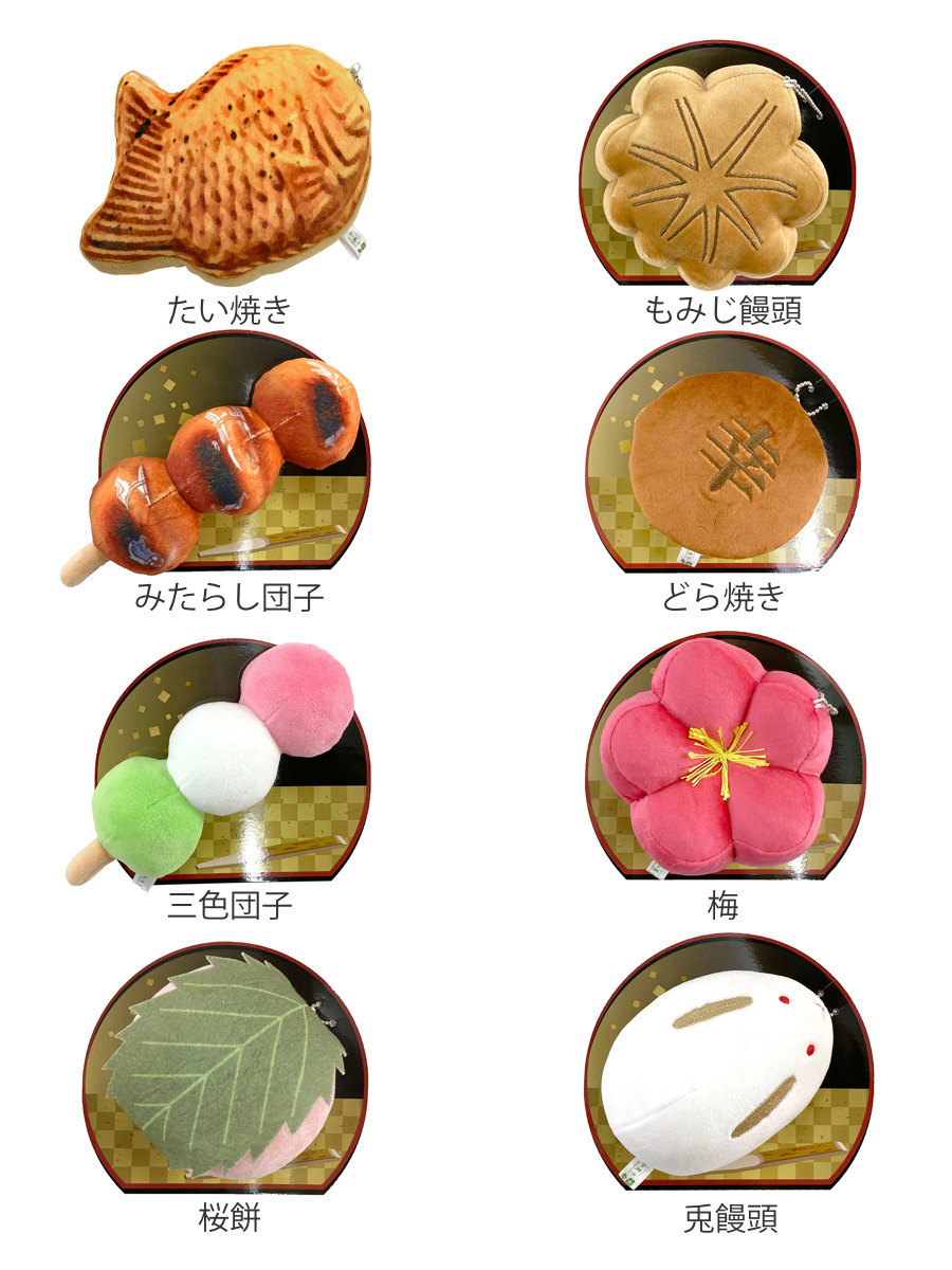 | 種類 | 兎饅頭、梅、どら焼き、もみじ饅頭、桜餅、三色団子、みたらし団子、たい焼き |