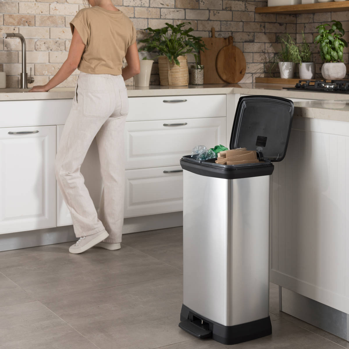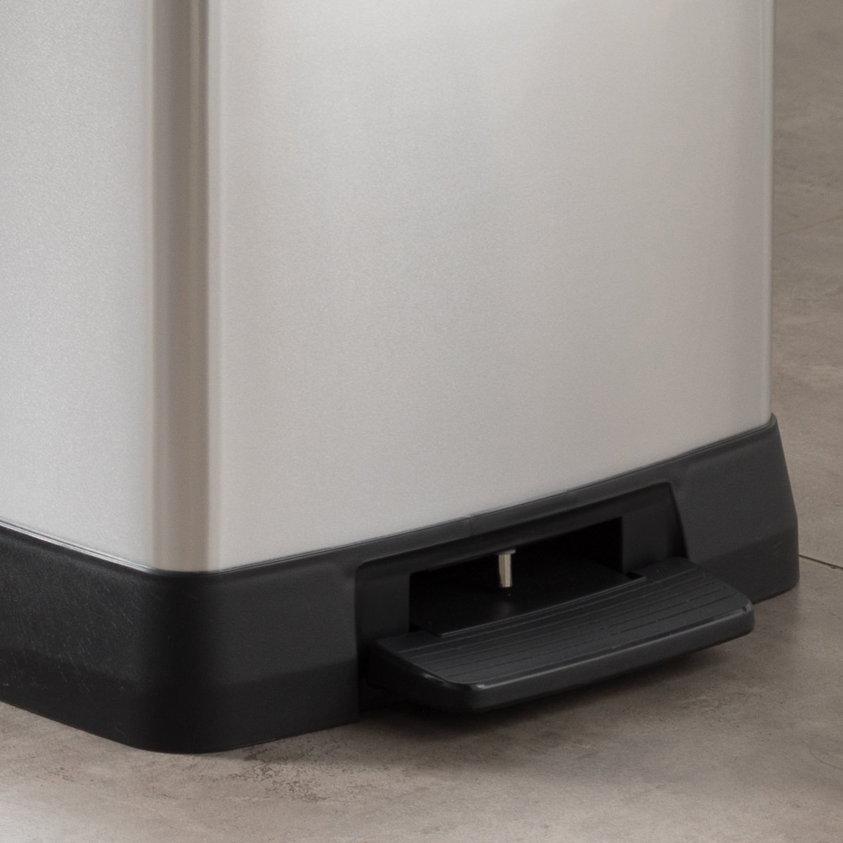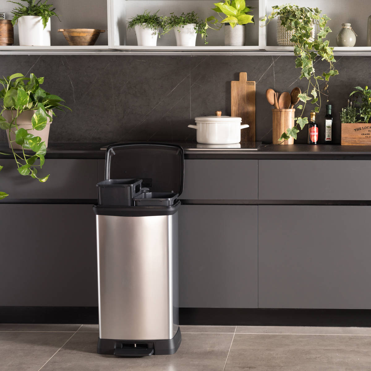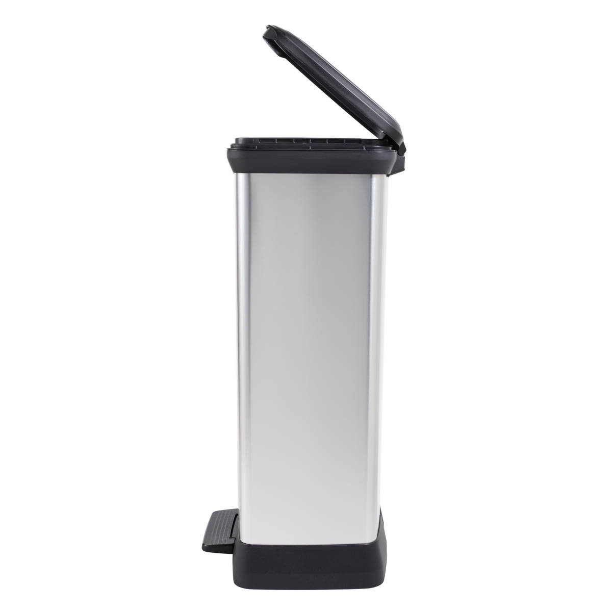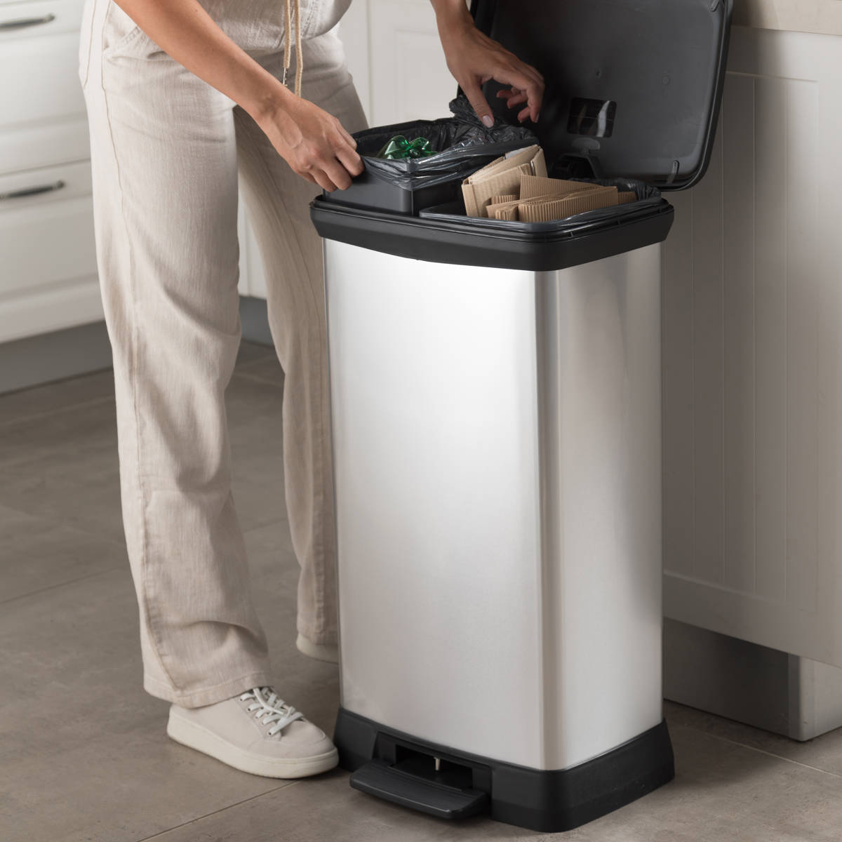 ステンレスのような上質な外観を持ちながら、リサイクルプラスチックを使用したペダル式ダストボックスです。特殊なインモールド成型により、プラスチック特有のチープさを感じさせない、美しく高級感のある質感を実現。キッチンやリビング、オフィスなど、どんなインテリアにも自然に溶け込みます。ワイド設計で奥行きはスリム。高さも確保し、場所を取らずにたっぷり使える46Lサイズです。