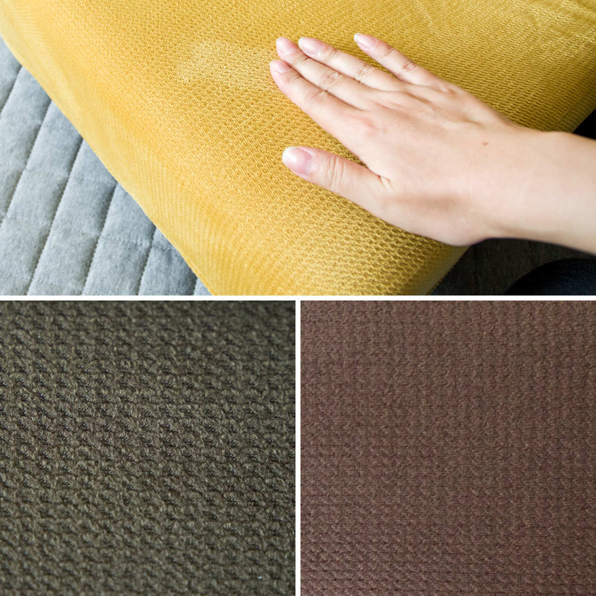 張地にはなめらかな肌触りのマイクロファイバーを採用。落ち着いたブラウン、上品なトーンのグリーン、アクセントを添えるイエローの3色から、お部屋の雰囲気に合わせて選べます。