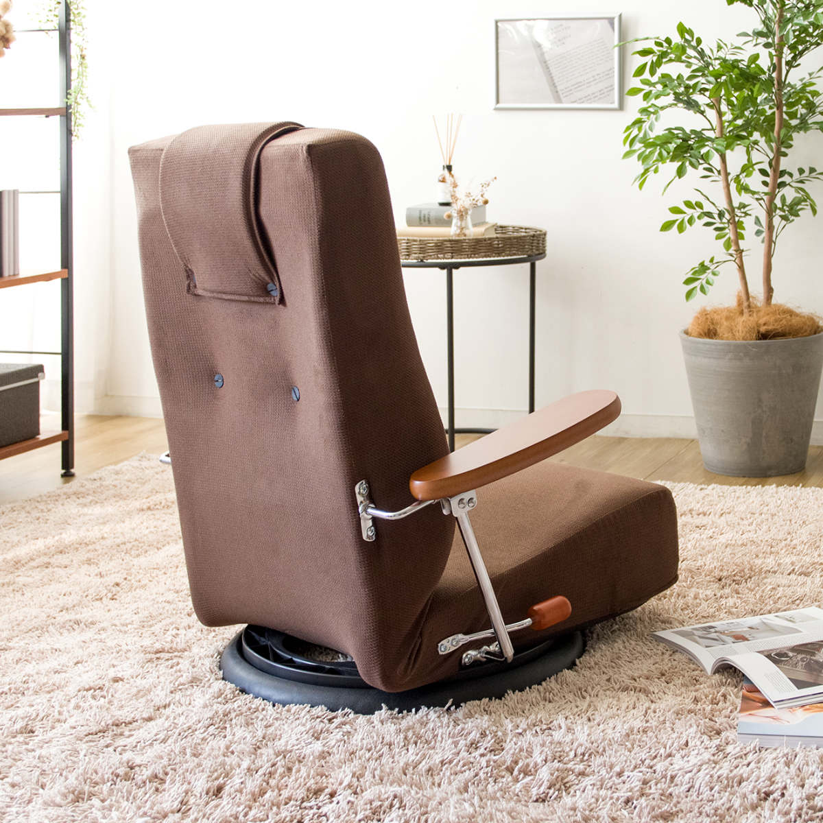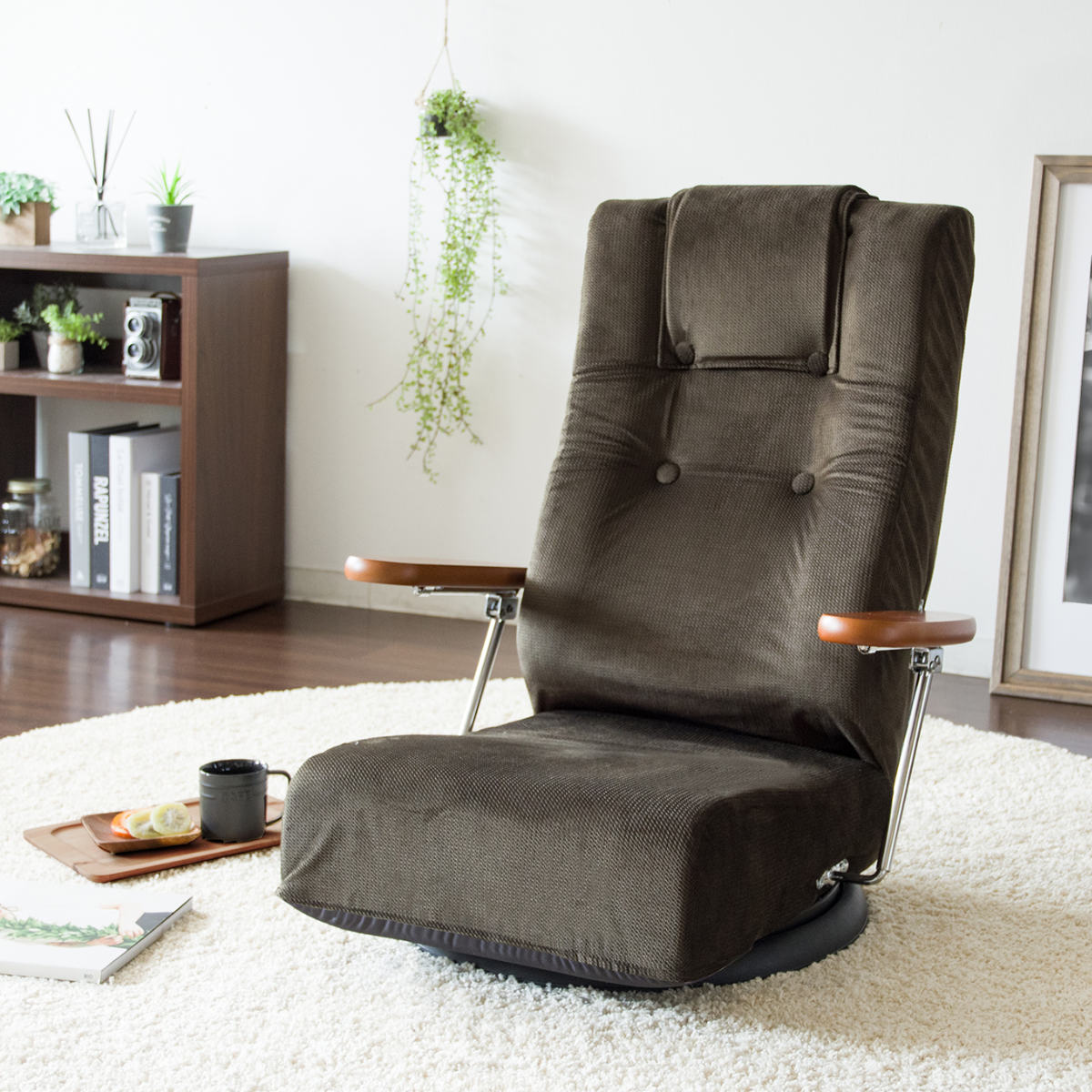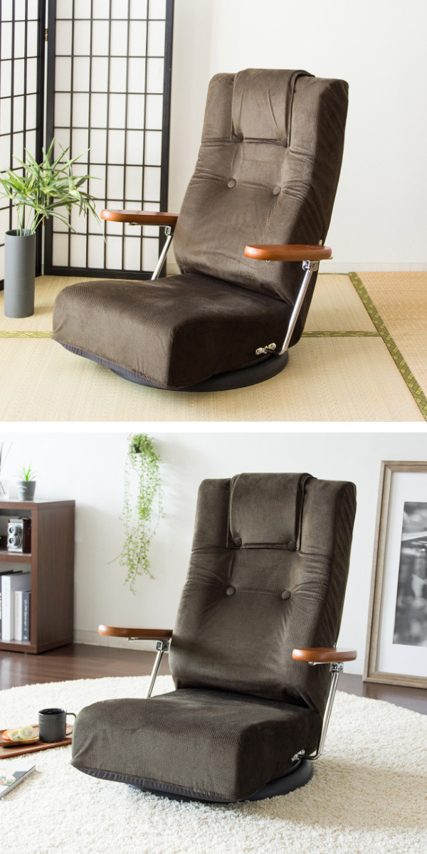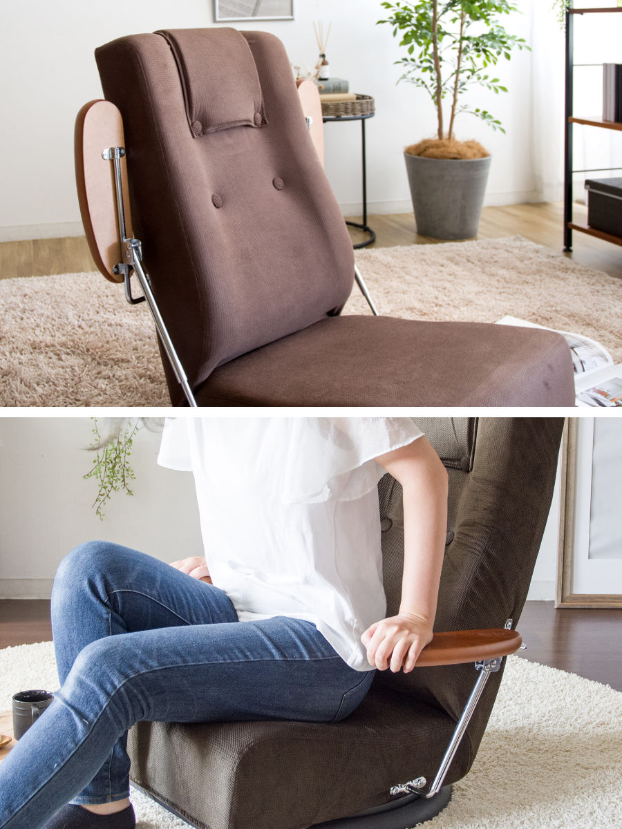 座椅子 回転 肘掛け付き 13段階リクライニング Diano 日本製 ( 座いす レバー式 リクライニング 背もたれ ヘッド 5段階 ファブリック ハイバック 肘置き 跳ね上げ式 フロアチェア 完成品 ウレタン 回転座椅子 和室 洋室 ) 【ブラウン】