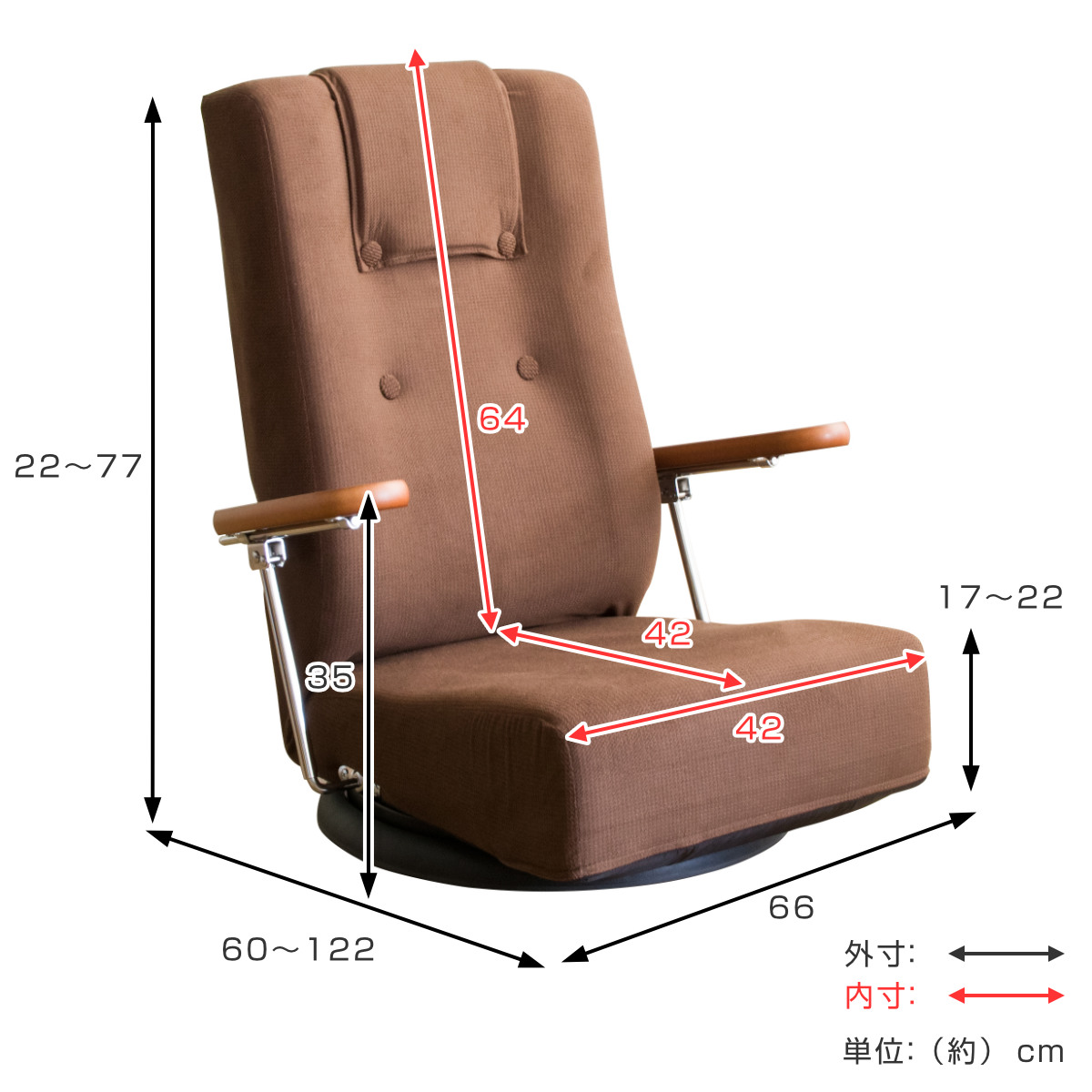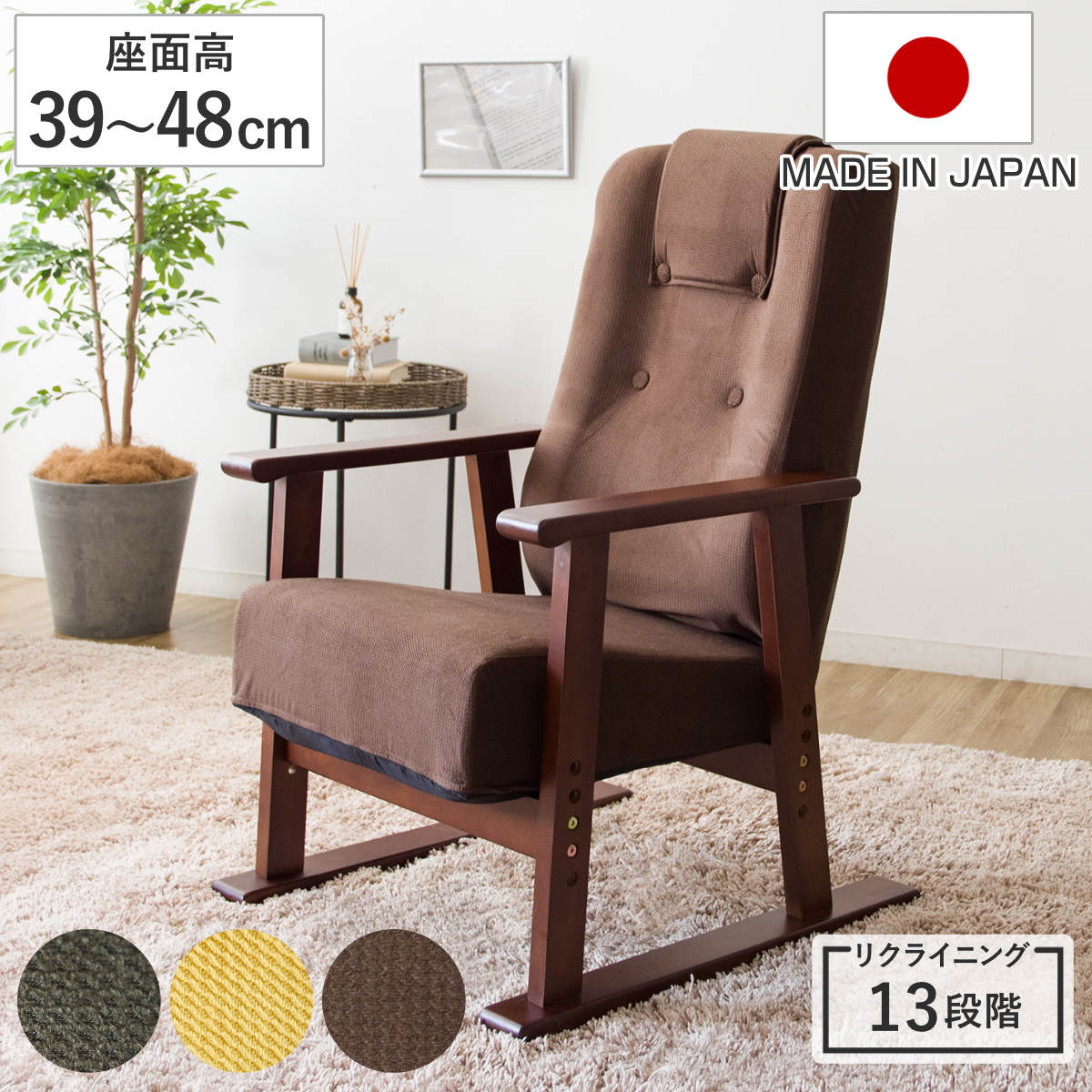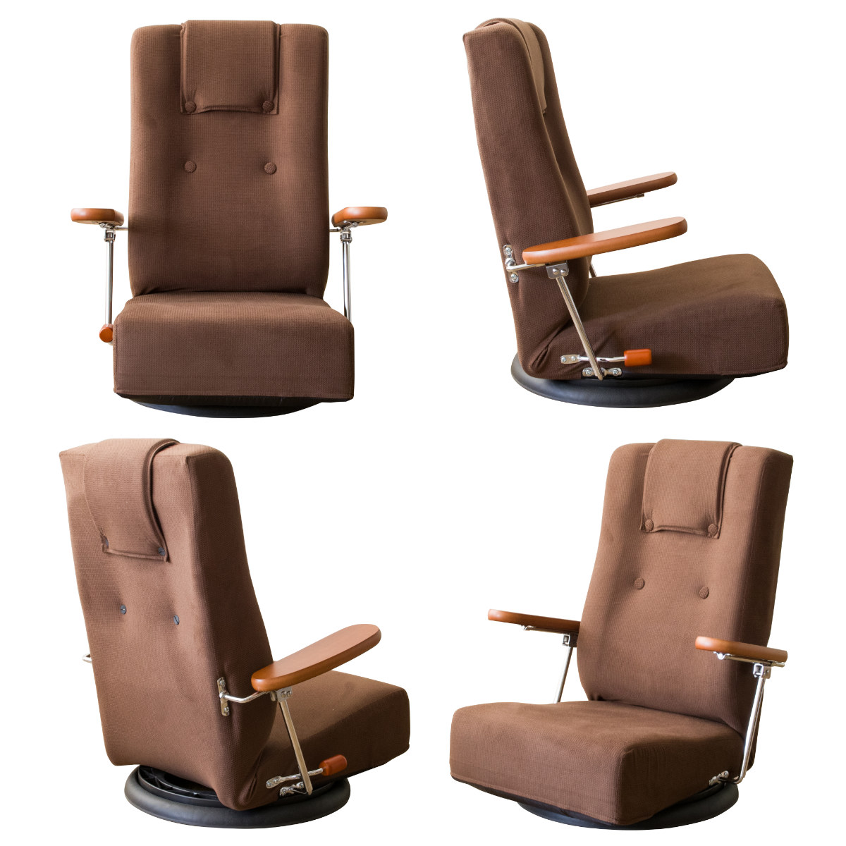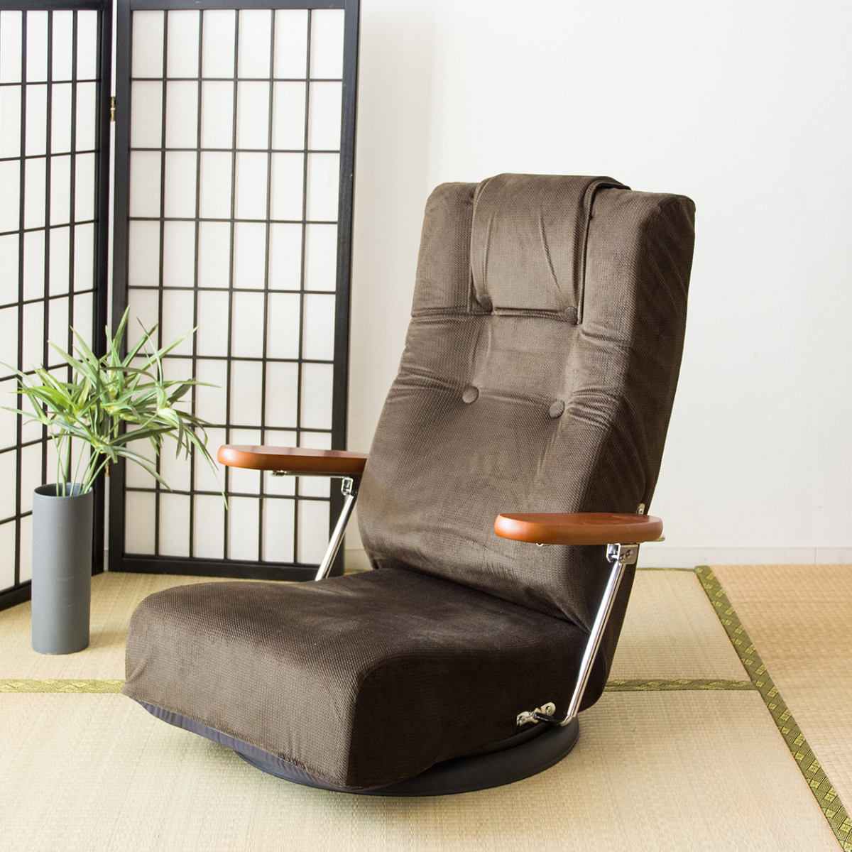 座椅子 回転 肘掛け付き 13段階リクライニング Diano 日本製 ( 座いす レバー式 リクライニング 背もたれ ヘッド 5段階 ファブリック ハイバック 肘置き 跳ね上げ式 フロアチェア 完成品 ウレタン 回転座椅子 和室 洋室 ) 【ブラウン】