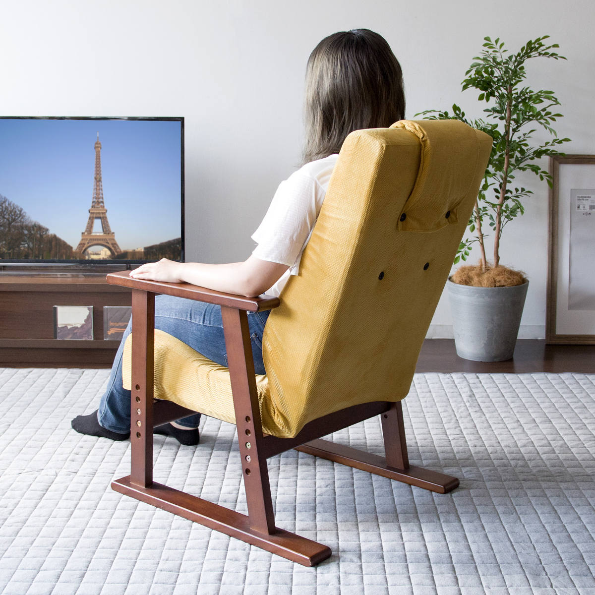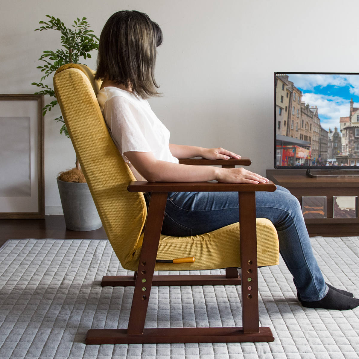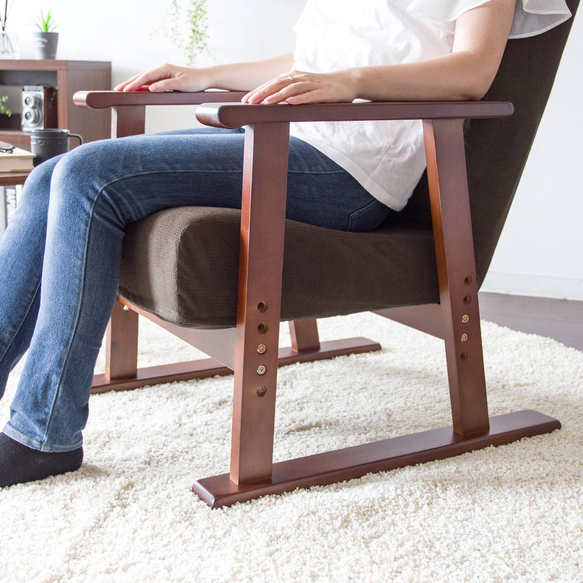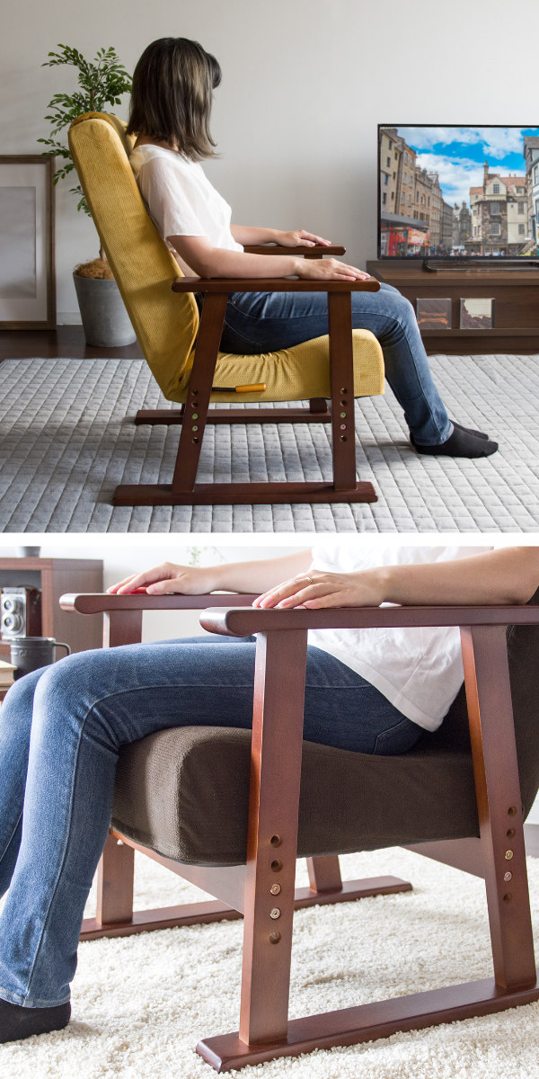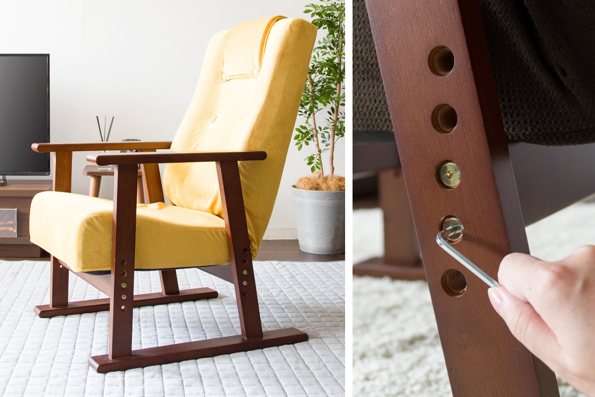 天然木のフレームは見た目の美しさだけでなく強度にも優れ、座面をしっかりと支えます。後ろ脚を長めにした設計で転倒を防ぎ、つかみやすい肘掛けが立ち上がりをやさしくサポートします。