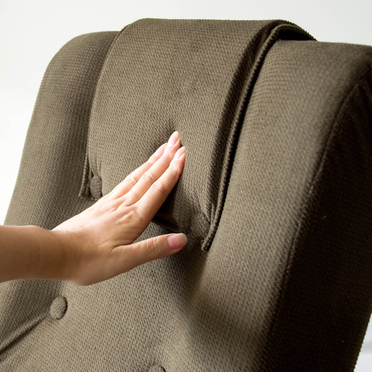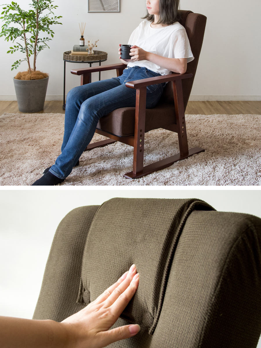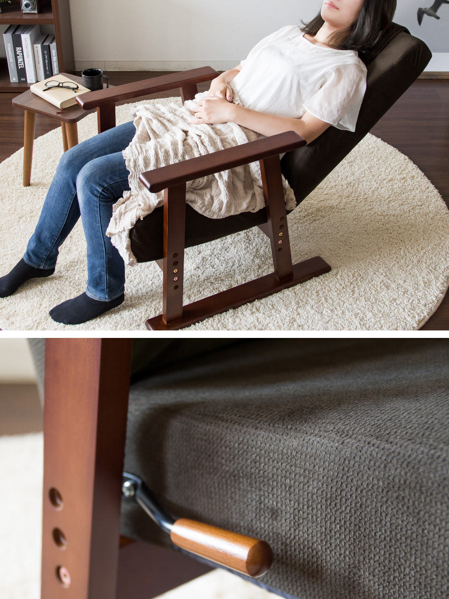 組み立てから生地張り、組付け、検品までを国内工場で職人が一つひとつ丁寧に仕上げています。細部まで行き届いた品質管理により、日常使いでも安心して長く使える座椅子です。