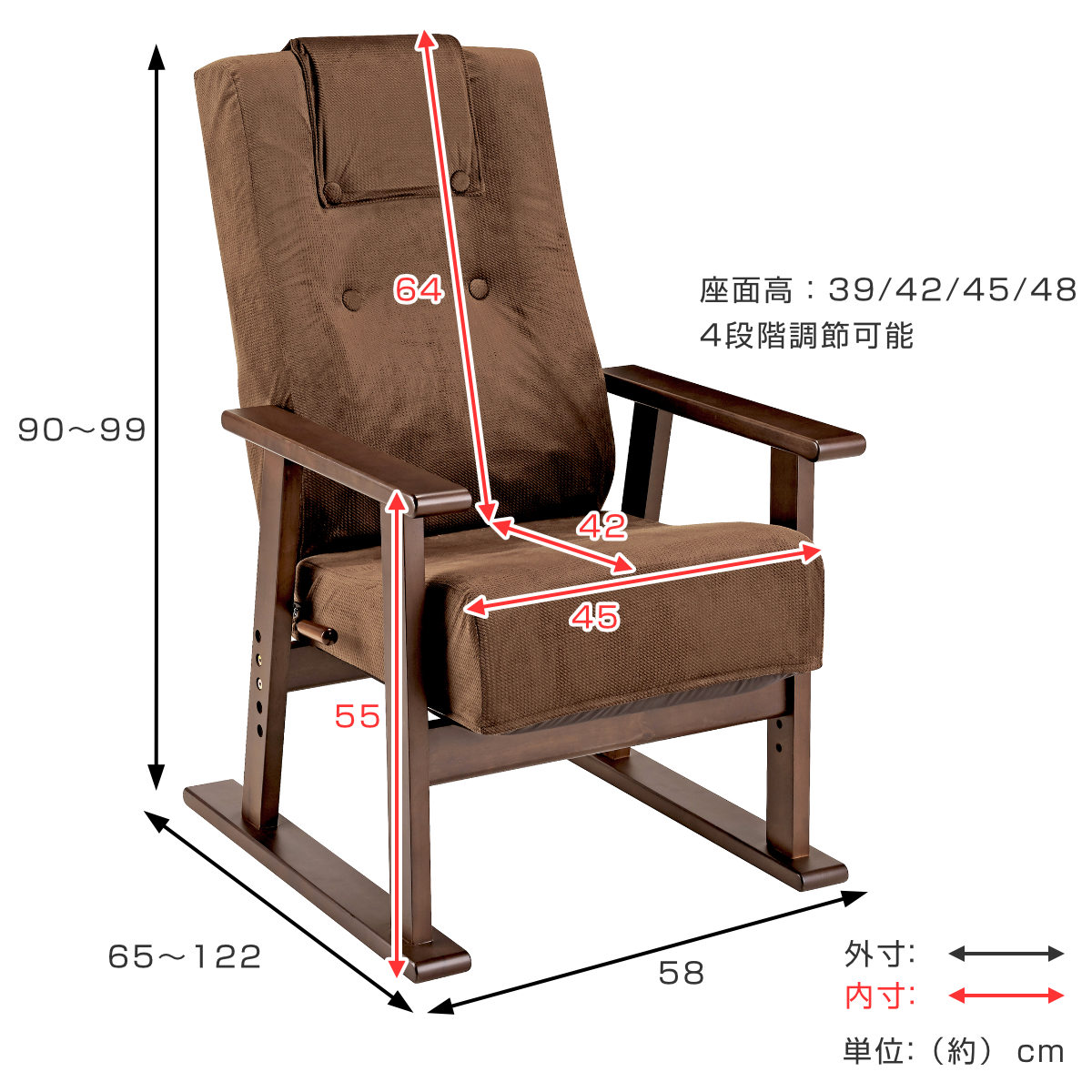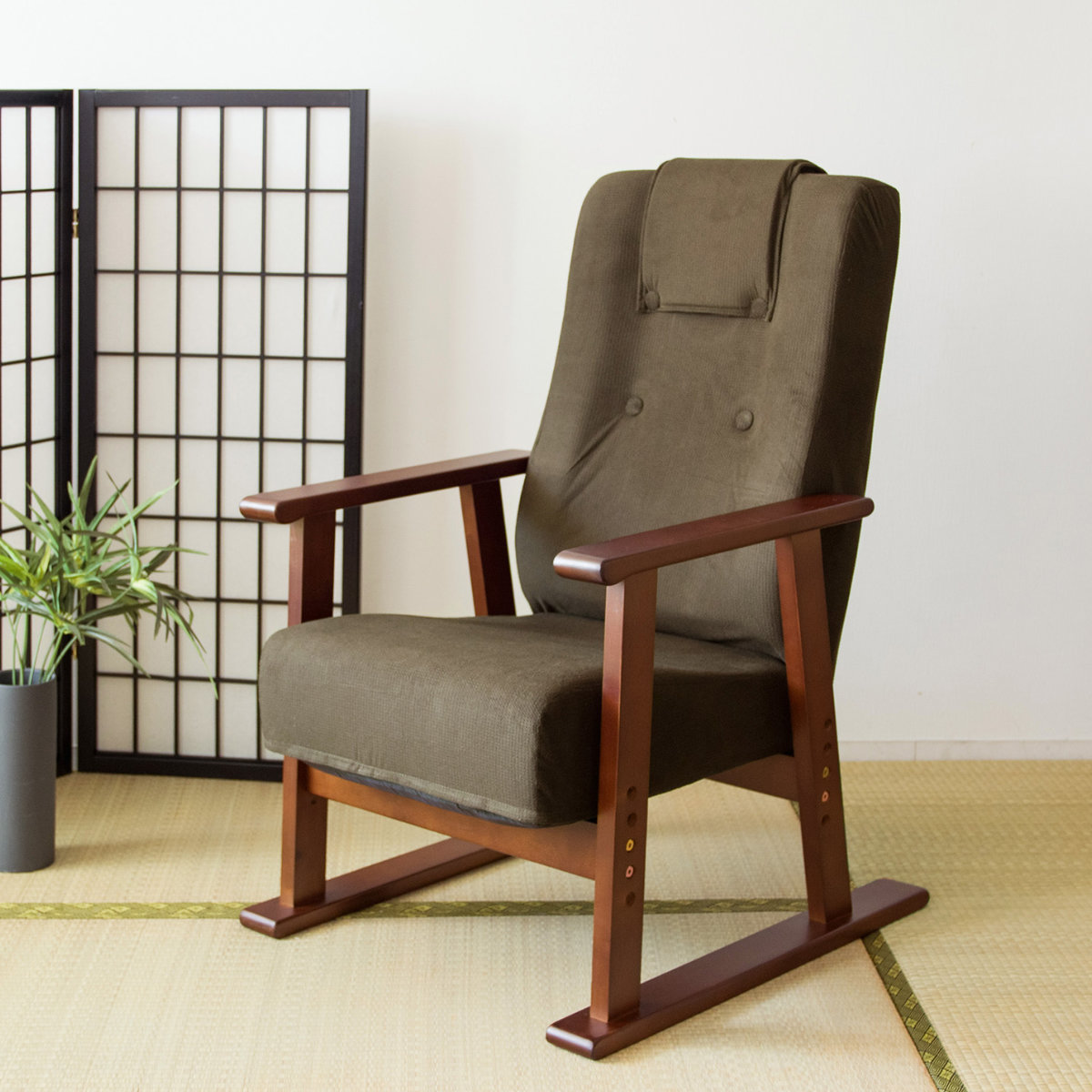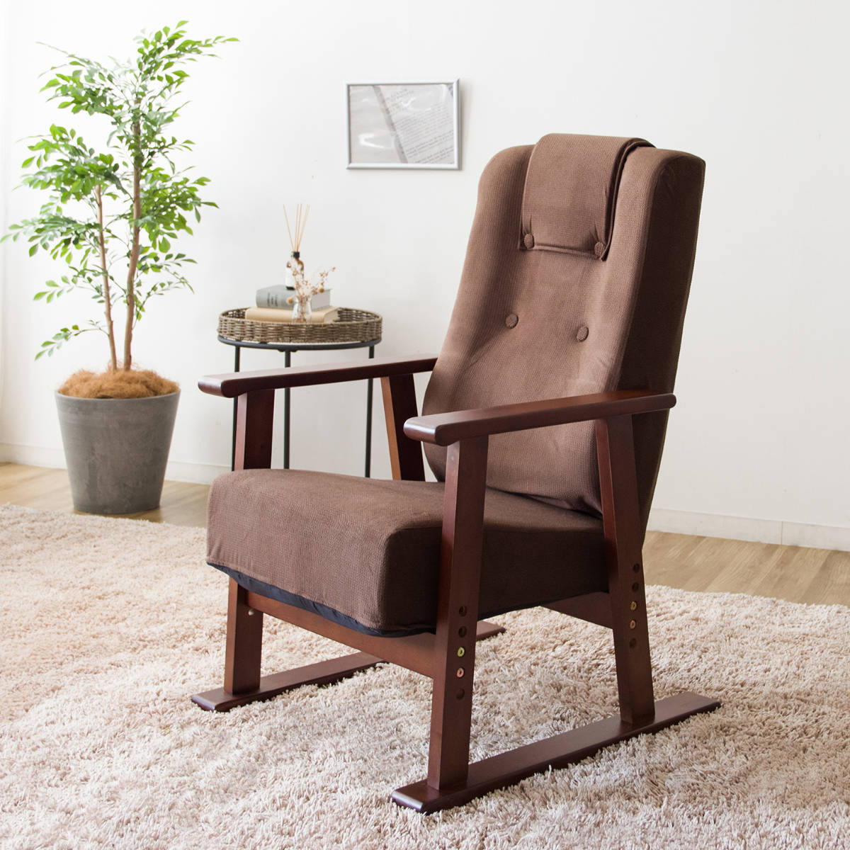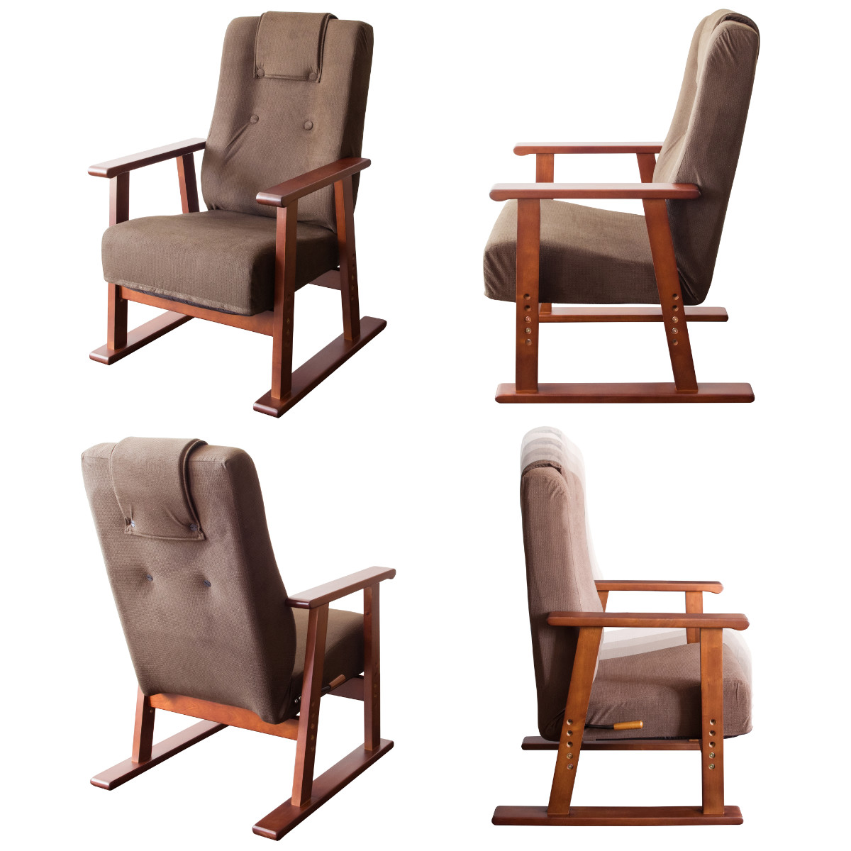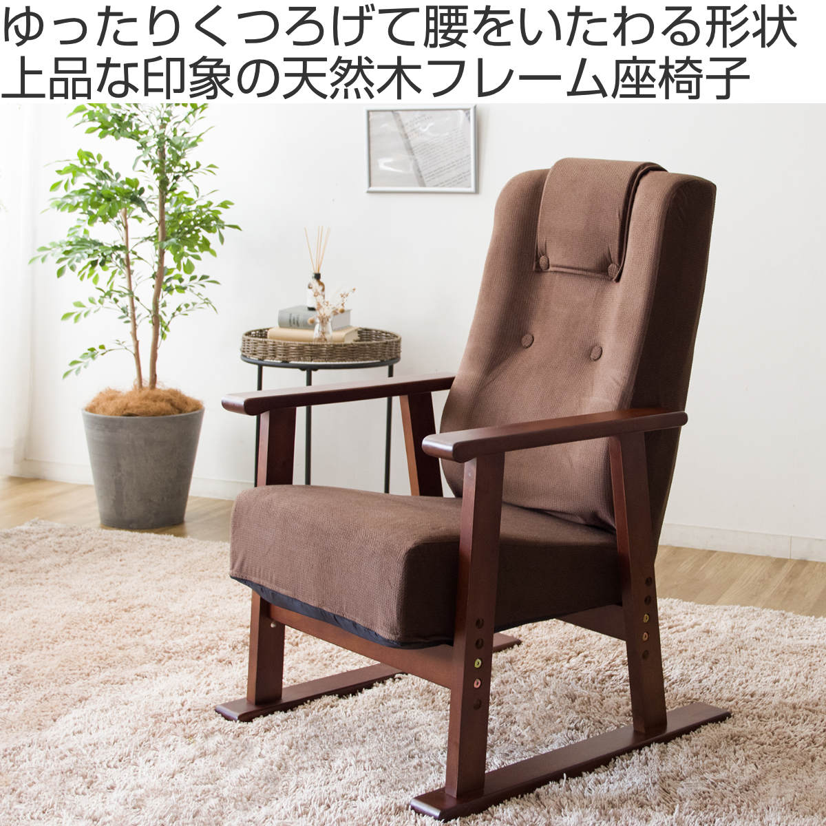 高座椅子 座面高39~48cm 肘掛け付き 13段階リクライニング Diano 日本製 ( 座いす レバー式 リクライニング 背もたれ 木製 天然木 ファブリック ハイバック 高さ調節 4段階 リクライニングチェア 完成品 ウレタン 和室 洋室 ) 【ブラウン】