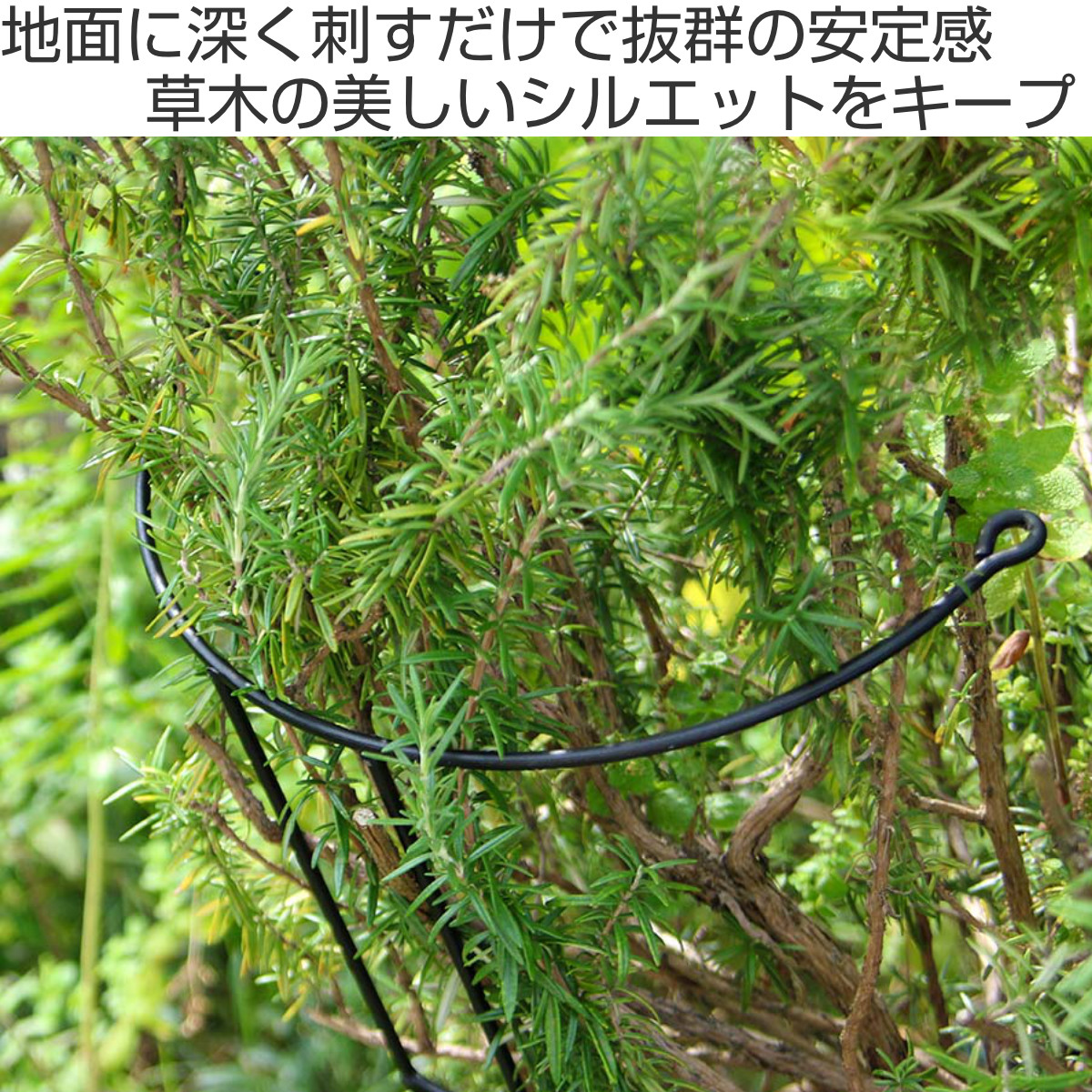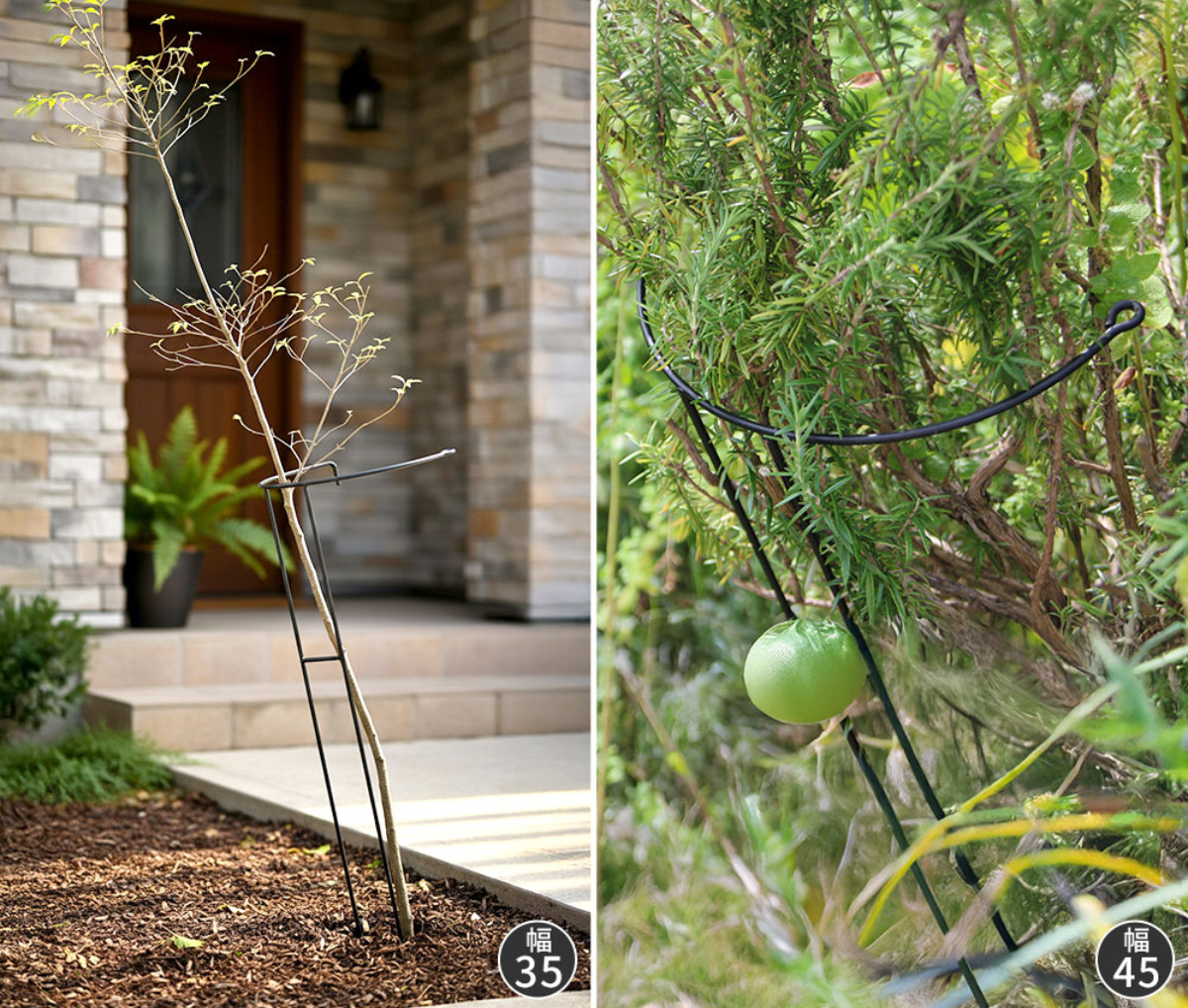 植物をさりげなくおしゃれに整える、アイアン製の植物サポーターは、マット調の6mm黒アイアンを使用し、頑丈でモダンな質感。広がりがちな植物をエレガントに固定します。茂りすぎたシュラブ(低木)や、植栽直後のシンボルツリー、重さのある果樹もしっかり支えます。地面に深く刺すだけで抜群の安定感。軽量で持ち運びもしやすく地植え、鉢植え、どちらにも使えます。