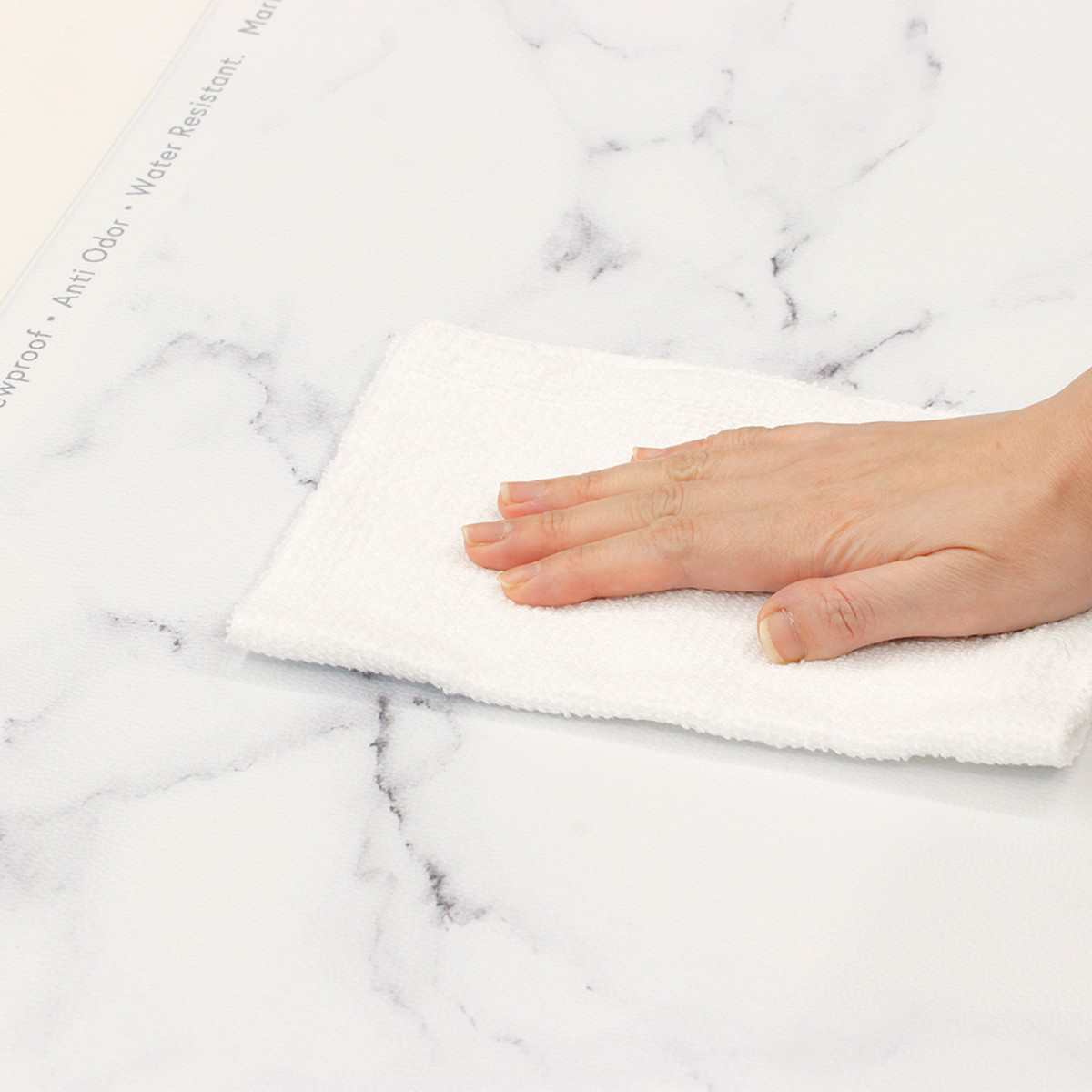 撥水性のあるPVC素材を使用しており、水しぶきや油汚れも、拭くだけで手軽にキレイになります。面倒なお洗濯の必要がないため、家事の時間短縮、水道代、電気代の節約にもなります。お手入れ簡単なのでキッチンだけでなく、洗面所や玄関などさまざまな場所で活躍します。