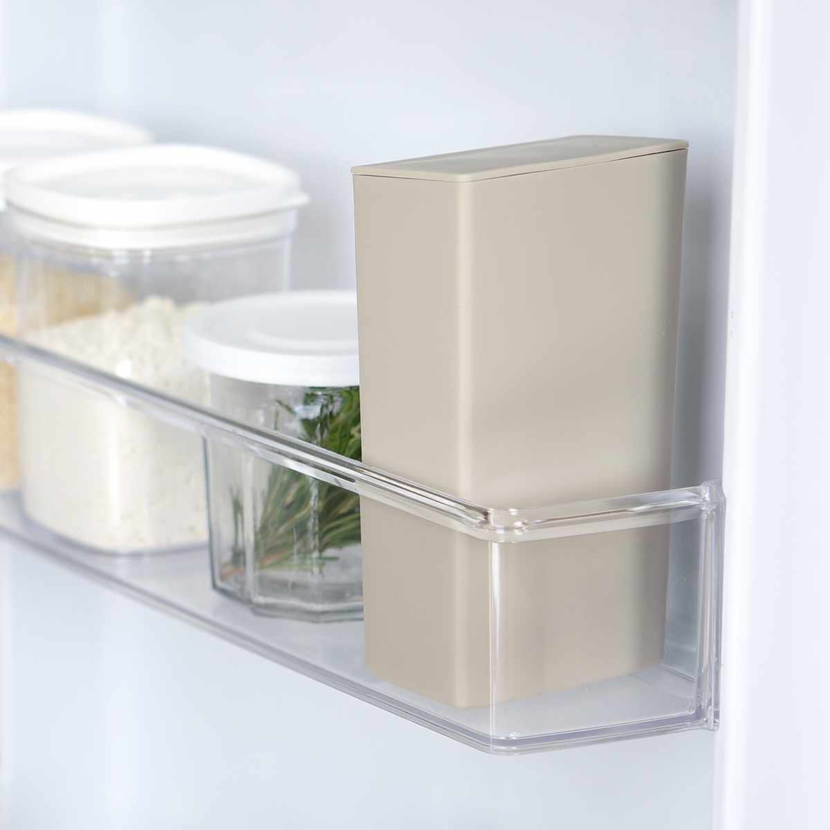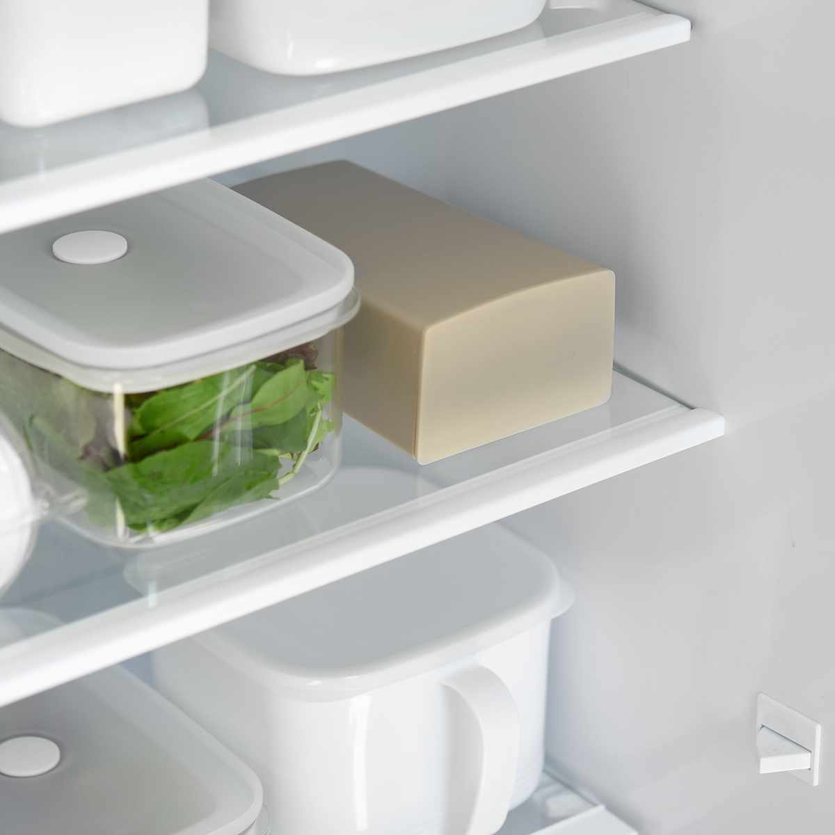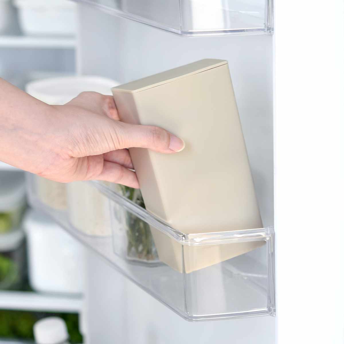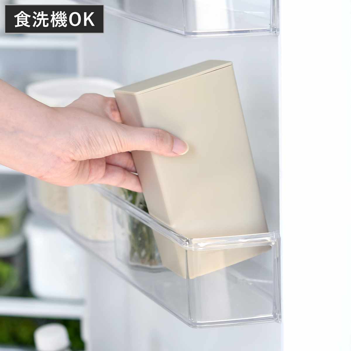 冷蔵庫のドアポケットや棚に立てて収納できるバターケースです。場所を取らずすっきり収まり、横置きよりも整理しやすいのが特徴です。冷蔵庫内をきれいに保ちたい方におすすめです。
