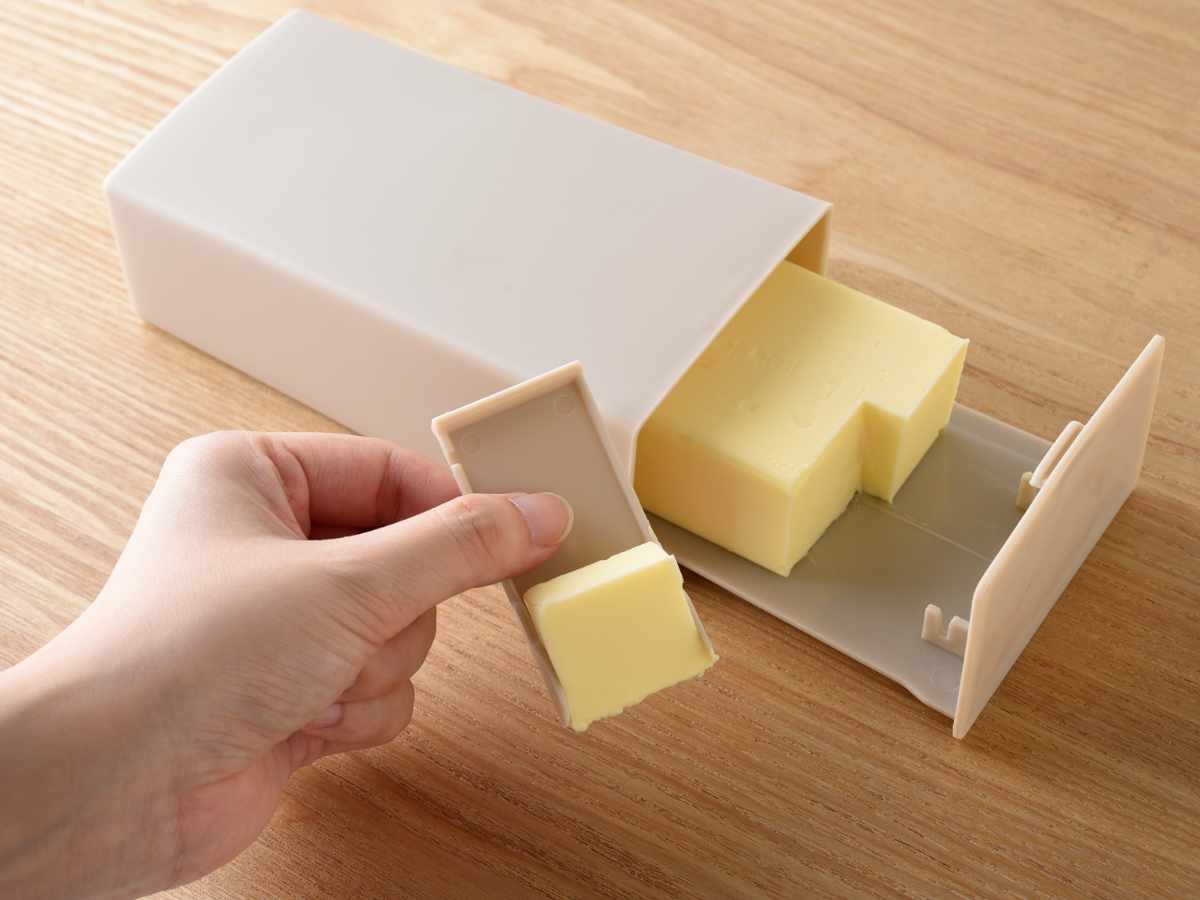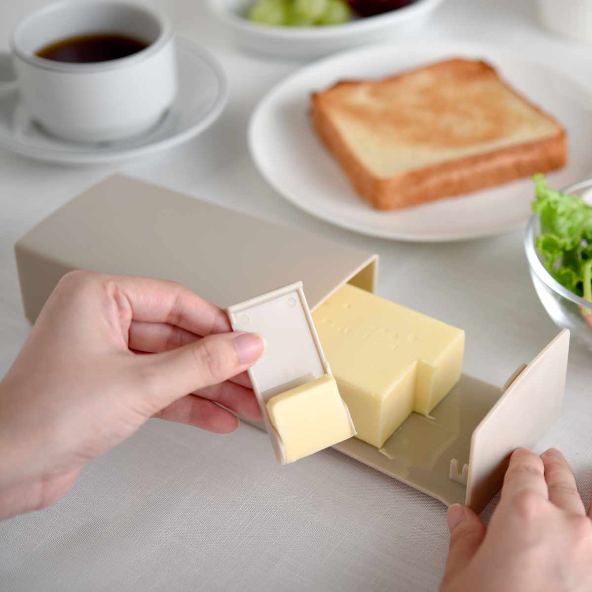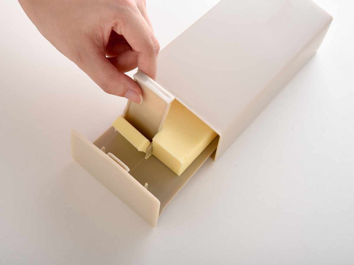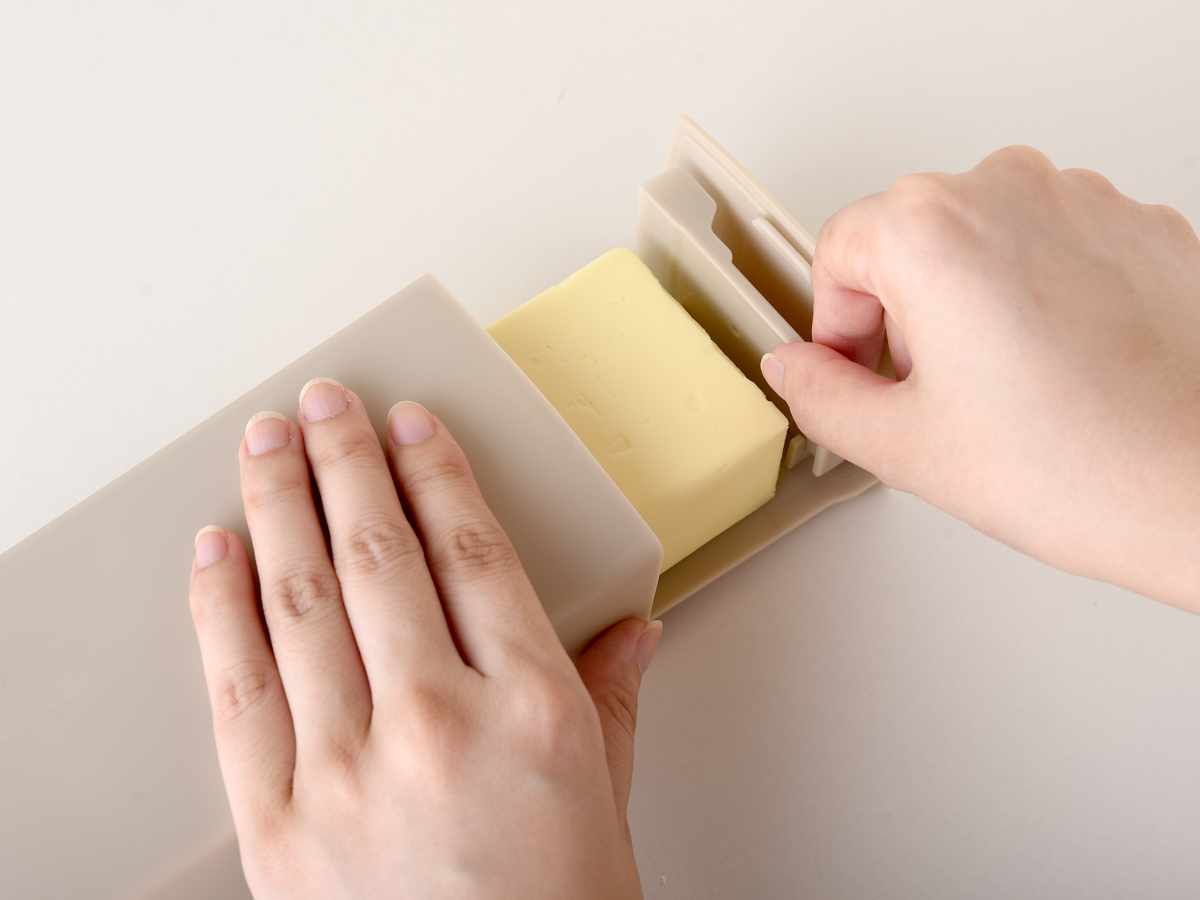 専用カッター付きで、ガイドに合わせるだけで200gのバターは約10g/5g、150gのバターは約8g/4gの目安で簡単にカットできます。刃先が斜めで刃離れが良く、使い終わったカッターはケース内にすっきり収納できます。