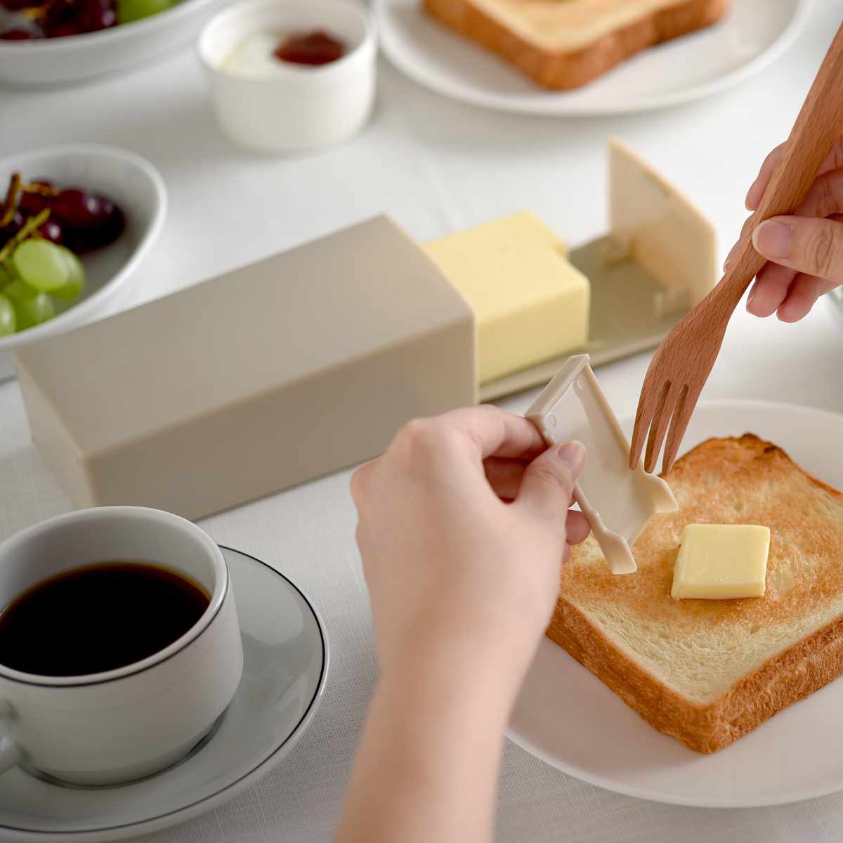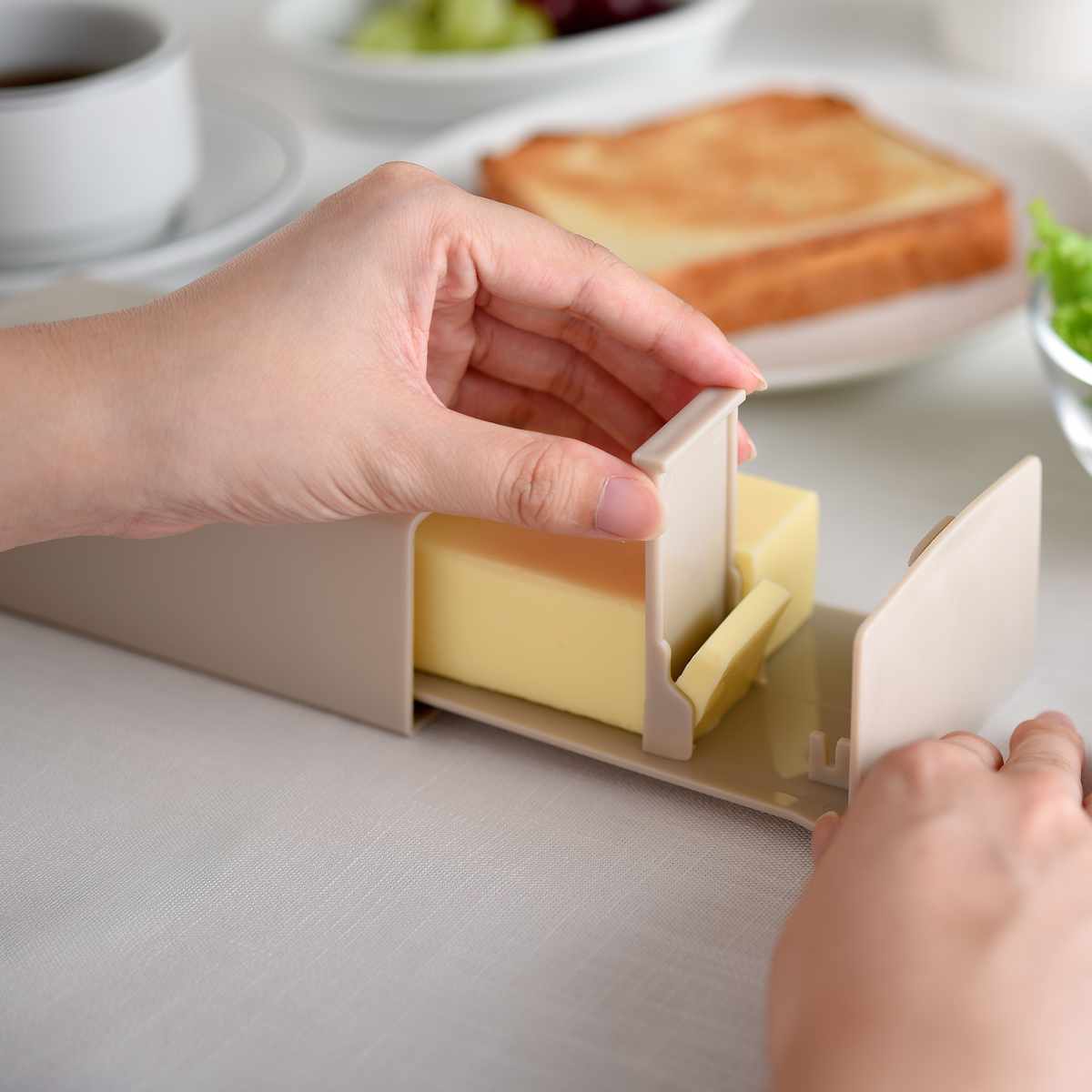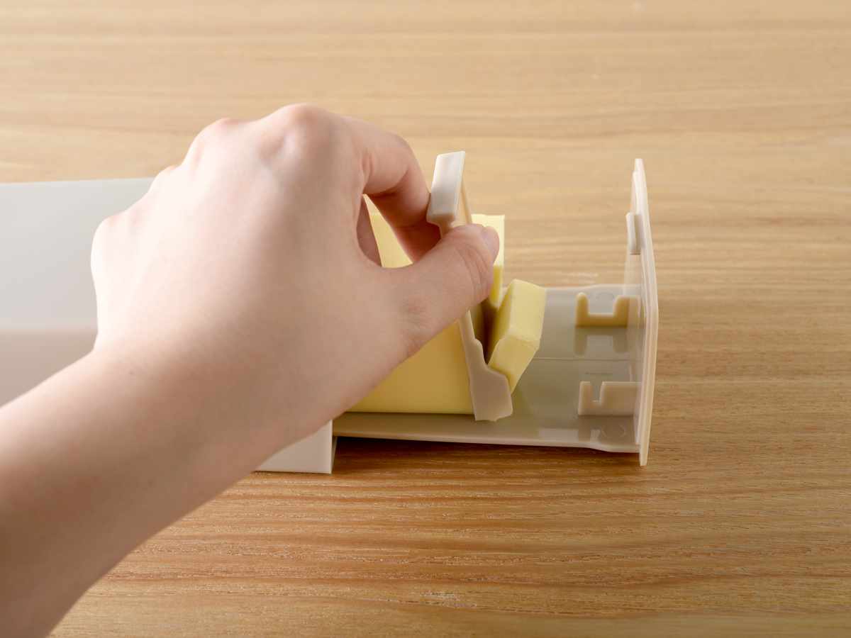 専用カッター付きで、ガイドに合わせるだけで200gのバターは約10g/5g、150gのバターは約8g/4gの目安で簡単にカットできます。刃先が斜めで刃離れが良く、使い終わったカッターはケース内にすっきり収納できます。