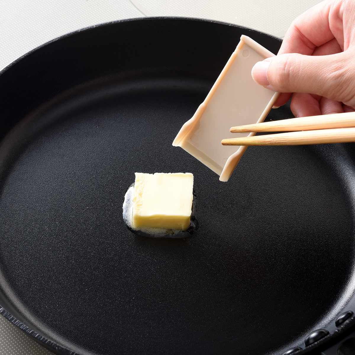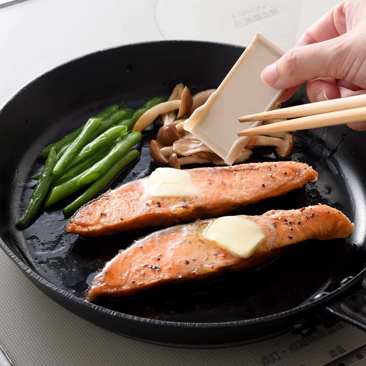 専用カッターでカットしたバターは、そのままパンに乗せたり料理に使ったりと便利です。ムニエルの仕上げにひとかけ乗せたり、フライパンにサッと入れたりと、必要な量をすぐ使えるため調理がスムーズに進みます。