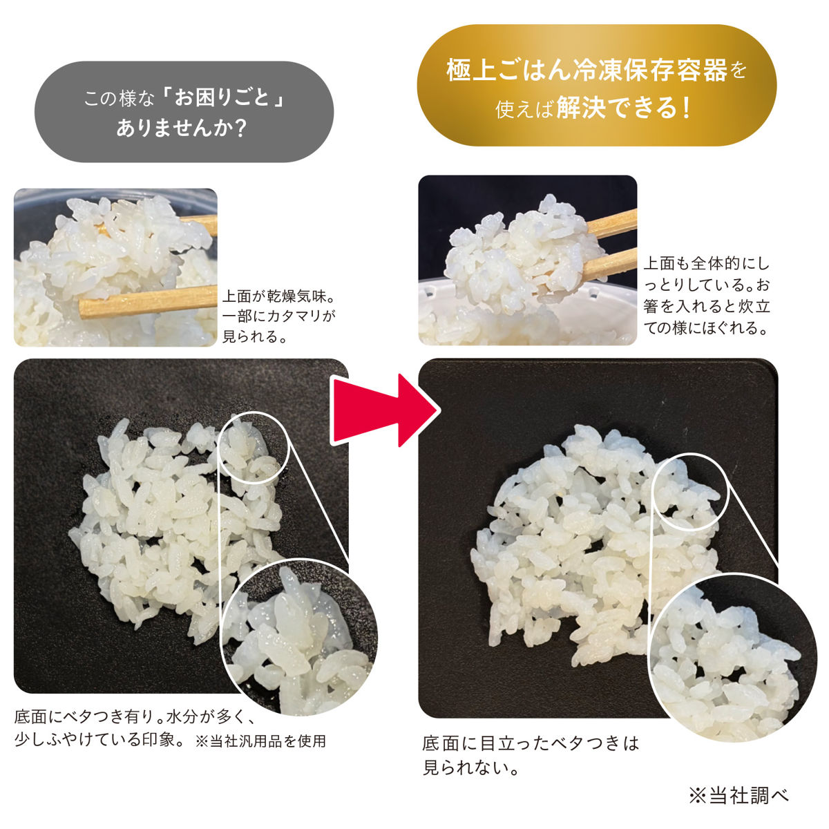 ●粗熱を取らずに炊き立てごはんを冷凍できる保存容器です。