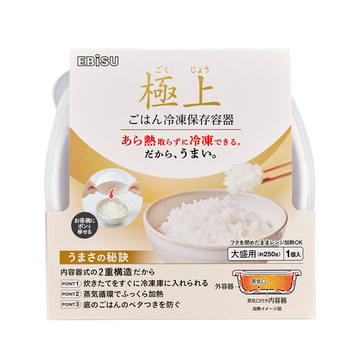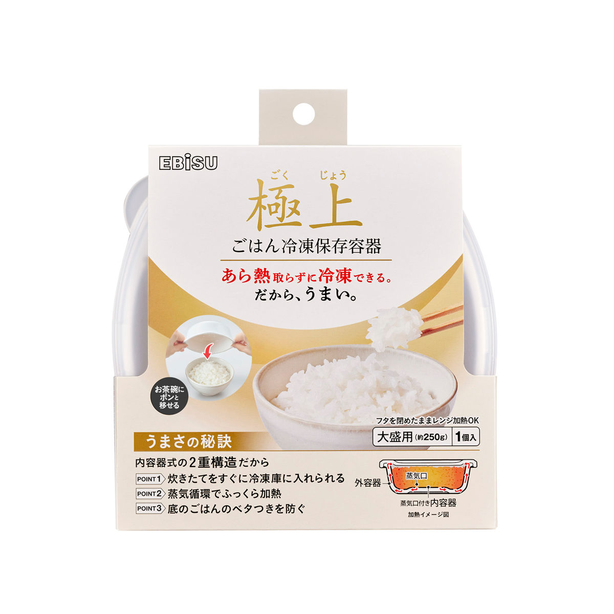 粗粗熱を取らずに炊き立てごはんを冷凍できる保存容器です。内容器式の二重構造により、熱々のごはんを入れても容器の外側が熱くなりにくく、炊き立てをすぐに冷凍できます。そのため、味も損ないません。