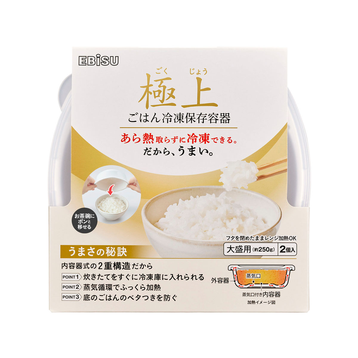 粗粗熱を取らずに炊き立てごはんを冷凍できる保存容器です。内容器式の二重構造により、熱々のごはんを入れても容器の外側が熱くなりにくく、炊き立てをすぐに冷凍できます。そのため、味も損ないません。