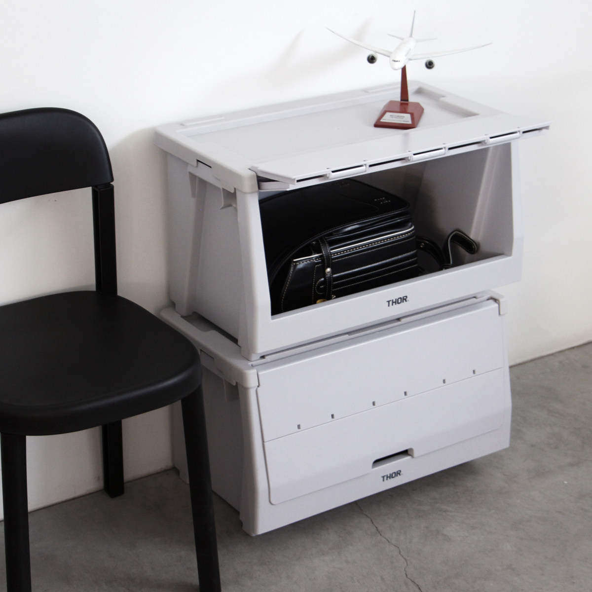 ●本体、蓋、扉を組み合わせて自分好みの棚を作ることができるTHORスタッキングシェルフコンテナ 50L 前扉のみです。