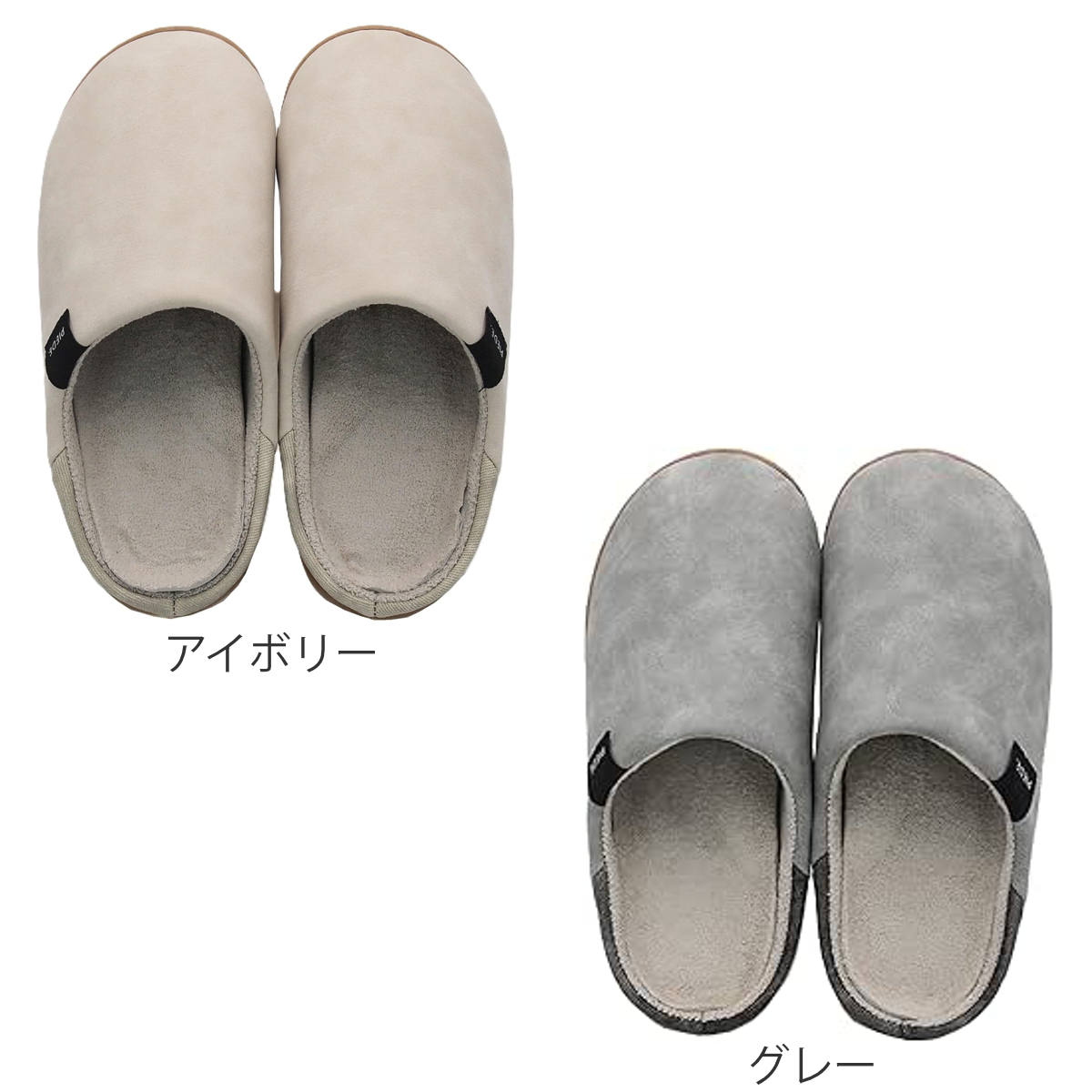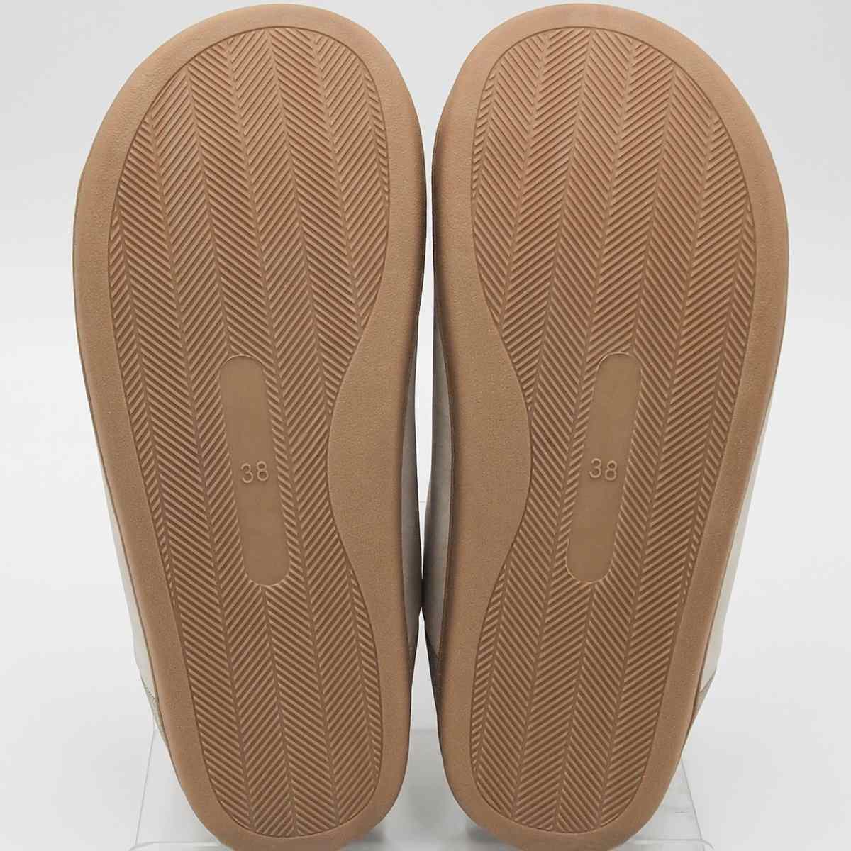 甲部分には、自然なムラ感を表現したフェイクレザーを使用。均一すぎない表情が、素材本来の風合いを引き立て、落ち着いた高級感を演出します。シンプルながらも奥行きのあるデザインで、ナチュラルなお部屋にもすっとなじむ一足です。
