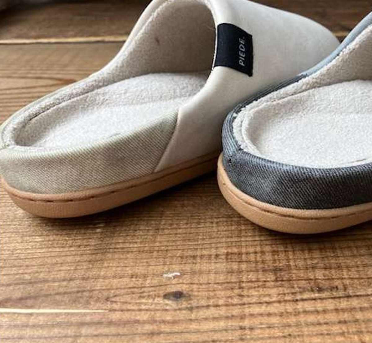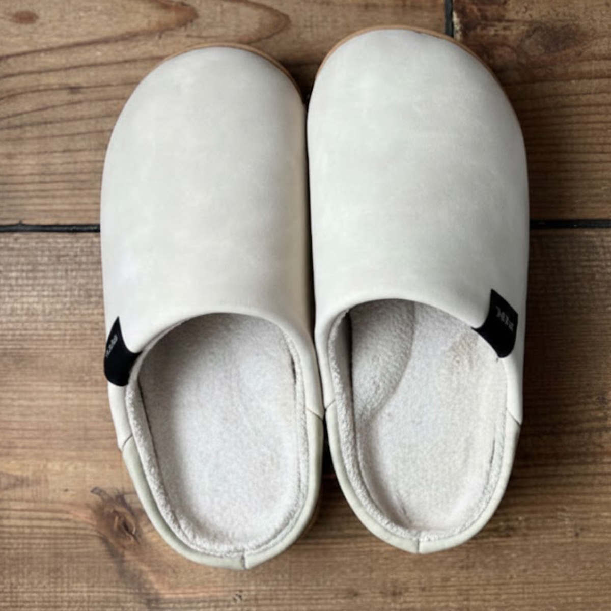 甲部分には、自然なムラ感を表現したフェイクレザーを使用。均一すぎない表情が、素材本来の風合いを引き立て、落ち着いた高級感を演出します。シンプルながらも奥行きのあるデザインで、ナチュラルなお部屋にもすっとなじむ一足です。