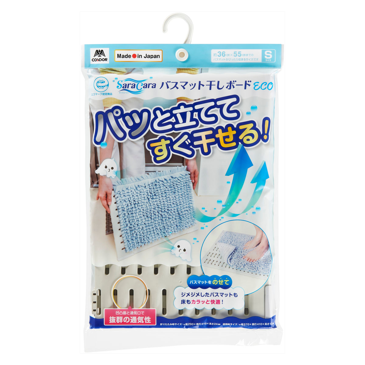 床面を湿気から守る抗菌加工が施されたバスマット干しボードです。優れた通気性で湿気がたまりやすいバスマットをサラッとキープしてくれます。また、床面も湿気やカビの発生から守ってくれます。最後に使う人のぐっしょり感を軽減してお風呂上がりがより快適になります。地球にやさしいエコマーク認定商品です。