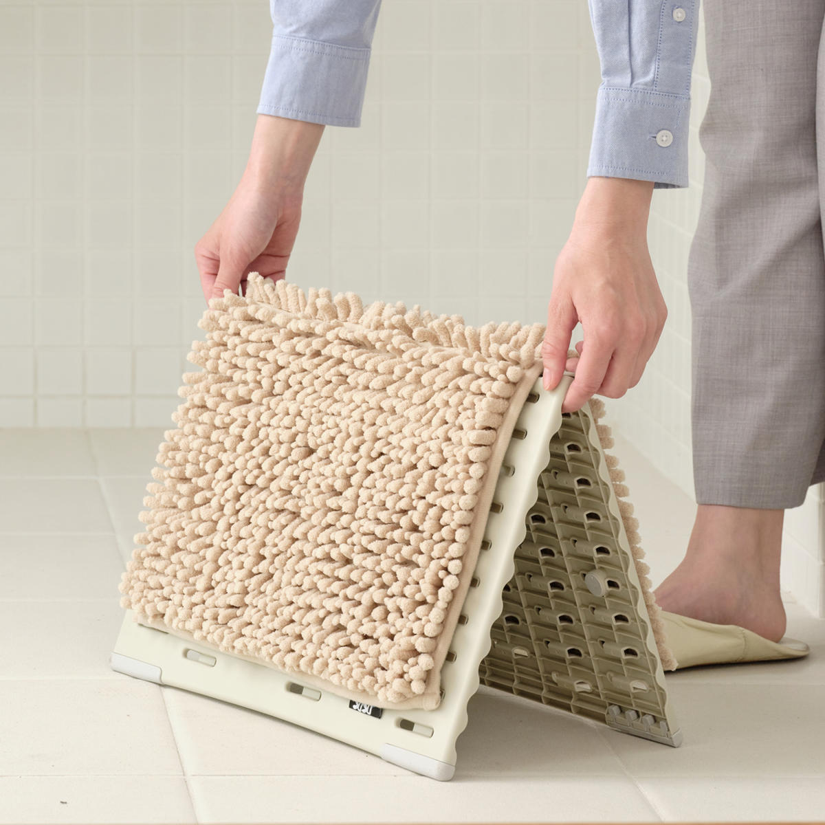 使い終わった後はその場に立ててバスマットを干すことができる優れもの。ベランダなどに干しに行く手間がなく、バスマットを置いたままボードを山折りにするだけ。ワンアクションで干せる手軽さです。