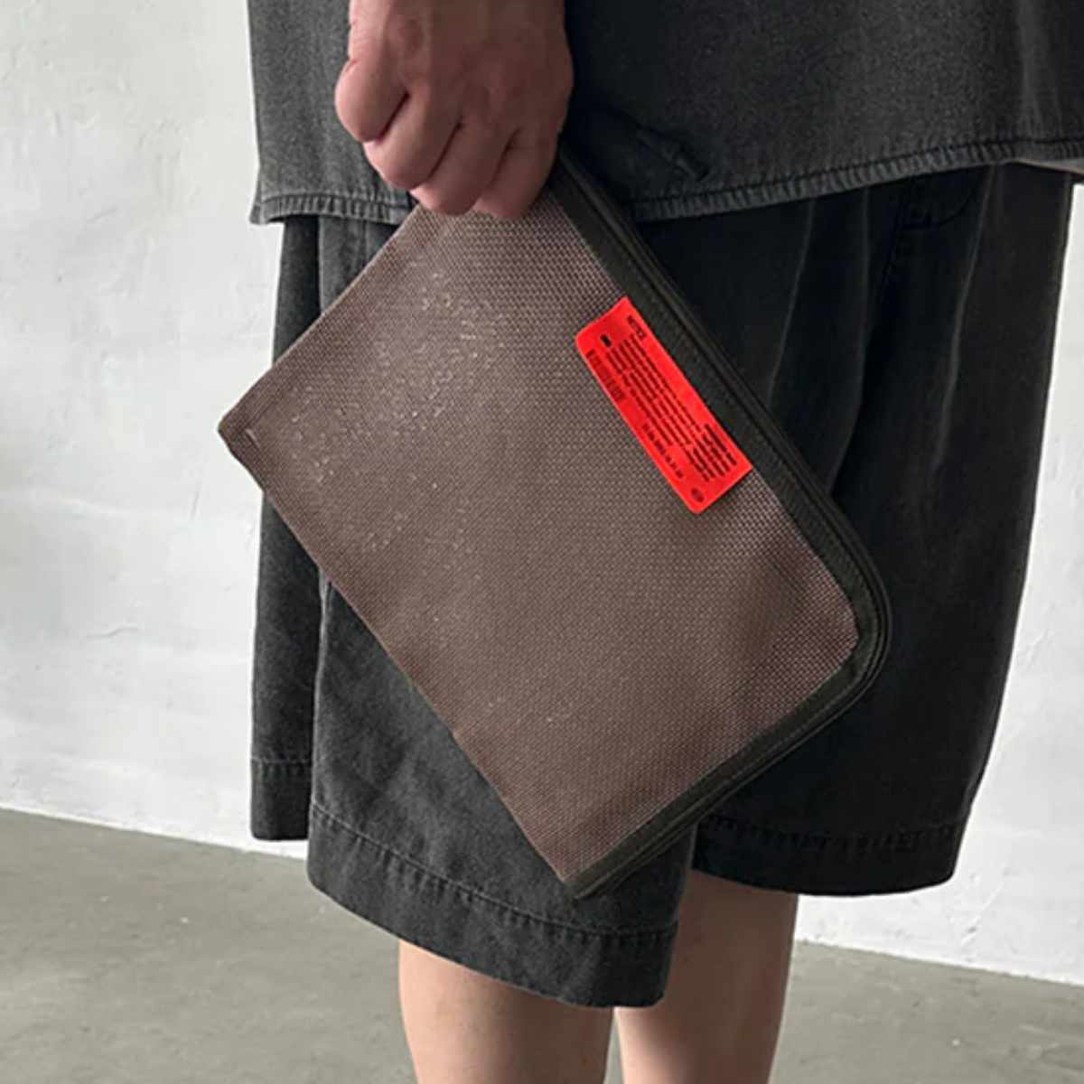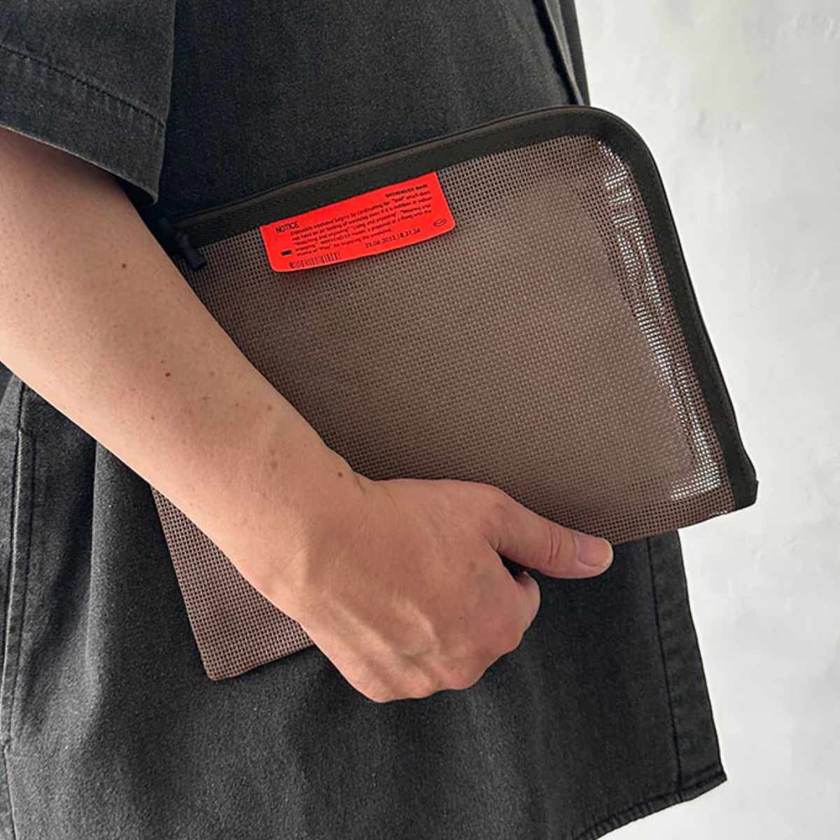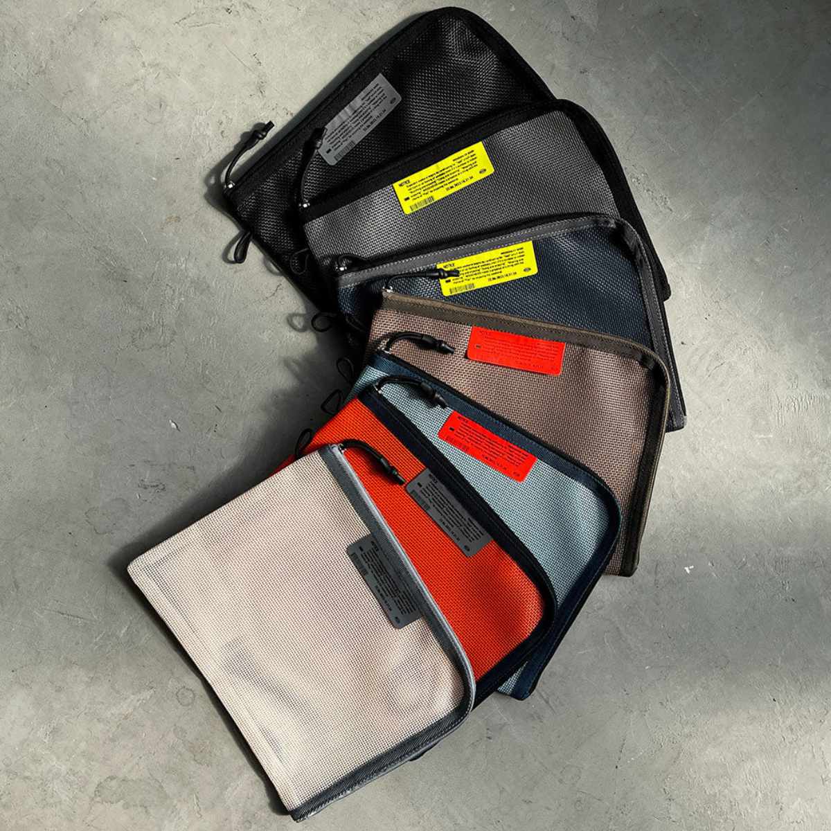 海外の業務用アイテムのような配色を取り入れたポーチです。ファスナーはL字に開くので出し入れがしやすく、中身がひと目で確認できます。ちょっとした移動時にも気軽に持ち出せて、手に持ち続けても負担になりにくい仕様です。