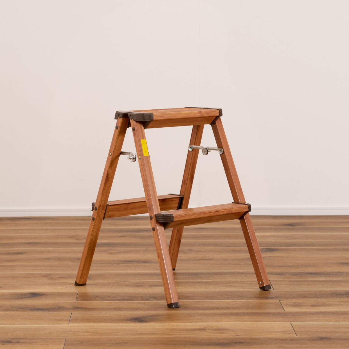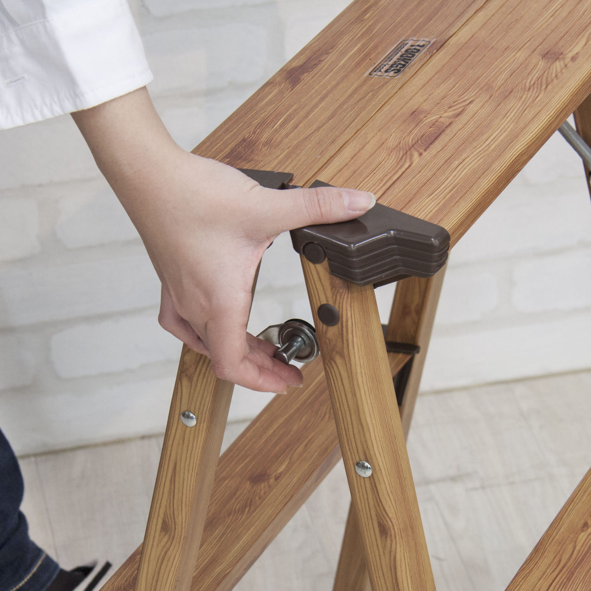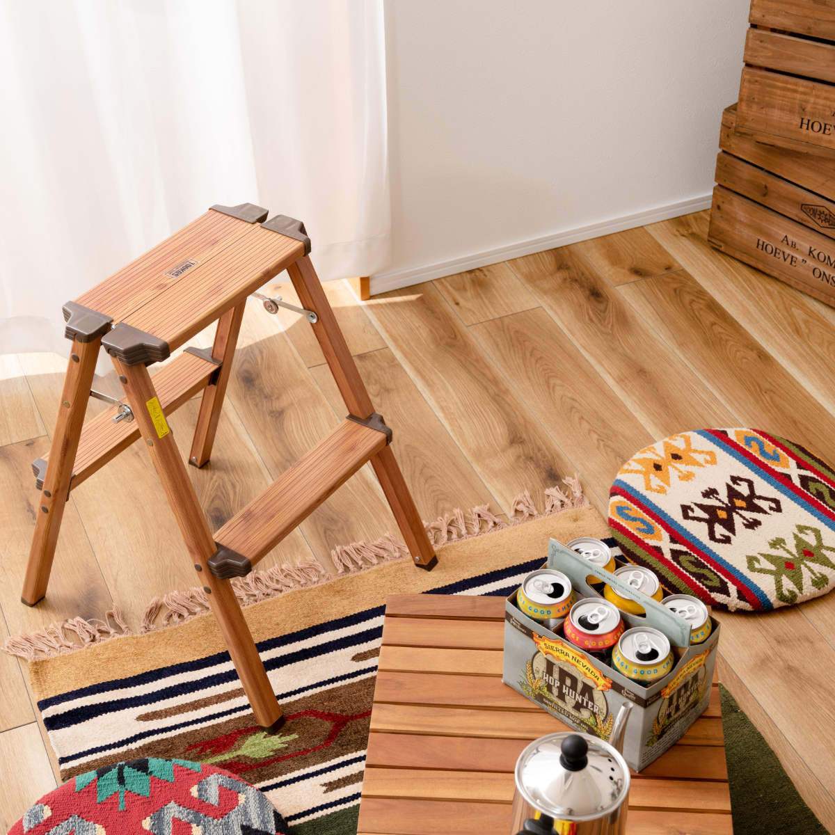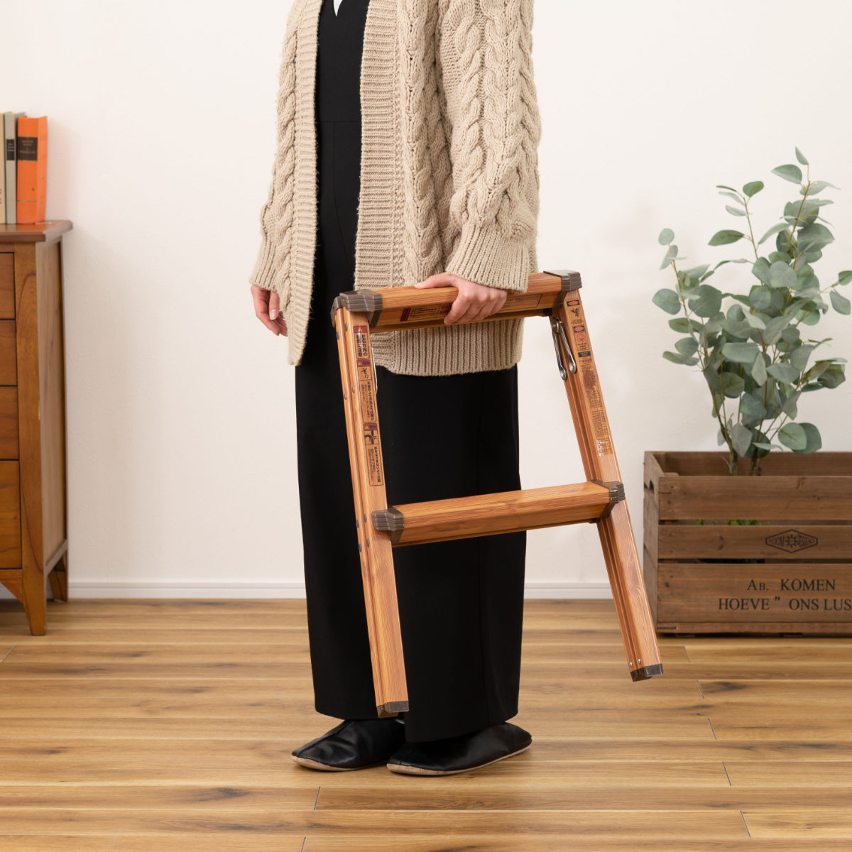 アルミ製で軽く扱いやすいのに、見た目はあたたかみのある木目調仕上げのスツールです。無機質になりがちな脚立の印象をやわらげ、インテリアにも自然になじむデザインです。