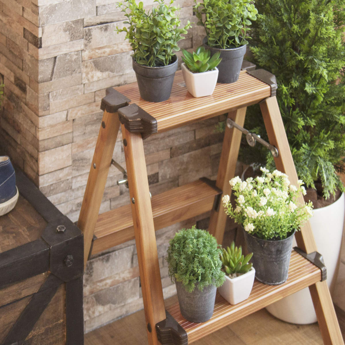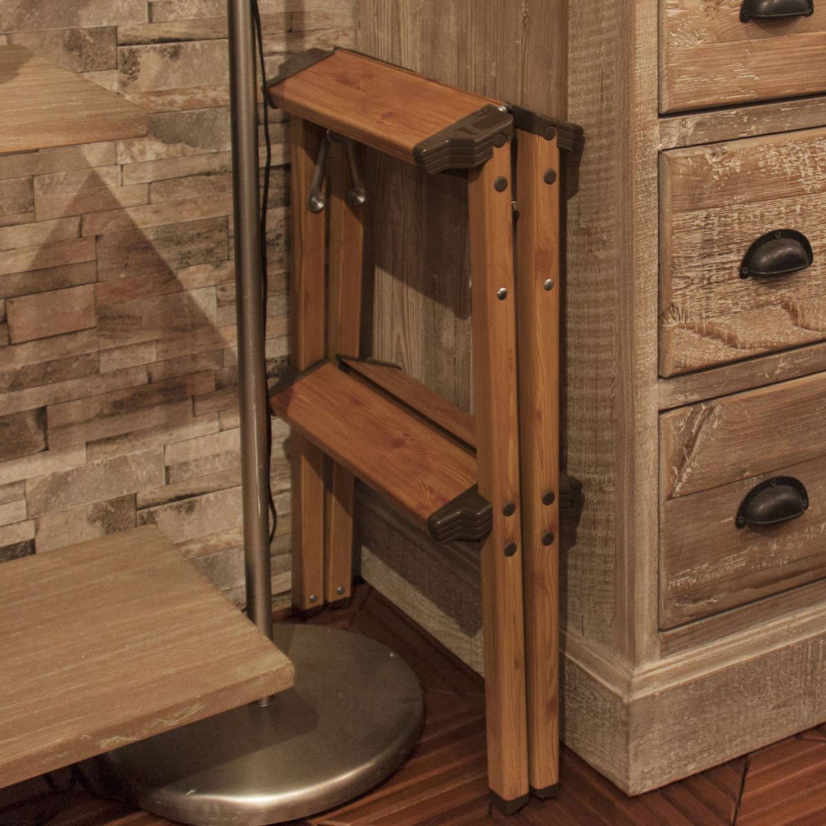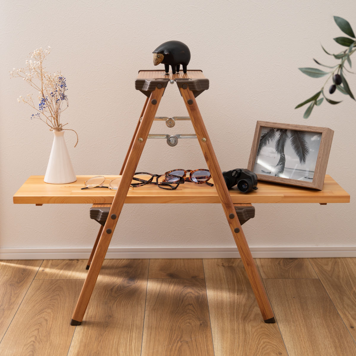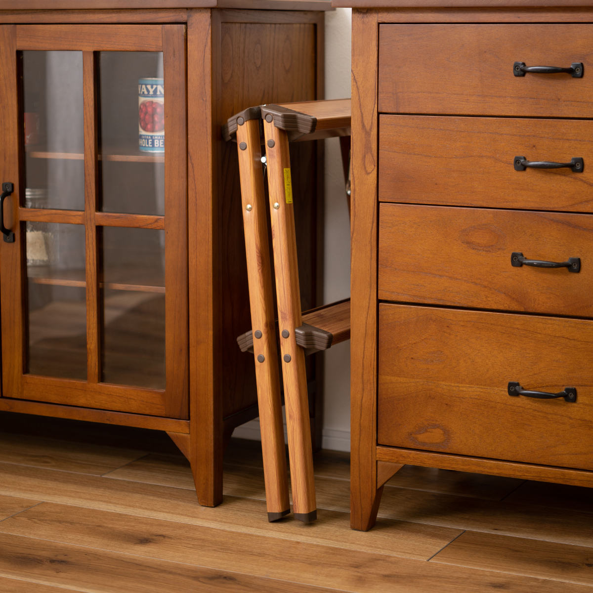 アルミ製で軽く扱いやすいのに、見た目はあたたかみのある木目調仕上げのスツールです。無機質になりがちな脚立の印象をやわらげ、インテリアにも自然になじむデザインです。