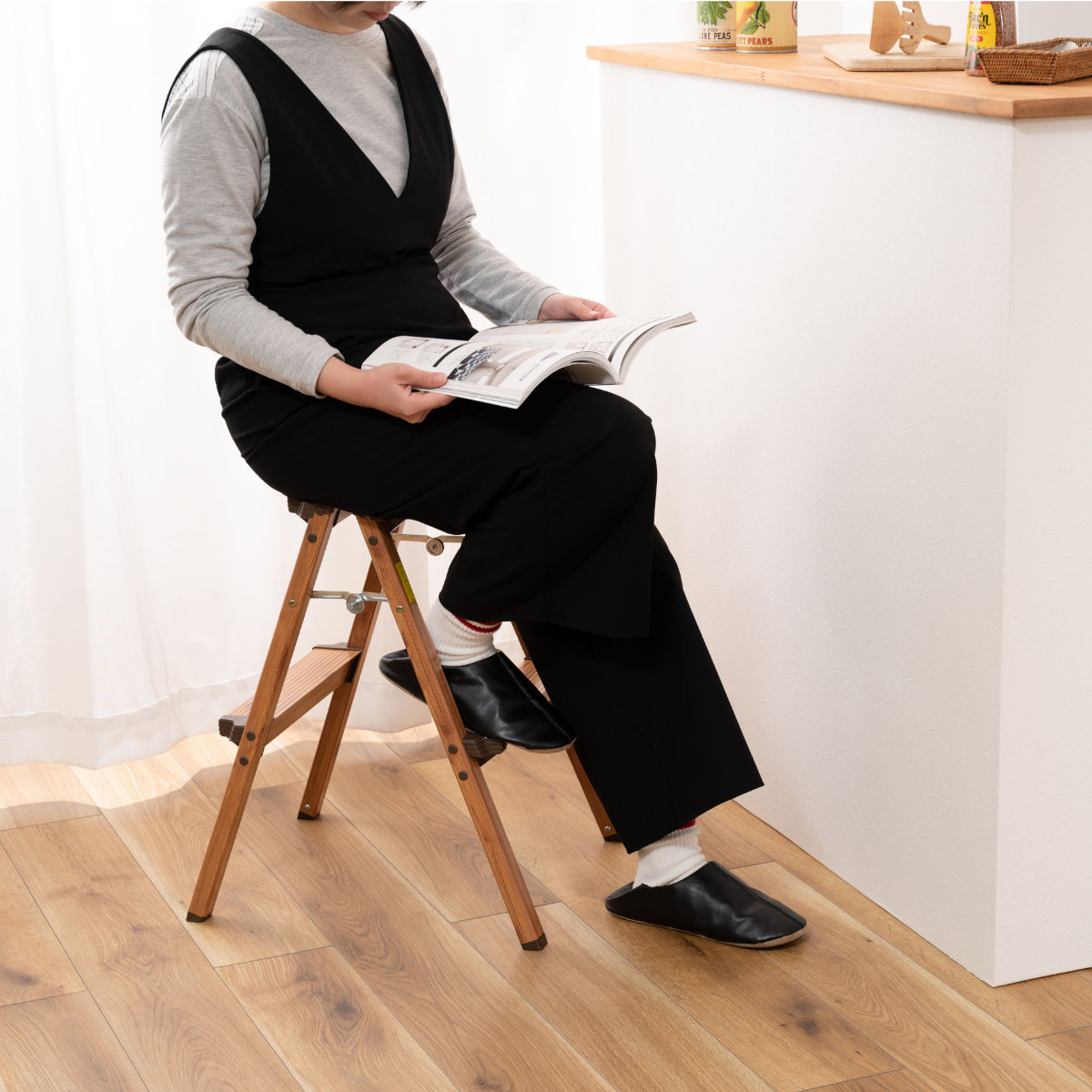 スツールとしても使える安定感のあるつくり。読書やちょっとした休憩時にも気軽に腰掛けられます。脚立としてだけでなく、日常に取り入れやすい一台です。