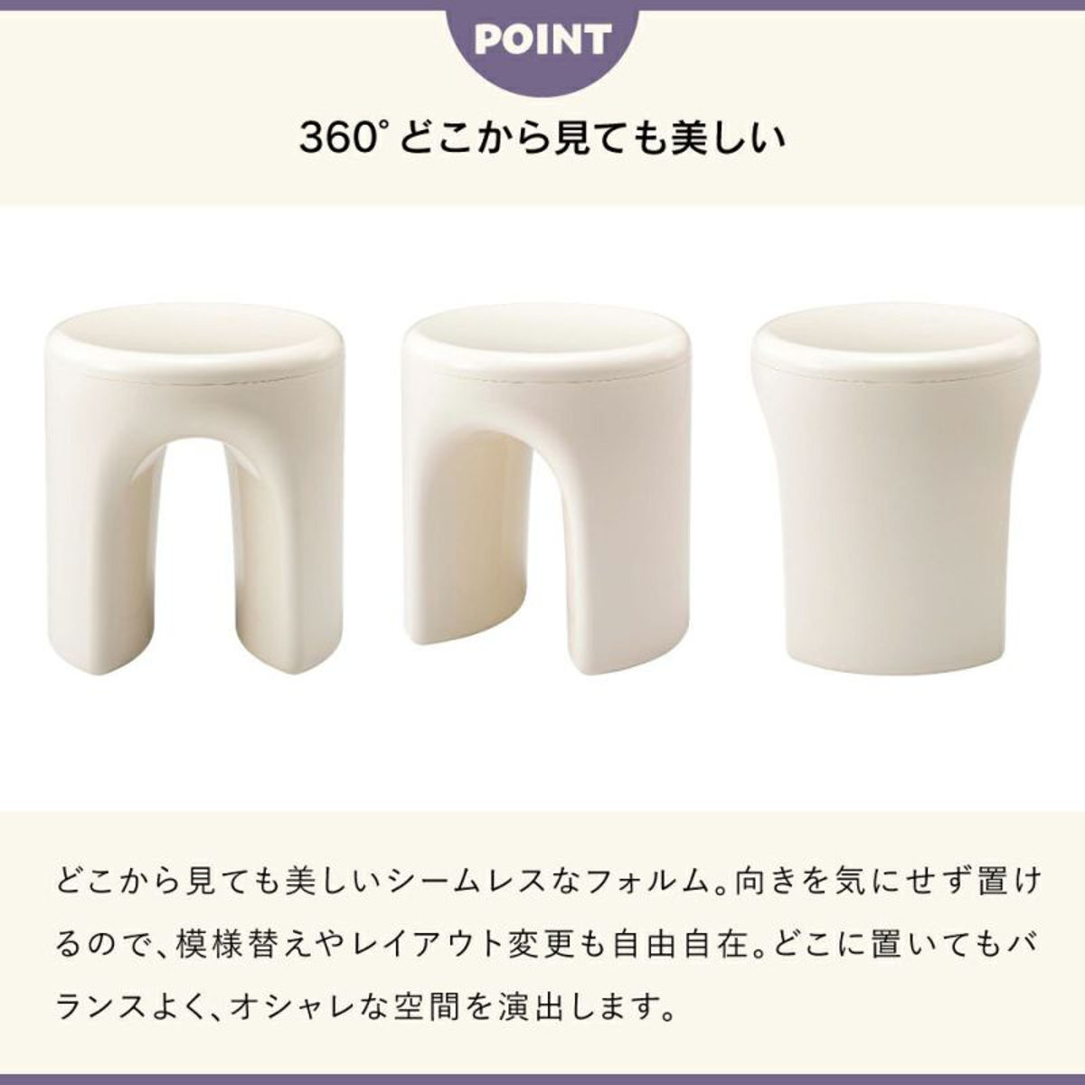 シンプルながら、オブジェのような存在感を放つスツール。どんなインテリアにもなじみやすく、空間のアクセントとしても活躍します。向きを選ばないシームレスなフォルムで、置く場所を選ばず美しく決まります。