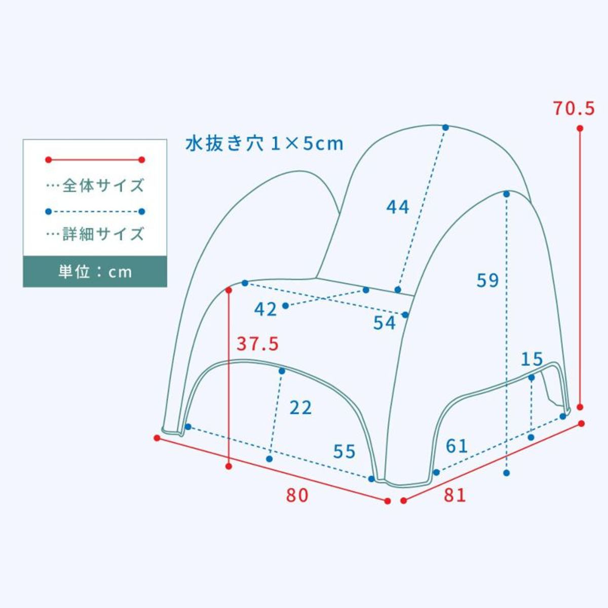 座面には水抜き穴を設けているため、水が溜まりにくい設計。雨に濡れた後や丸洗いした際も乾きやすく、屋外でも快適に使えます。