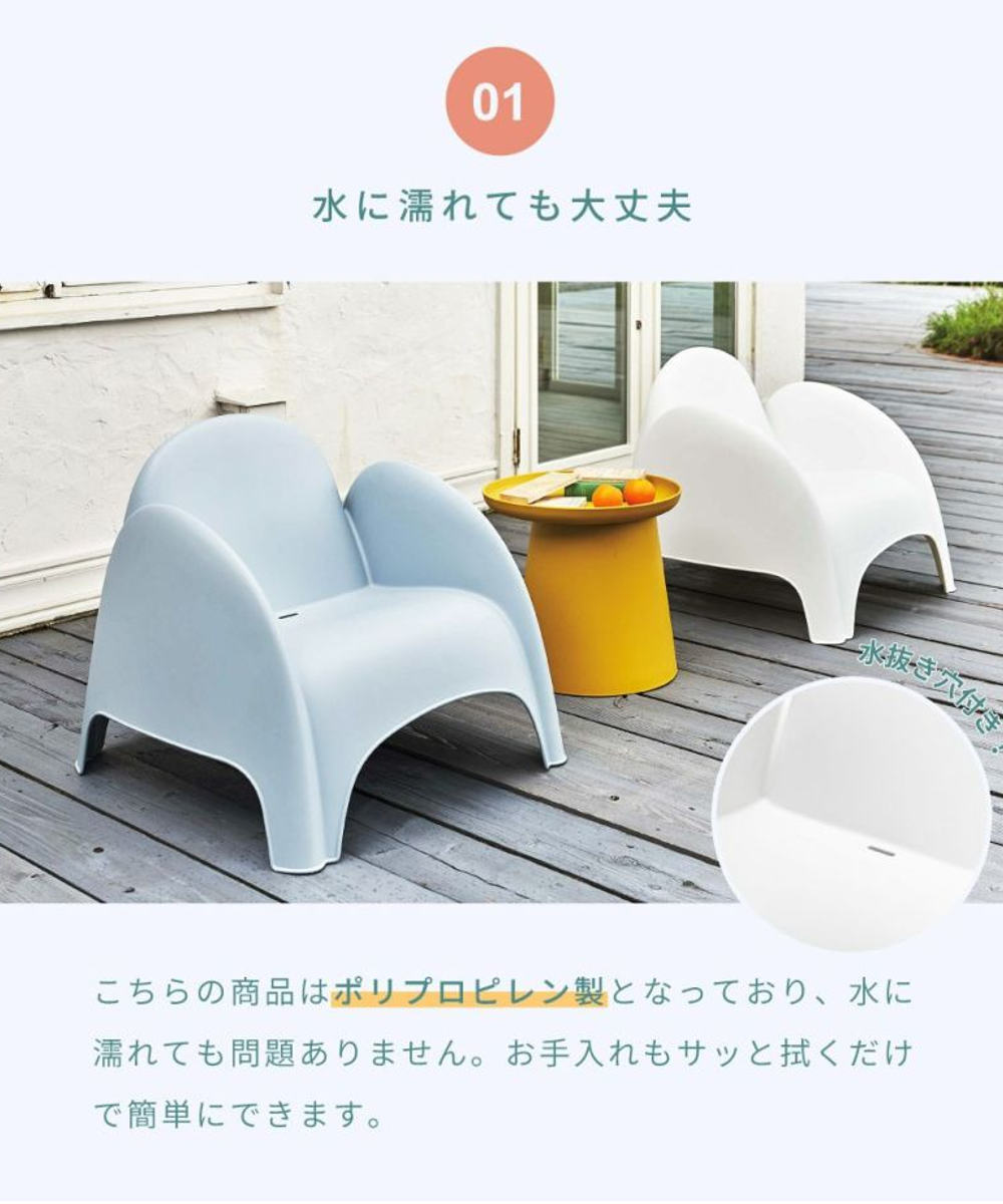 ポリプロピレン素材を使用しているため、水に濡れても安心。汚れてもサッと拭くだけでお手入れでき、屋外使用にも適しています。