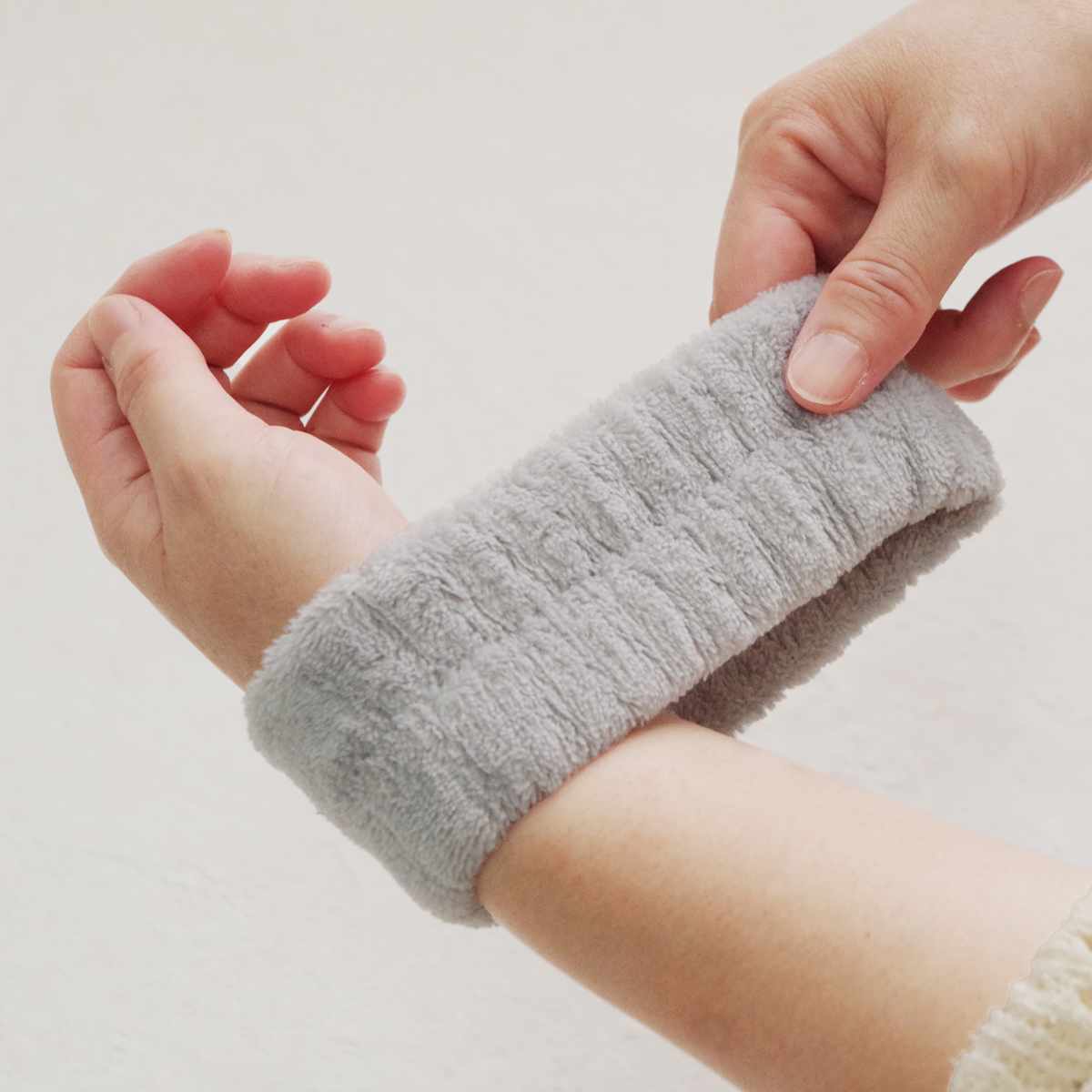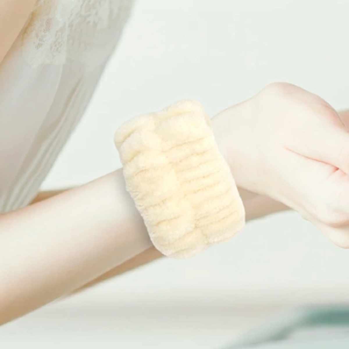 洗顔中など、腕を伝った水で袖や床が濡れるのを防ぐ吸水アームバンドです。手首に装着するだけで洗顔中の水滴をしっかり吸収し、衣類や床を清潔に保ちます。