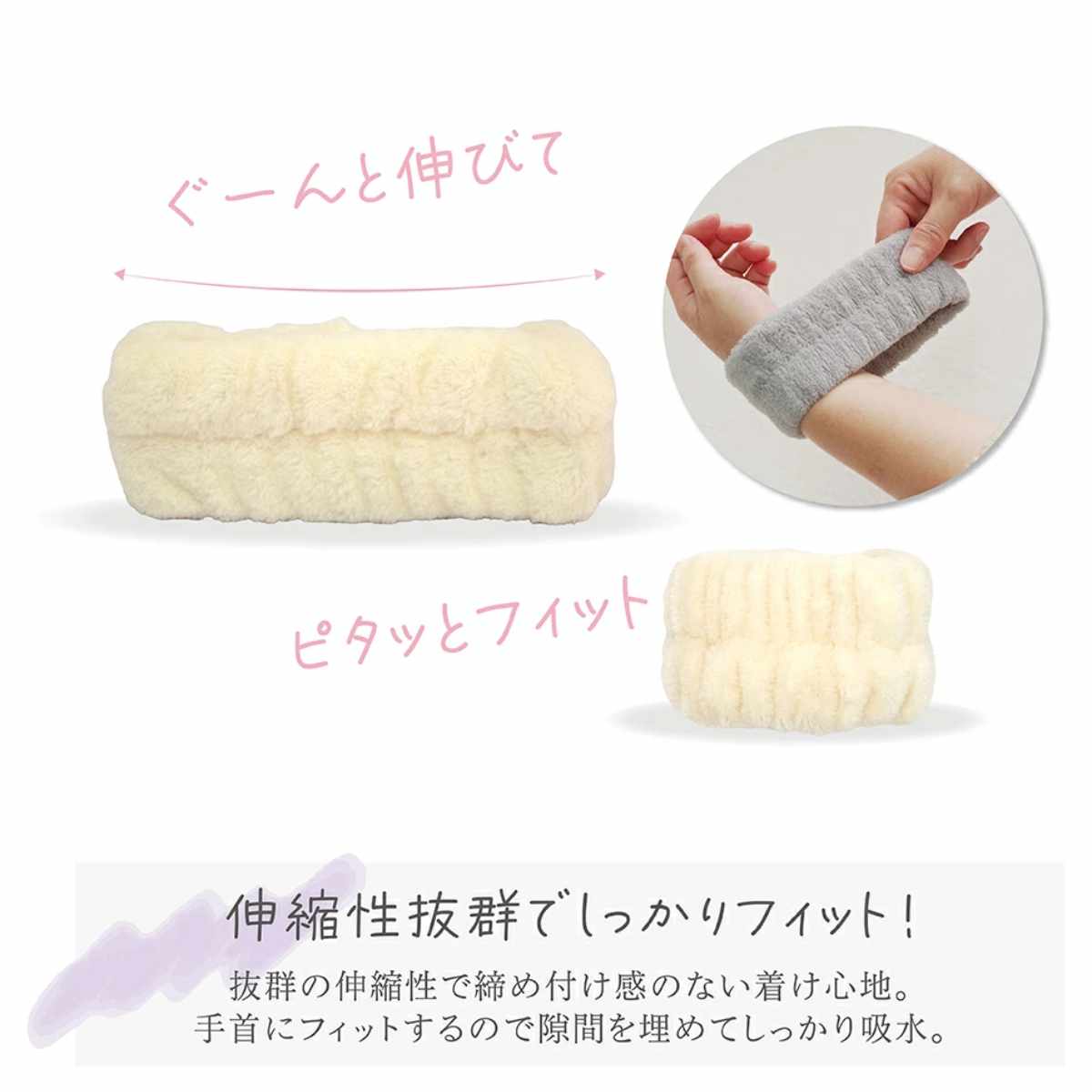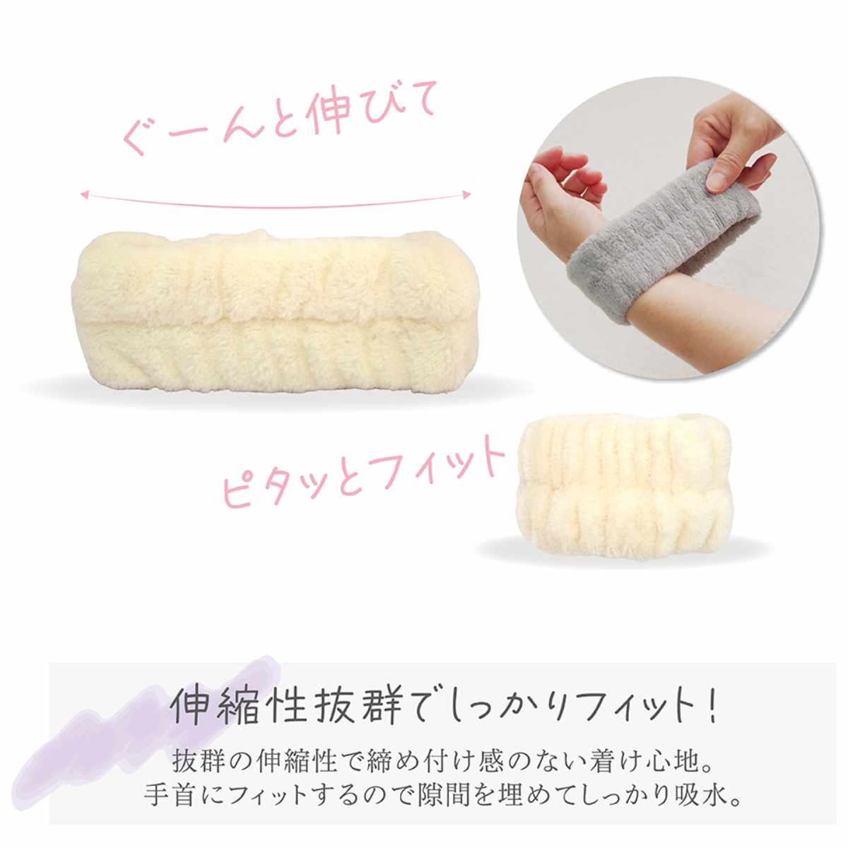 伸縮性に優れ、締め付け感のないやさしい着け心地です。手首にしっかりフィットし、隙間を埋めて水滴を吸収します。