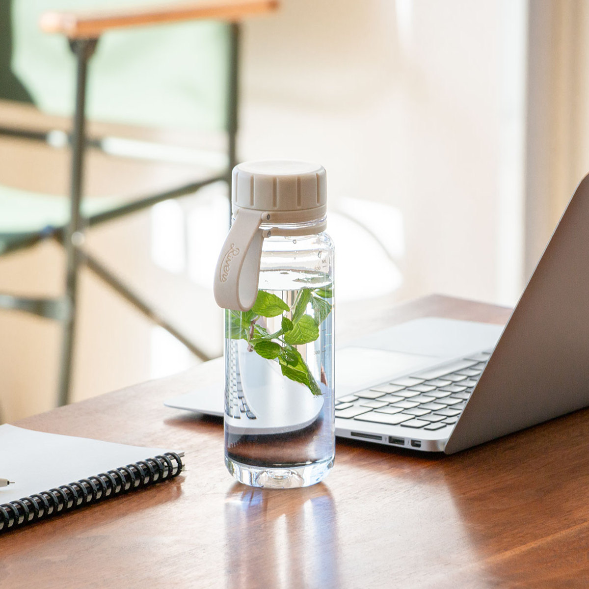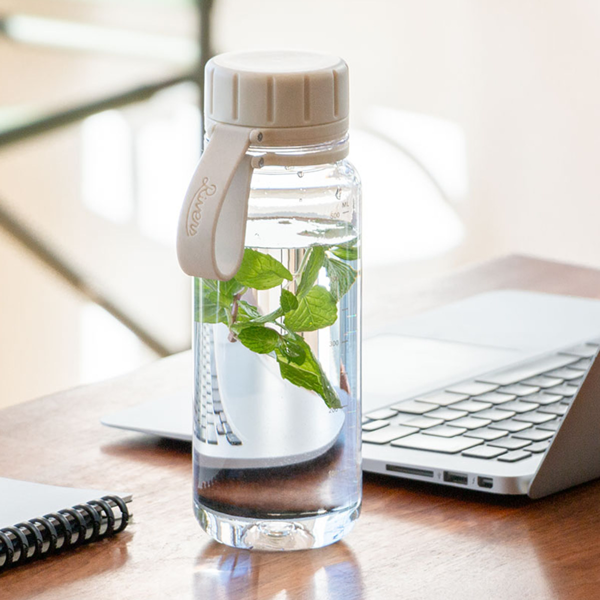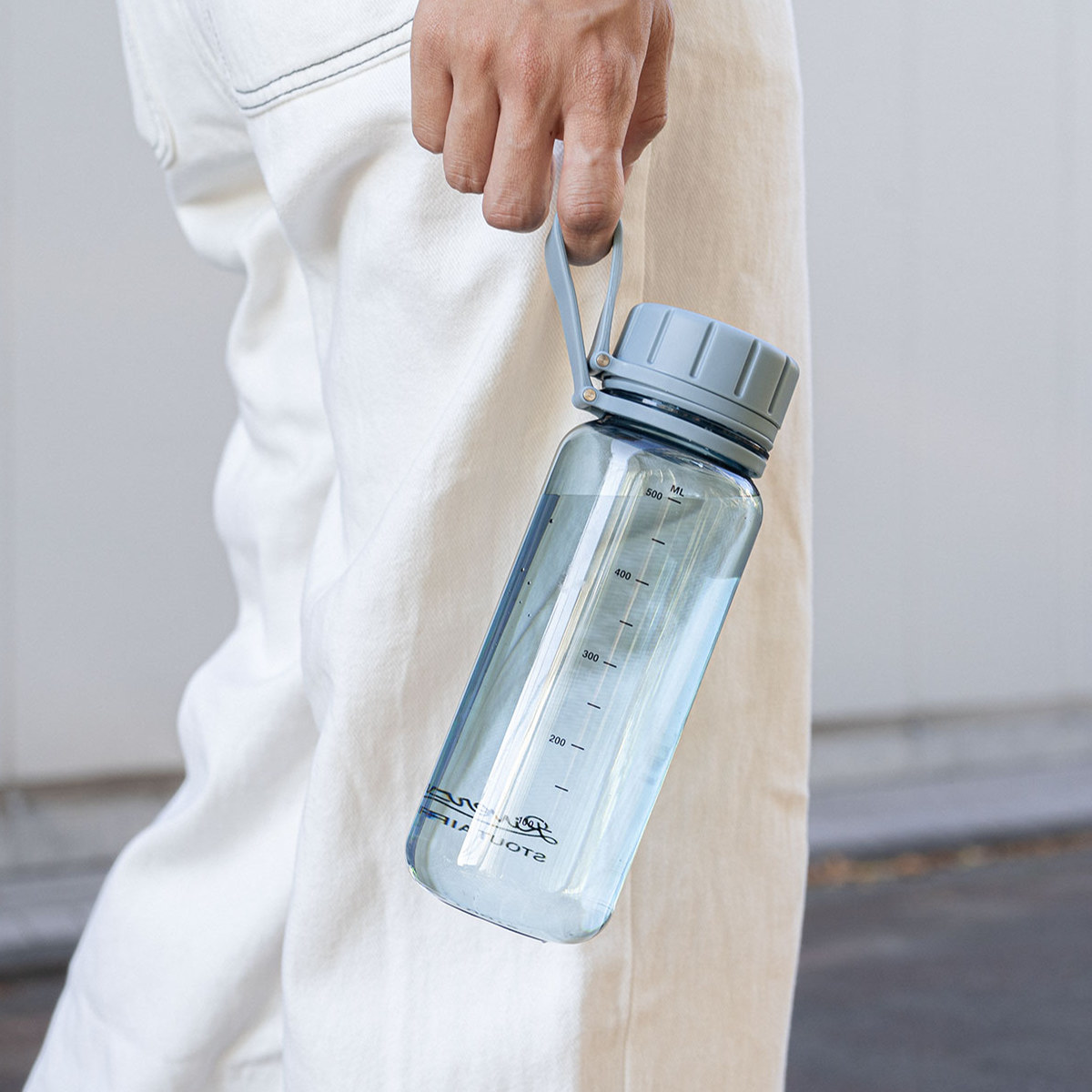 蓋の紛失を防ぐシリコーンストラップ付きで、持ち運び時のハンドルとしてはもちろん、カラビナを取り付けてバッグに装着することもできます。ボトルには目盛りが付いているので、残量確認がしやすく、調理時の簡易計量にも便利。さらに、飲み口には水が勢いよく飛び出すのを防ぐ中フタ付きで、快適な飲み心地をサポートします。