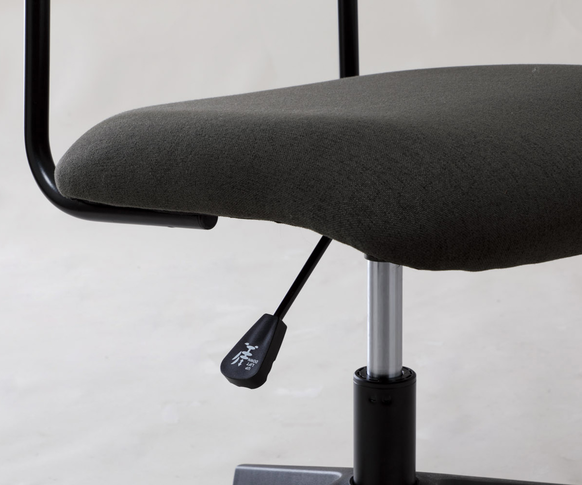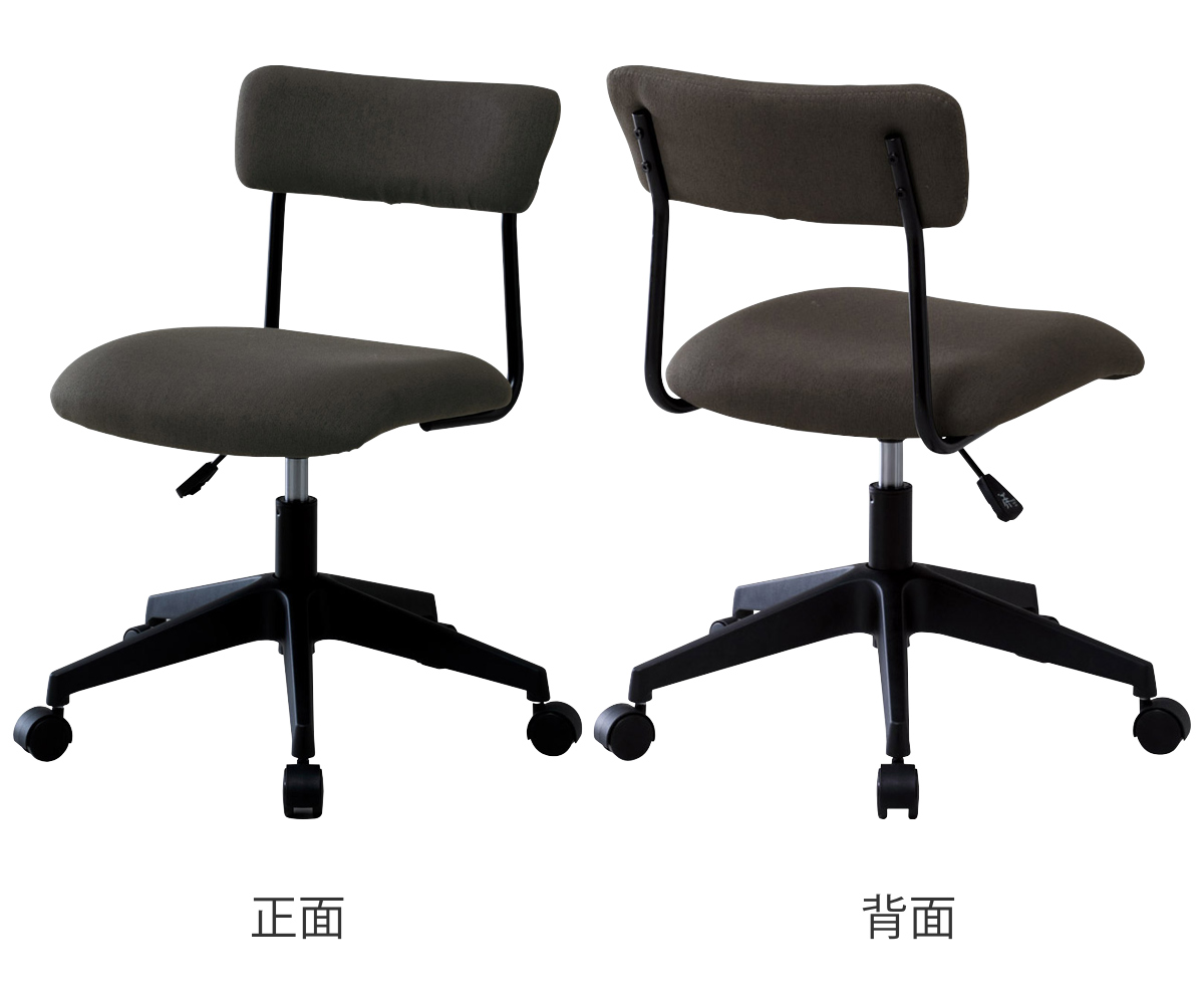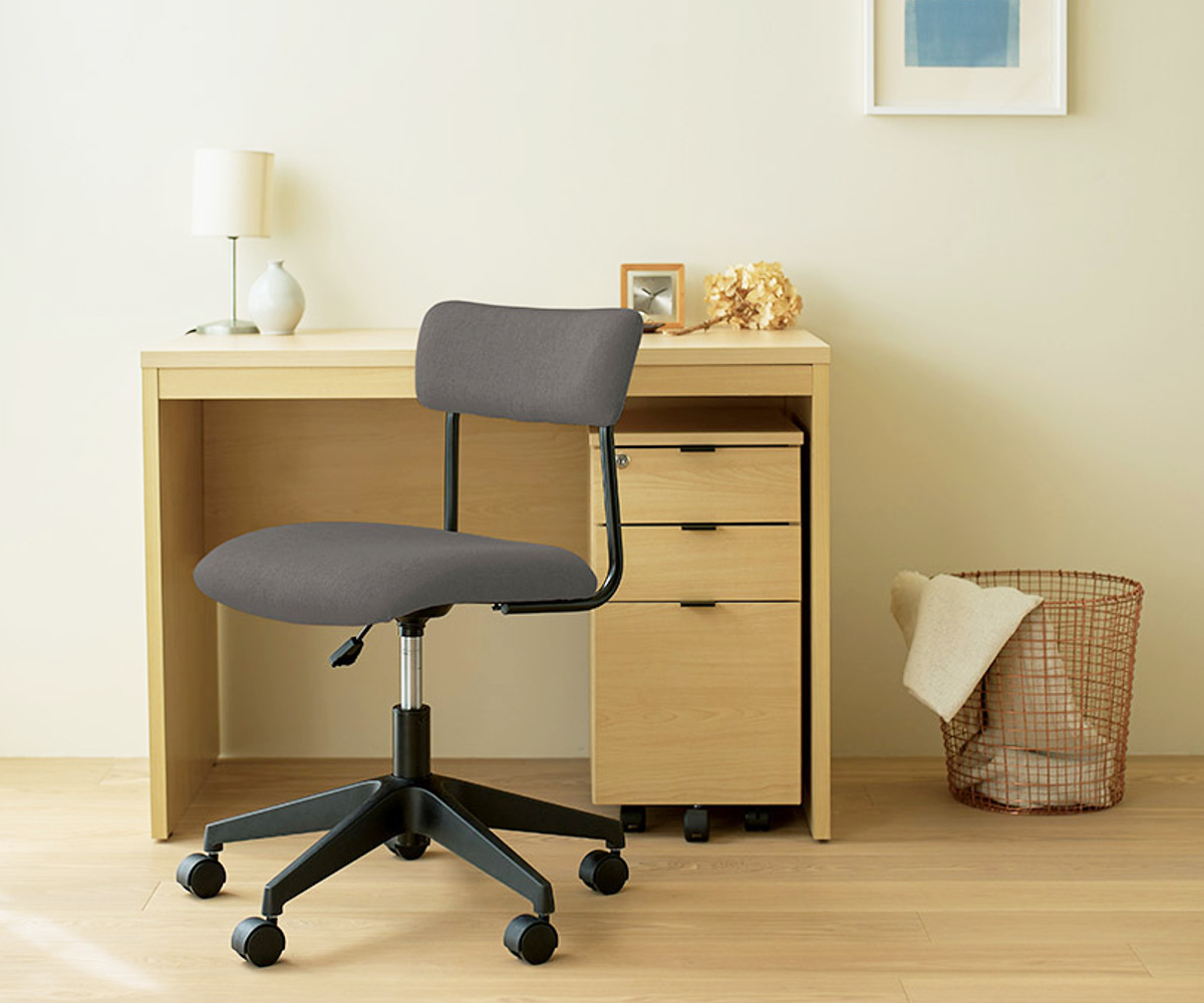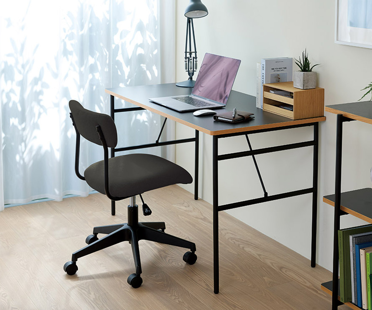 ワイドな背もたれを、抜け感のある細身のブラックフレームで支えた、軽快でスタイリッシュな昇降式ワークチェアです。張地には、織りの細かいシンプルな質感のファブリックを使用しており、インテリアのテイストを選ばず、さまざまなお部屋に自然になじみます。