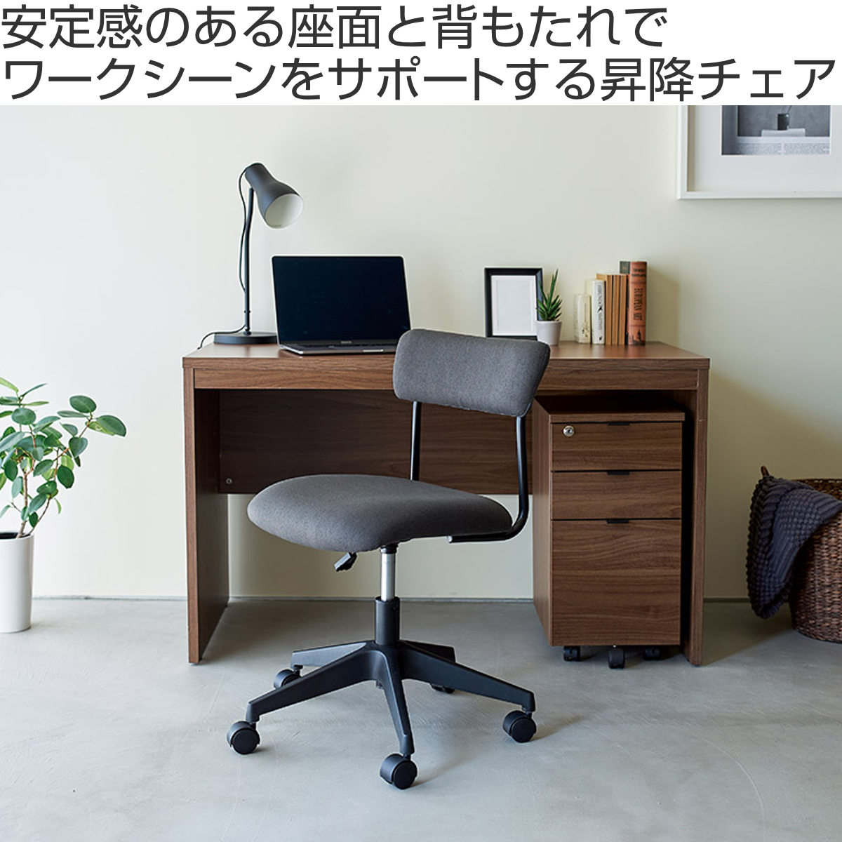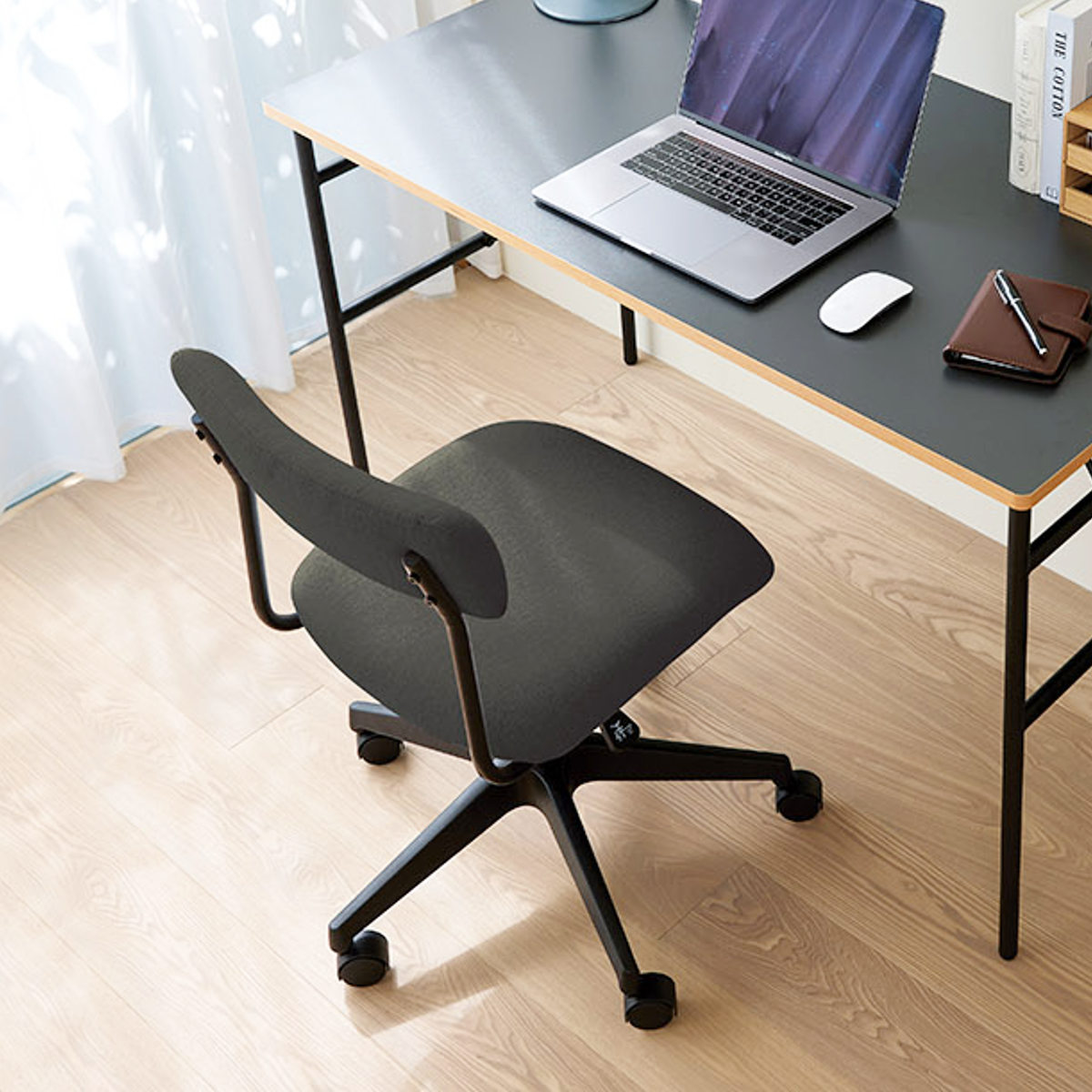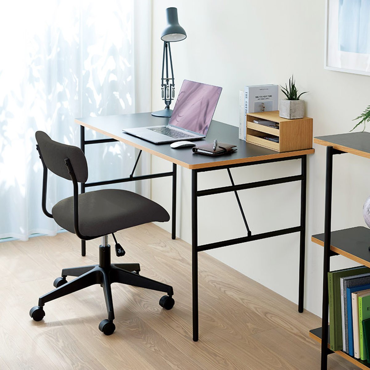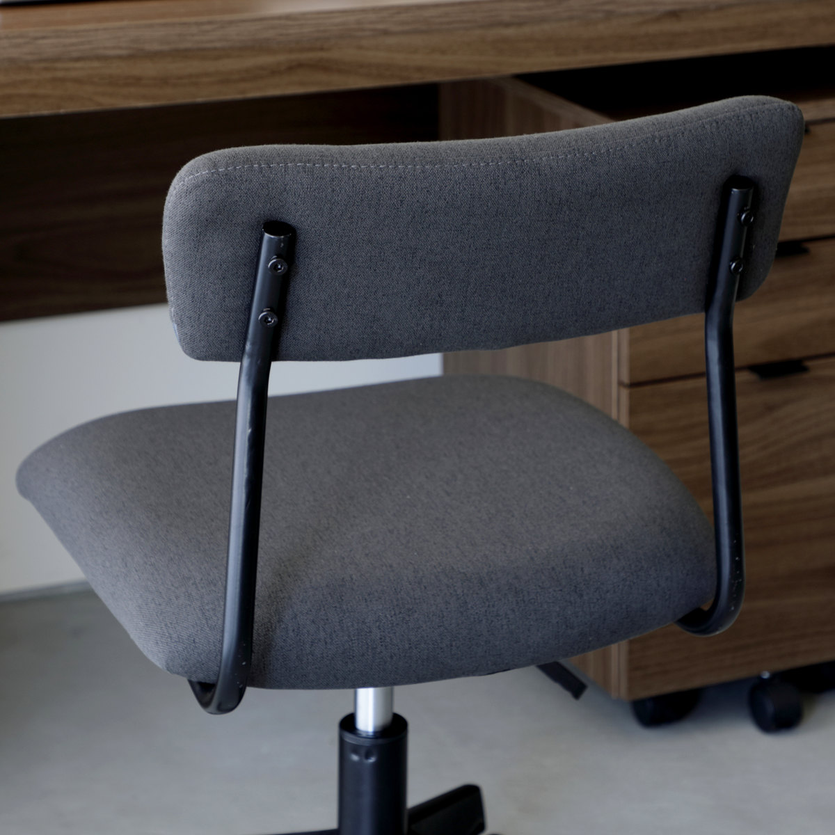 ワイドな背もたれを、抜け感のある細身のブラックフレームで支えた、軽快でスタイリッシュな昇降式ワークチェアです。張地には、織りの細かいシンプルな質感のファブリックを使用しており、インテリアのテイストを選ばず、さまざまなお部屋に自然になじみます。